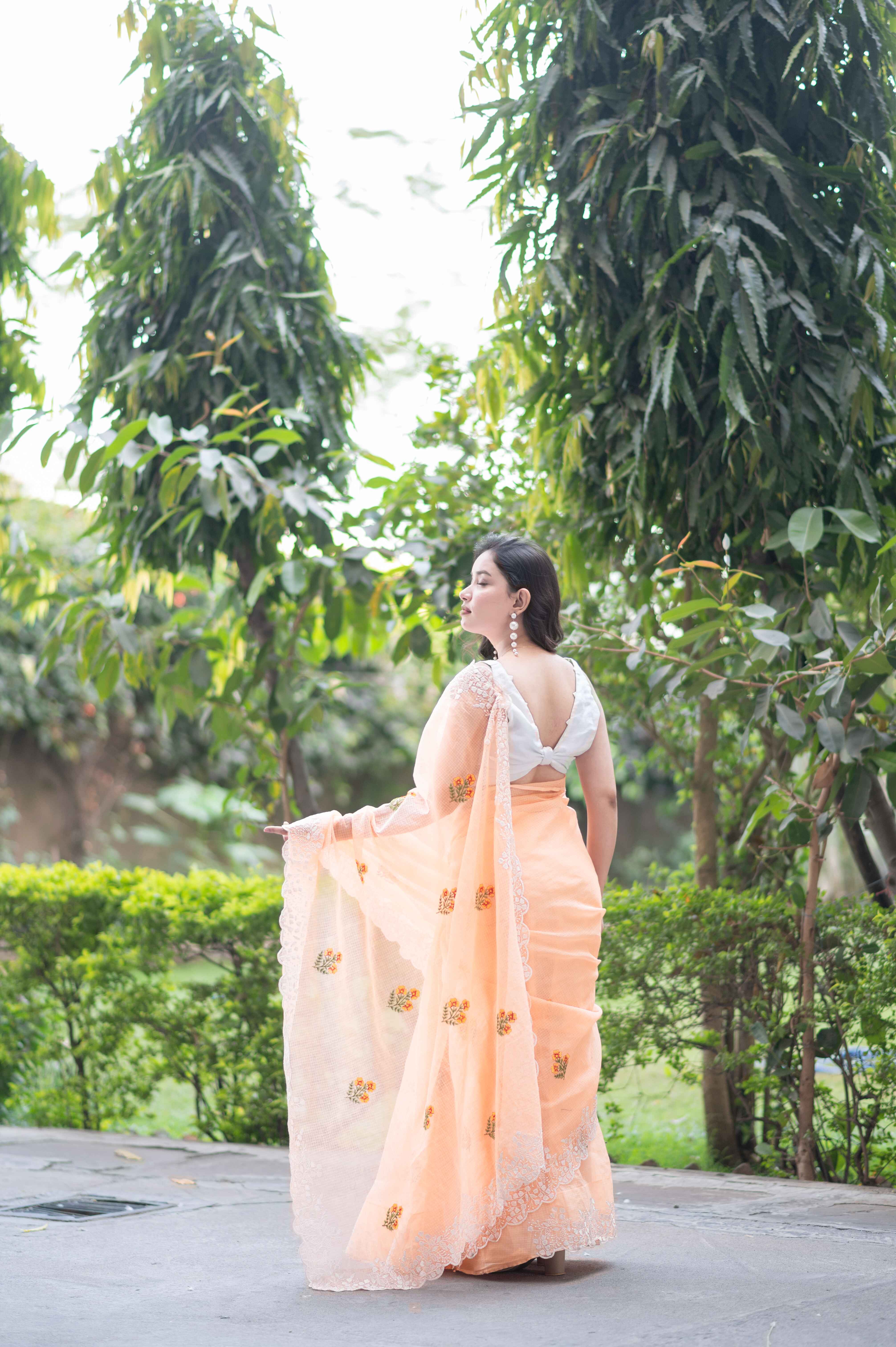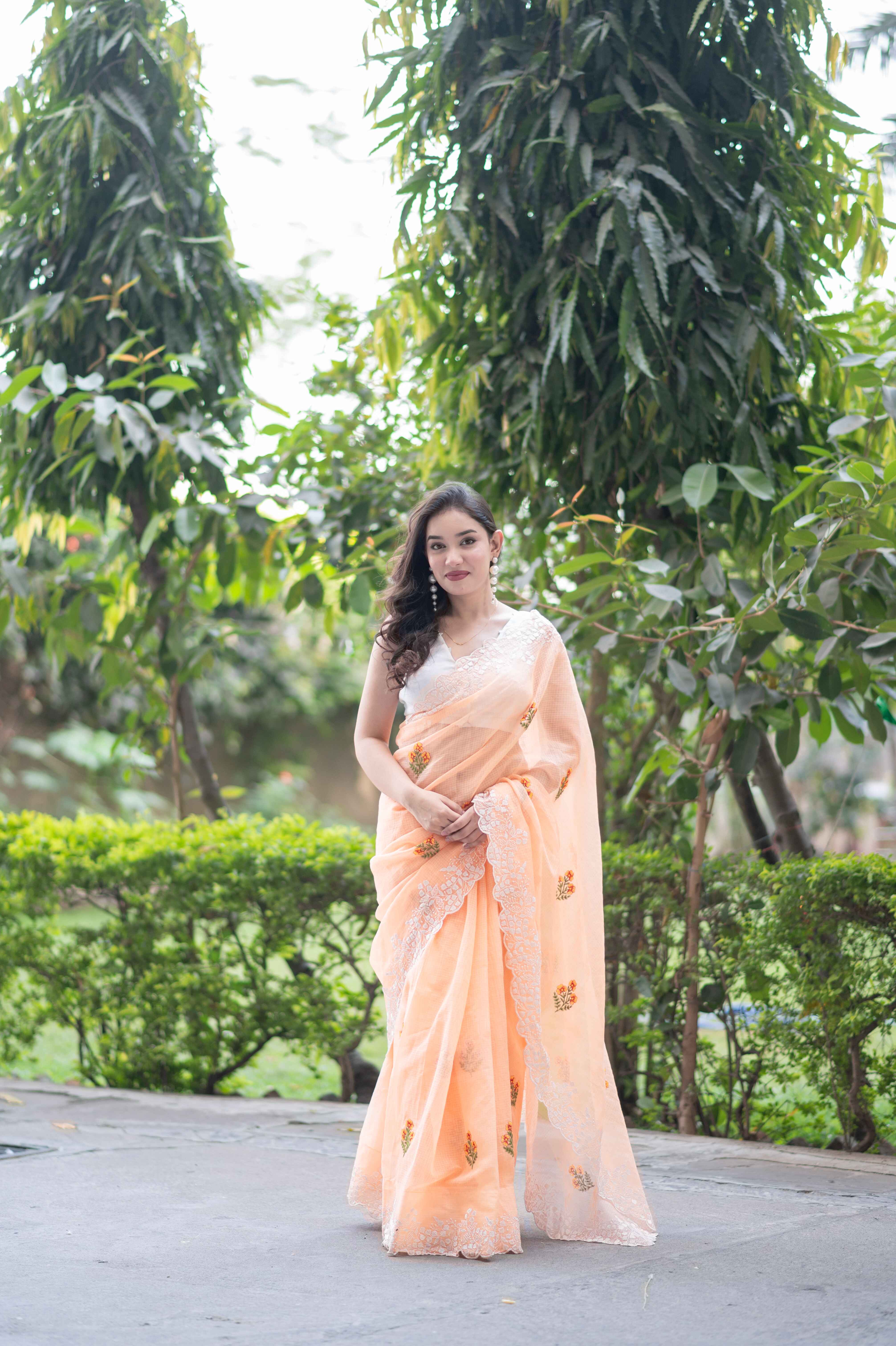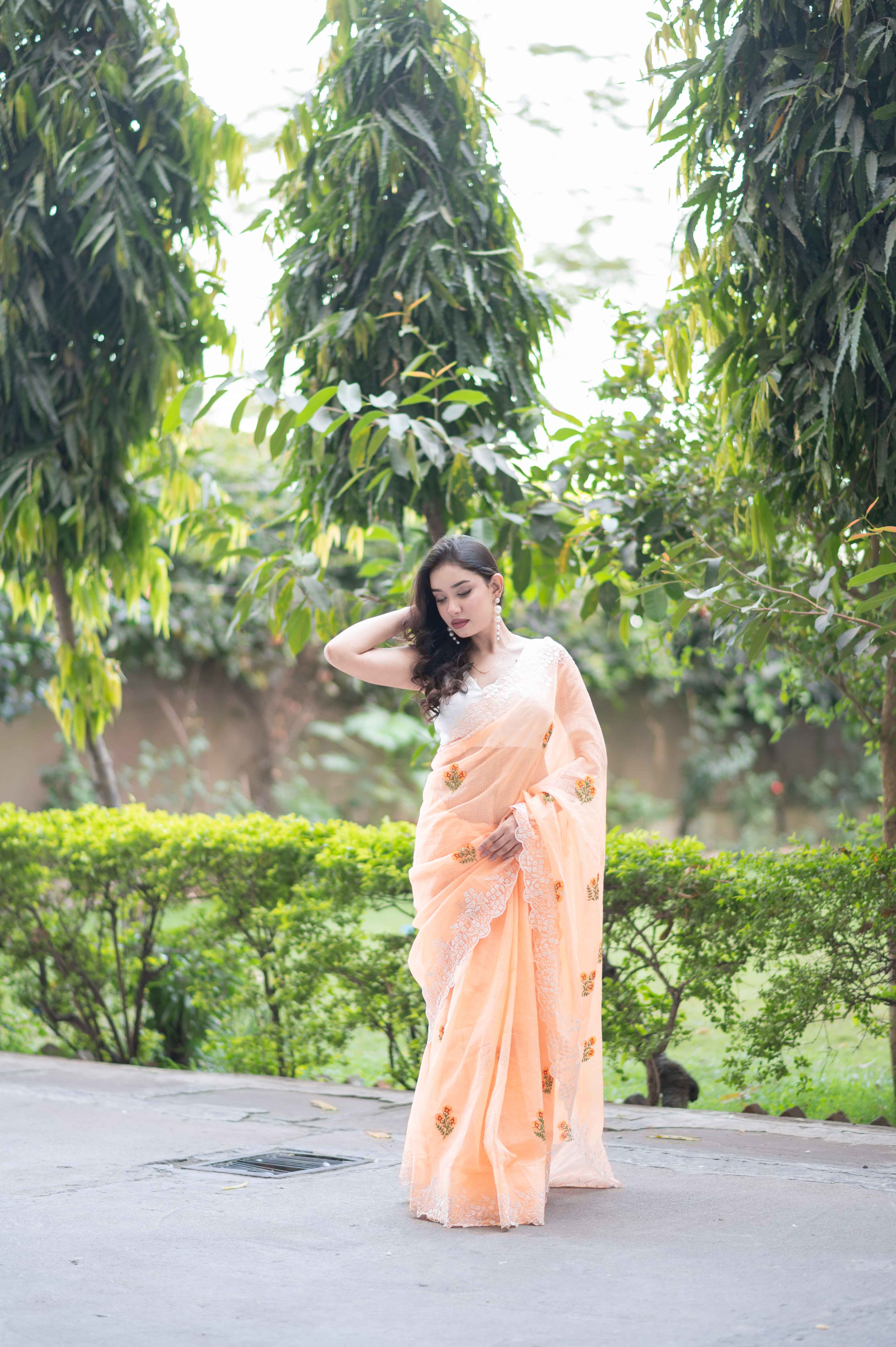 Add this elegant Peach Petal Embroidered Kota Doria Saree to your collection today and embrace timeless fashion.