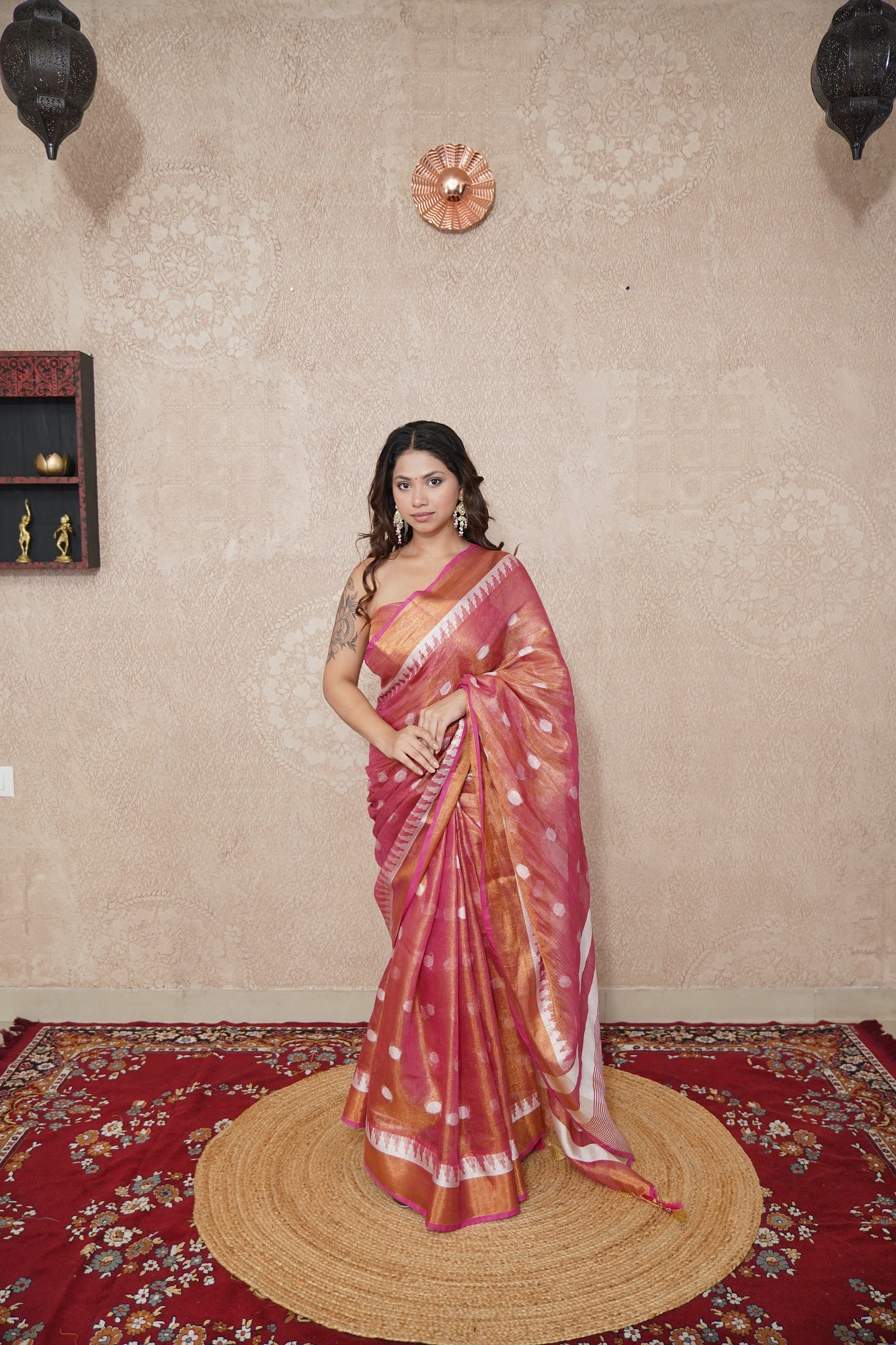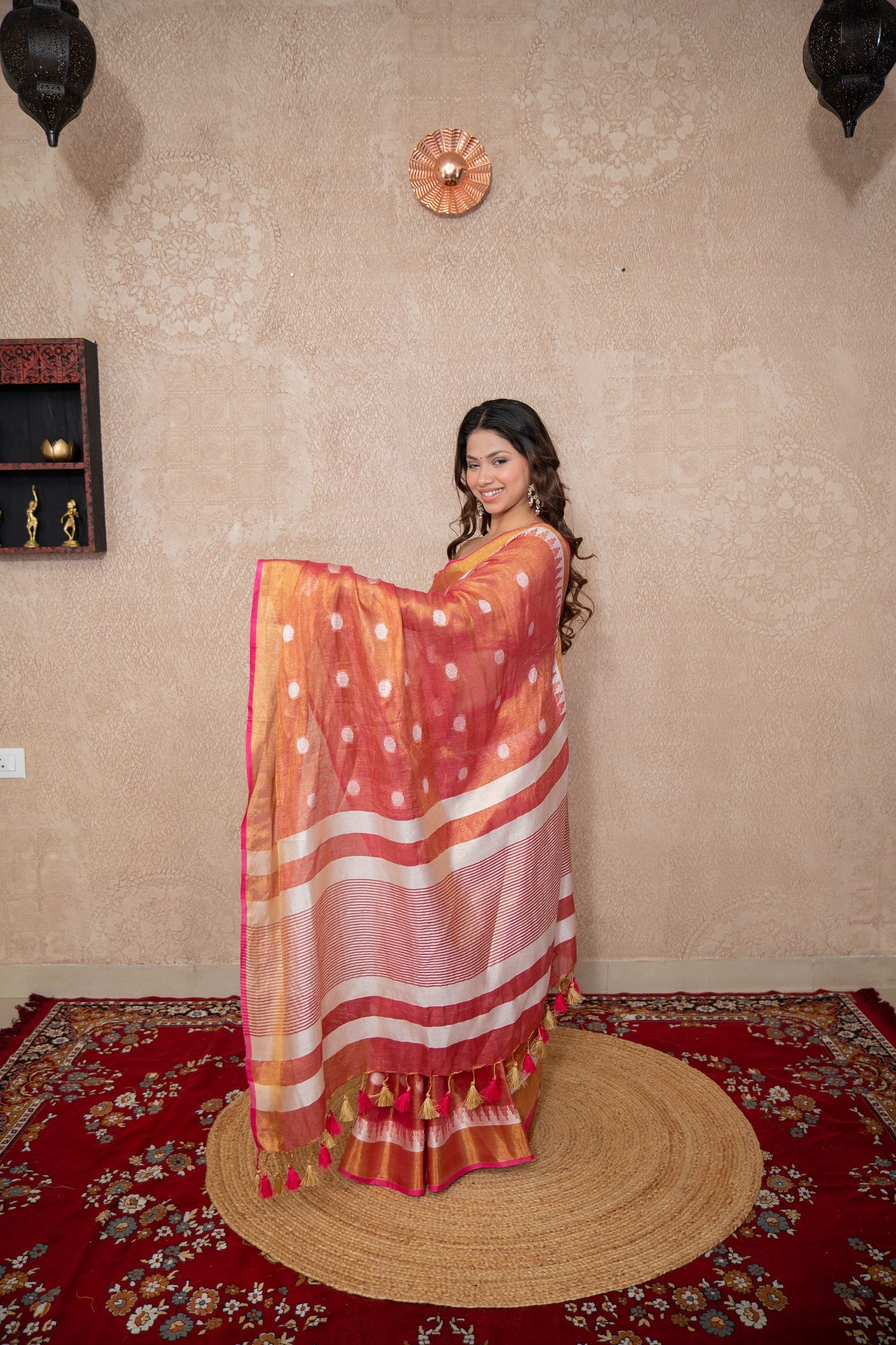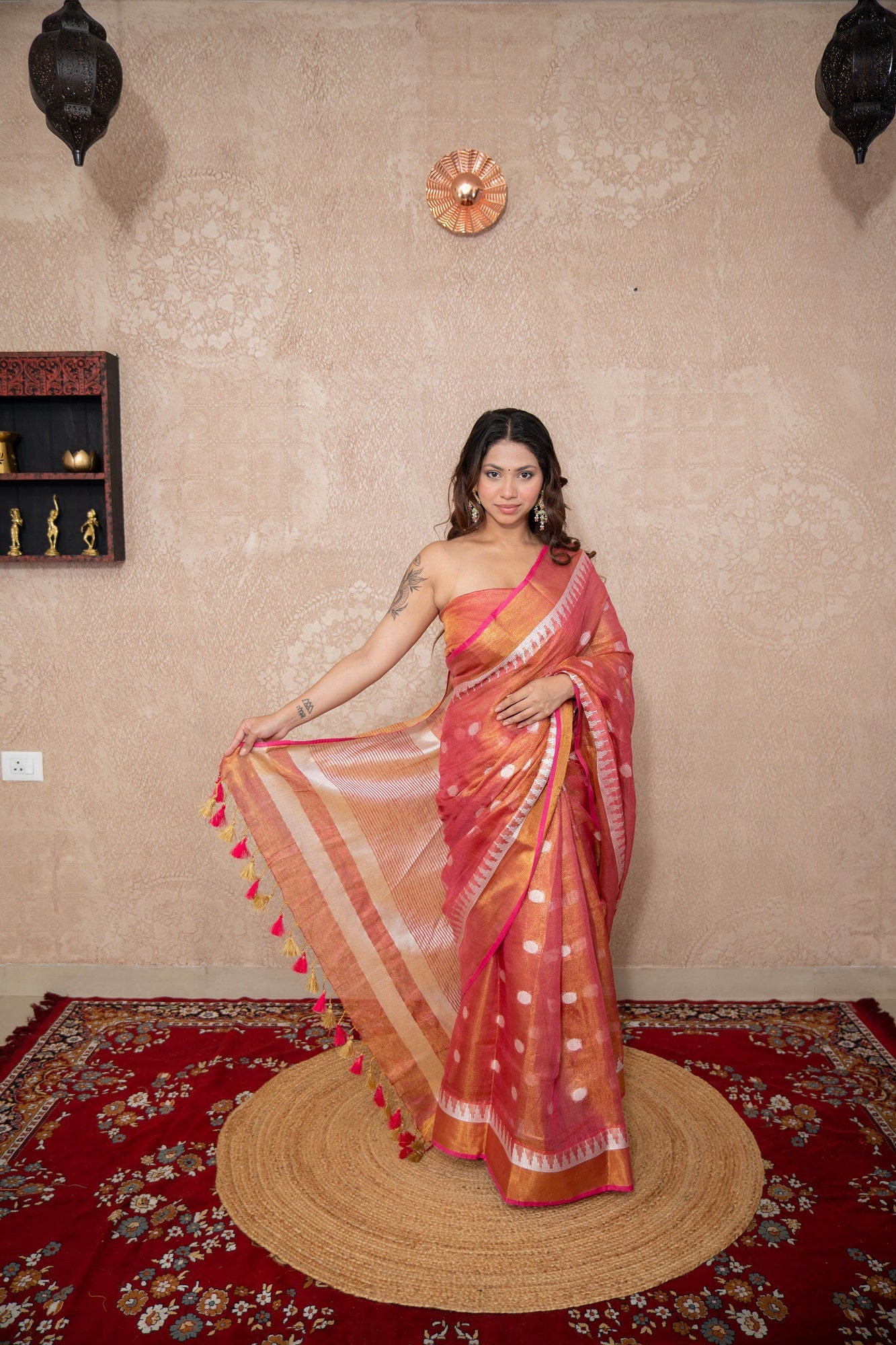 Step into elegance with Pink Glow, a radiant Pink Zari Linen Saree that captures the spirit of grace and festivity. A highlight of our exclusive "Sone ki Abha" collection, this saree brings together soft femininity and artisanal charm—perfect for weddings, festive gatherings, or special celebrations.