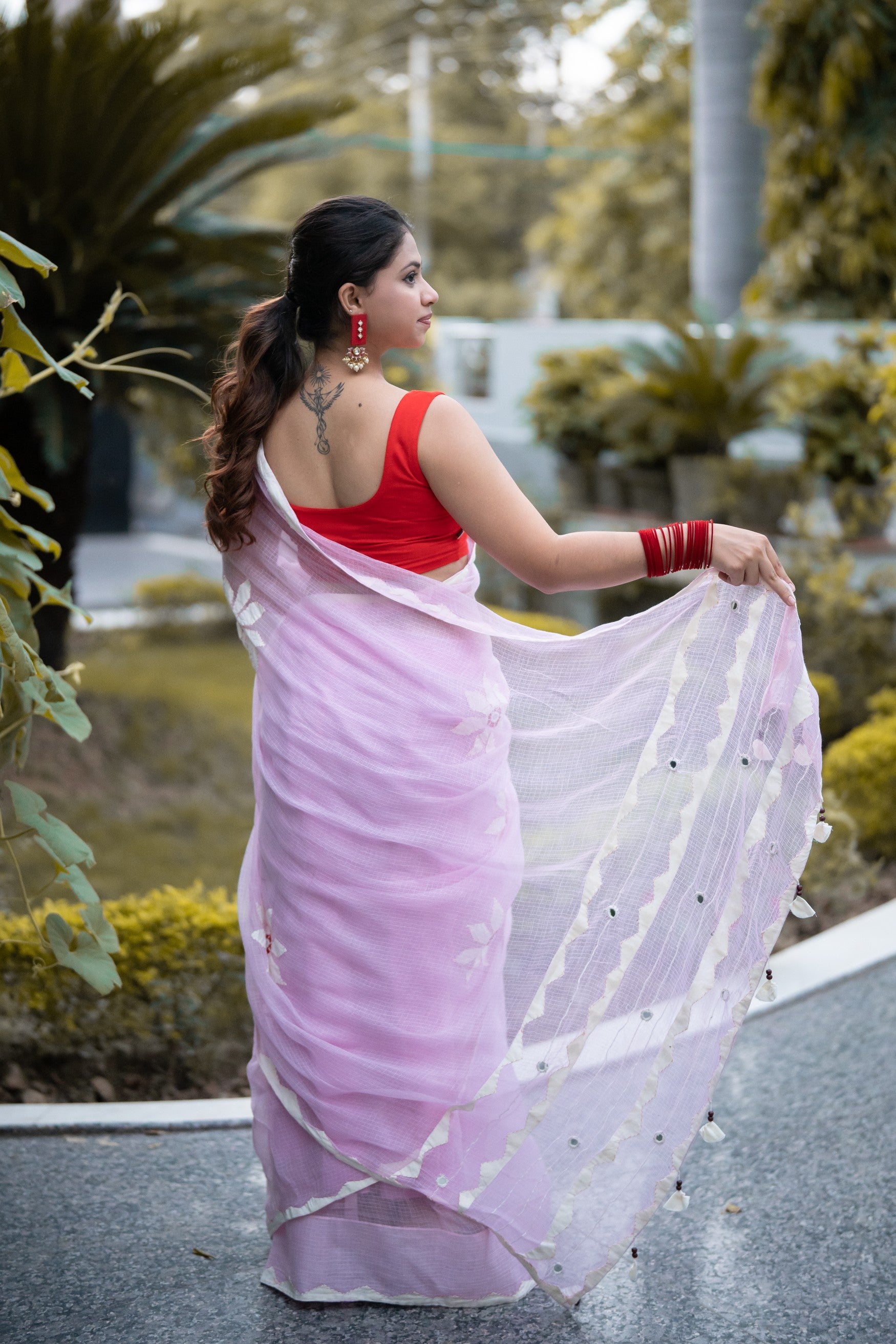 Discover timeless elegance with Anaisha, an exquisite light pink Kota Doria saree from our exclusive Avyakta Collection. Featuring intricate white floral applique work and delicate red thread embroidery, this saree is entirely handcrafted, making it a perfect blend of tradition and modern style. Whether for festive occasions, weddings, or celebrations, this saree is designed to make you stand out effortlessly.