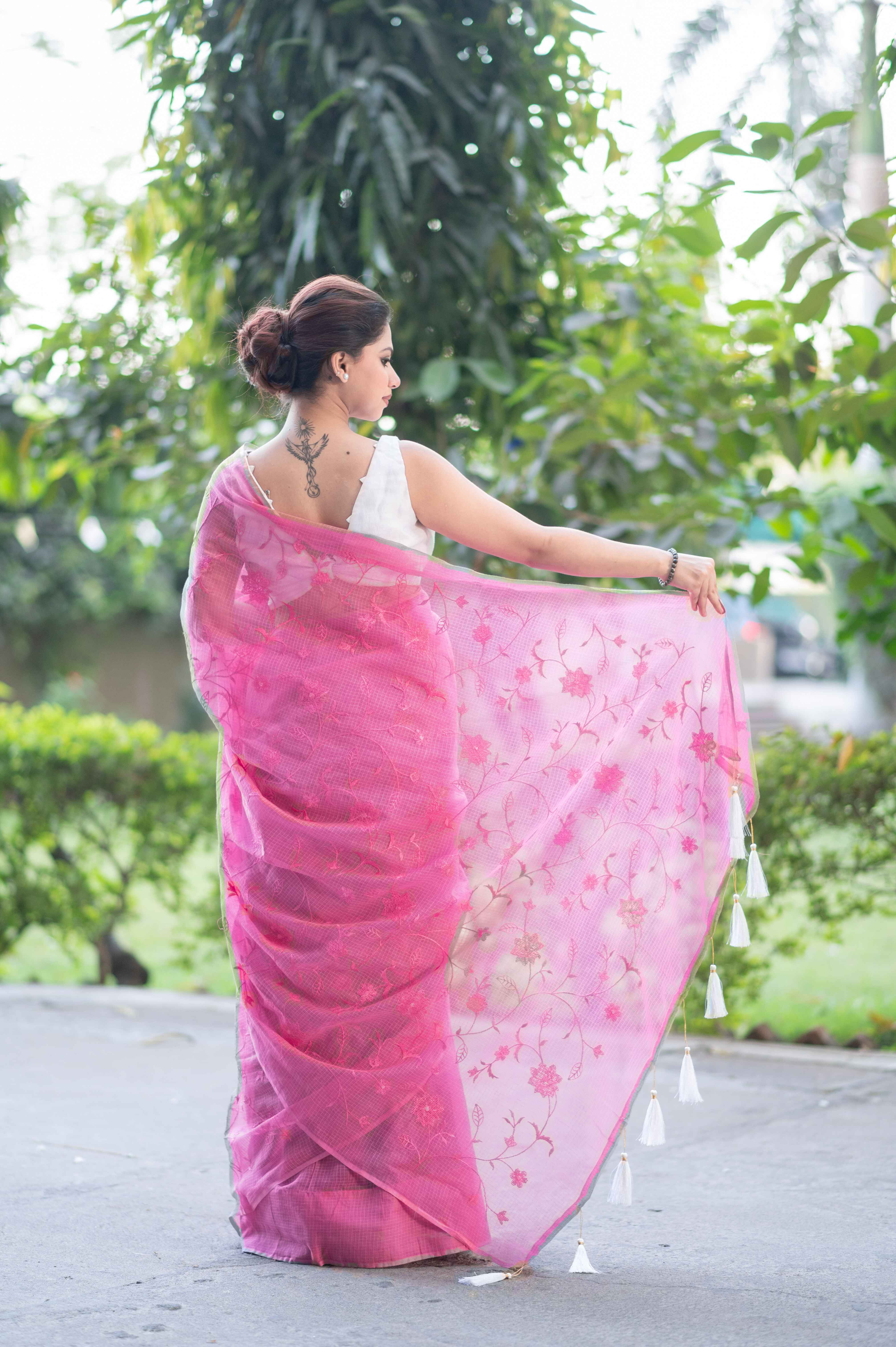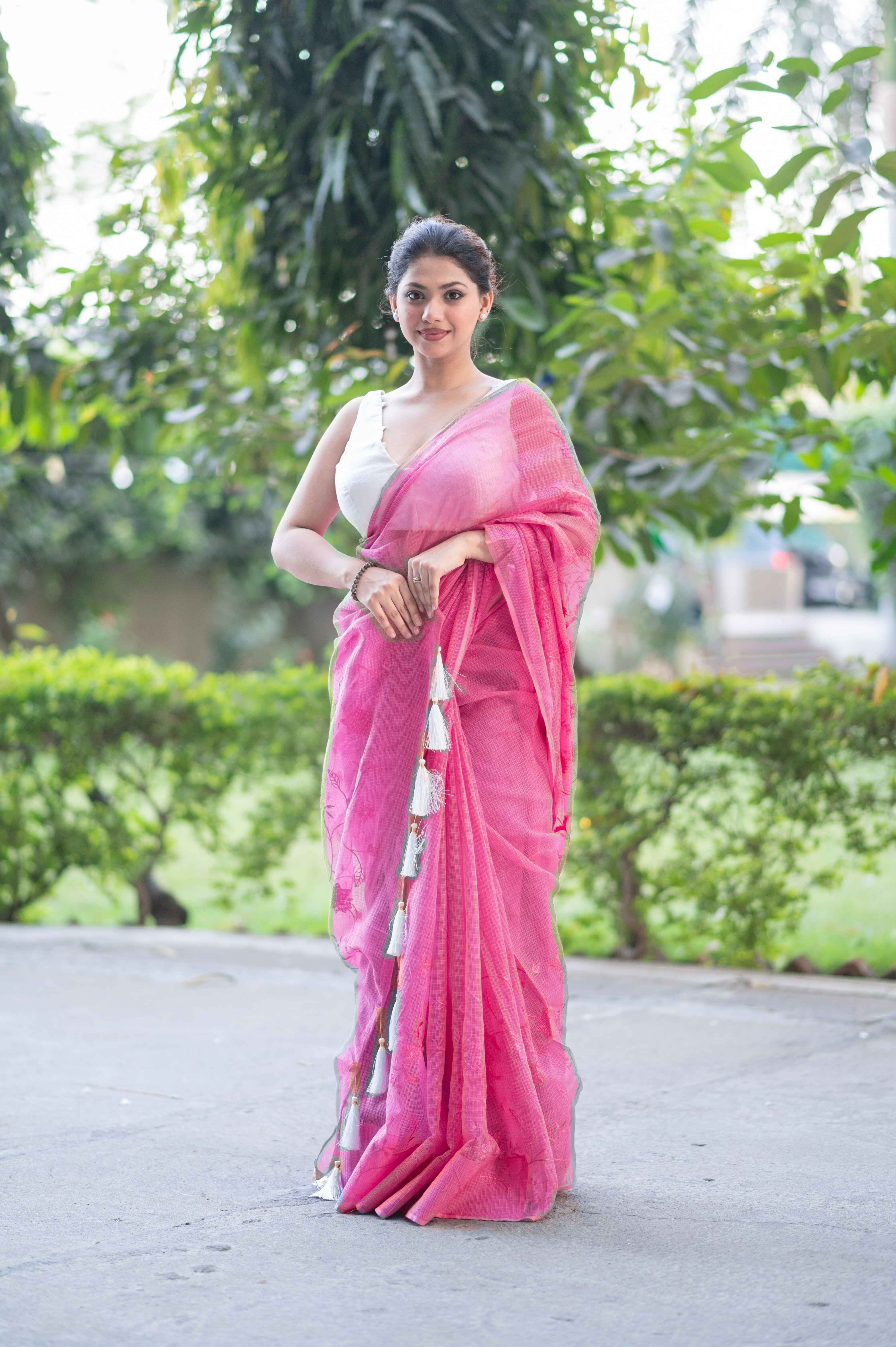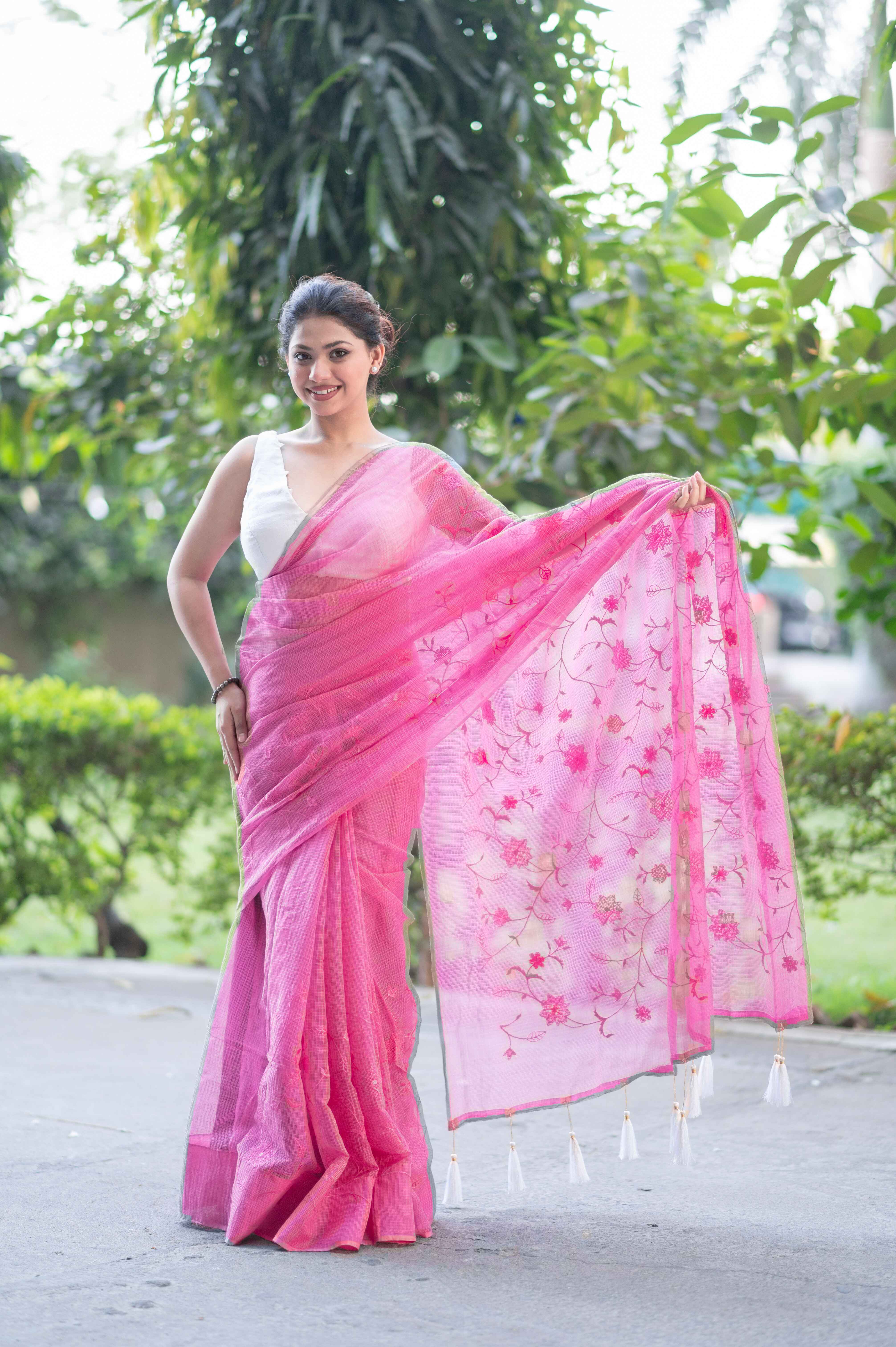 Introducing our exquisite Pink Whisper Kota Doria Saree, adorned with intricate embroidery on the bottom and pallu. Crafted from the finest cotton, this saree epitomizes elegance and grace.