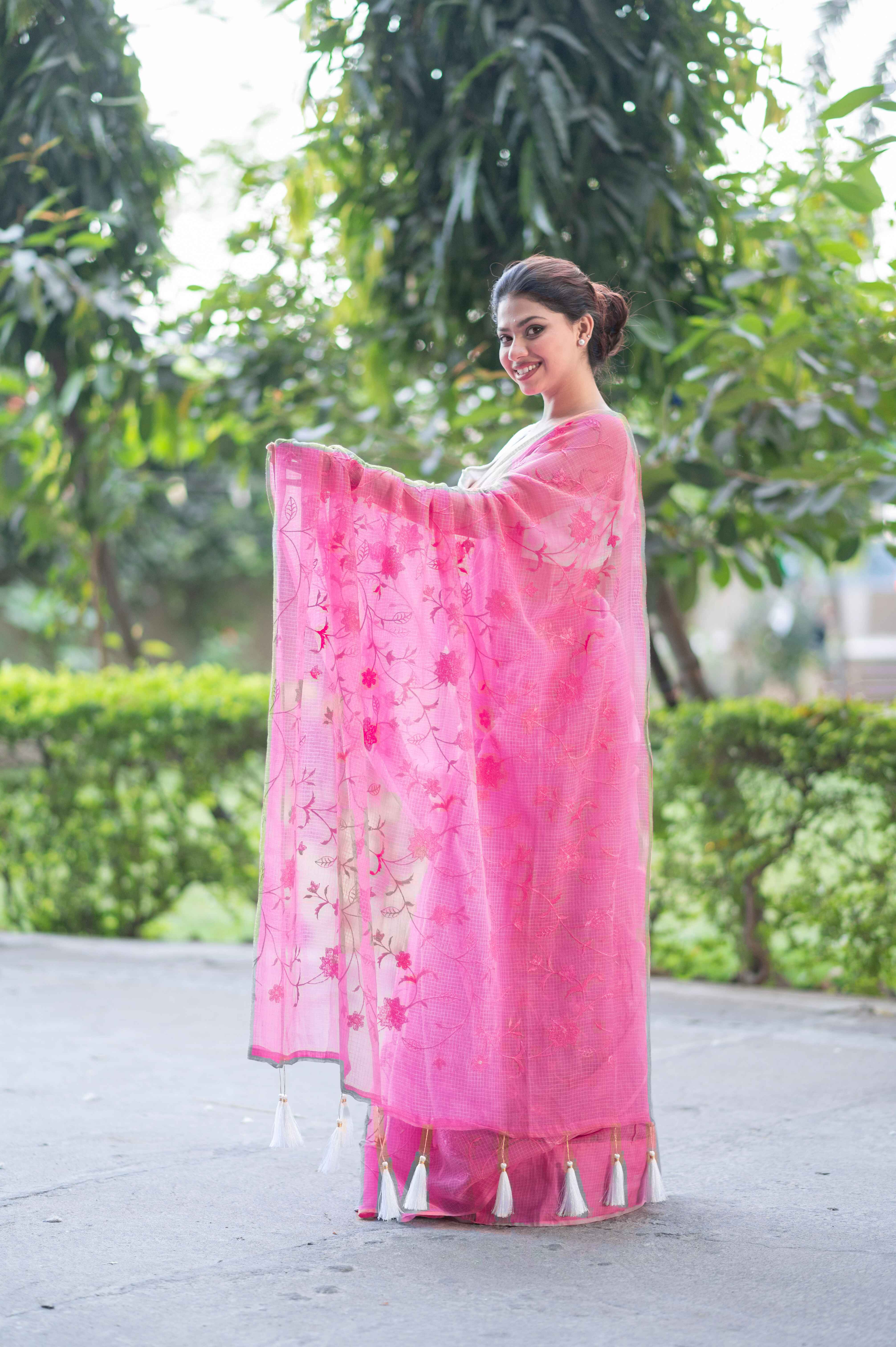 Elevate your wardrobe with the Pink Whisper Kota Doria Saree, a testament to craftsmanship and style. Embrace tradition with a modern twist, making a statement wherever you go.