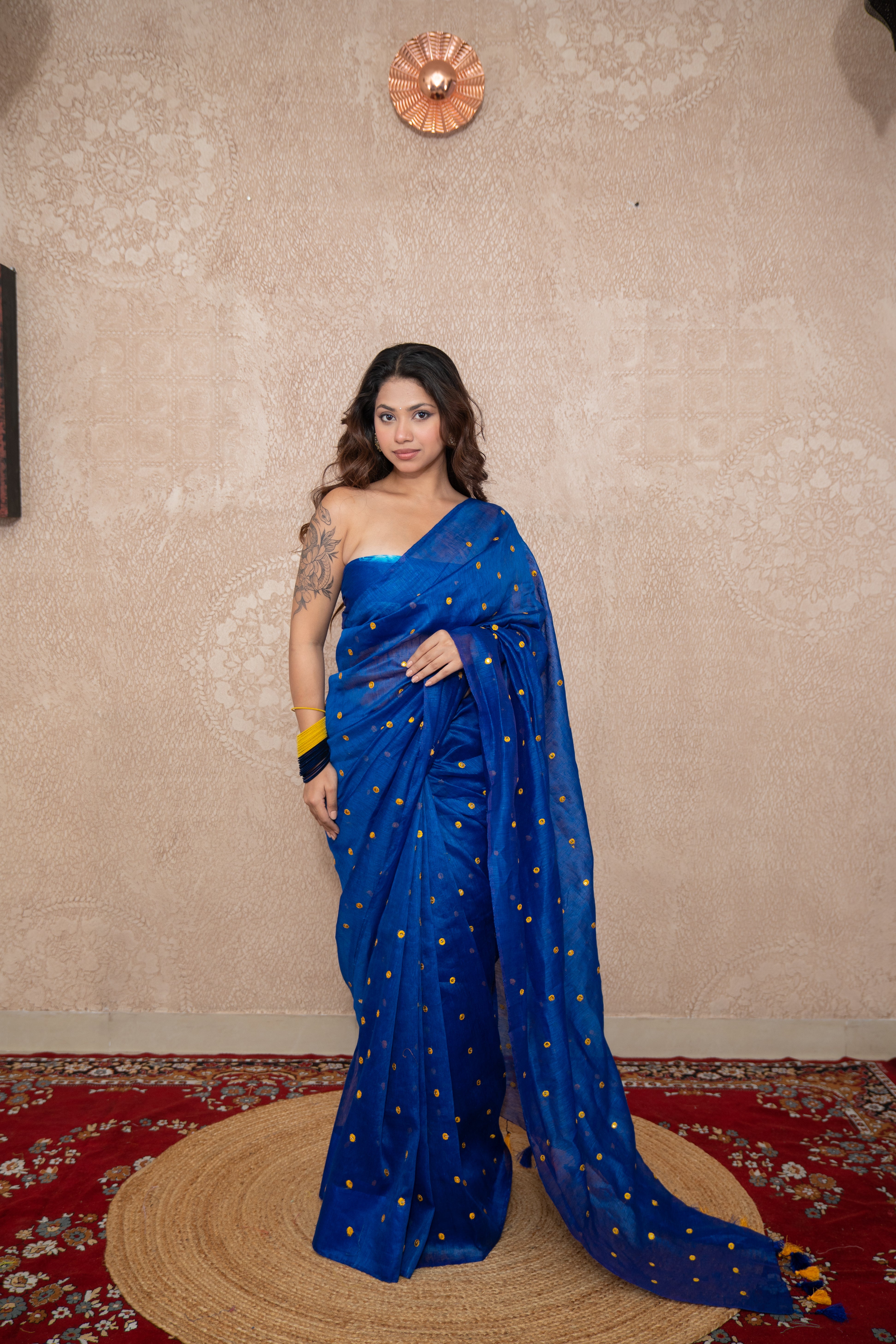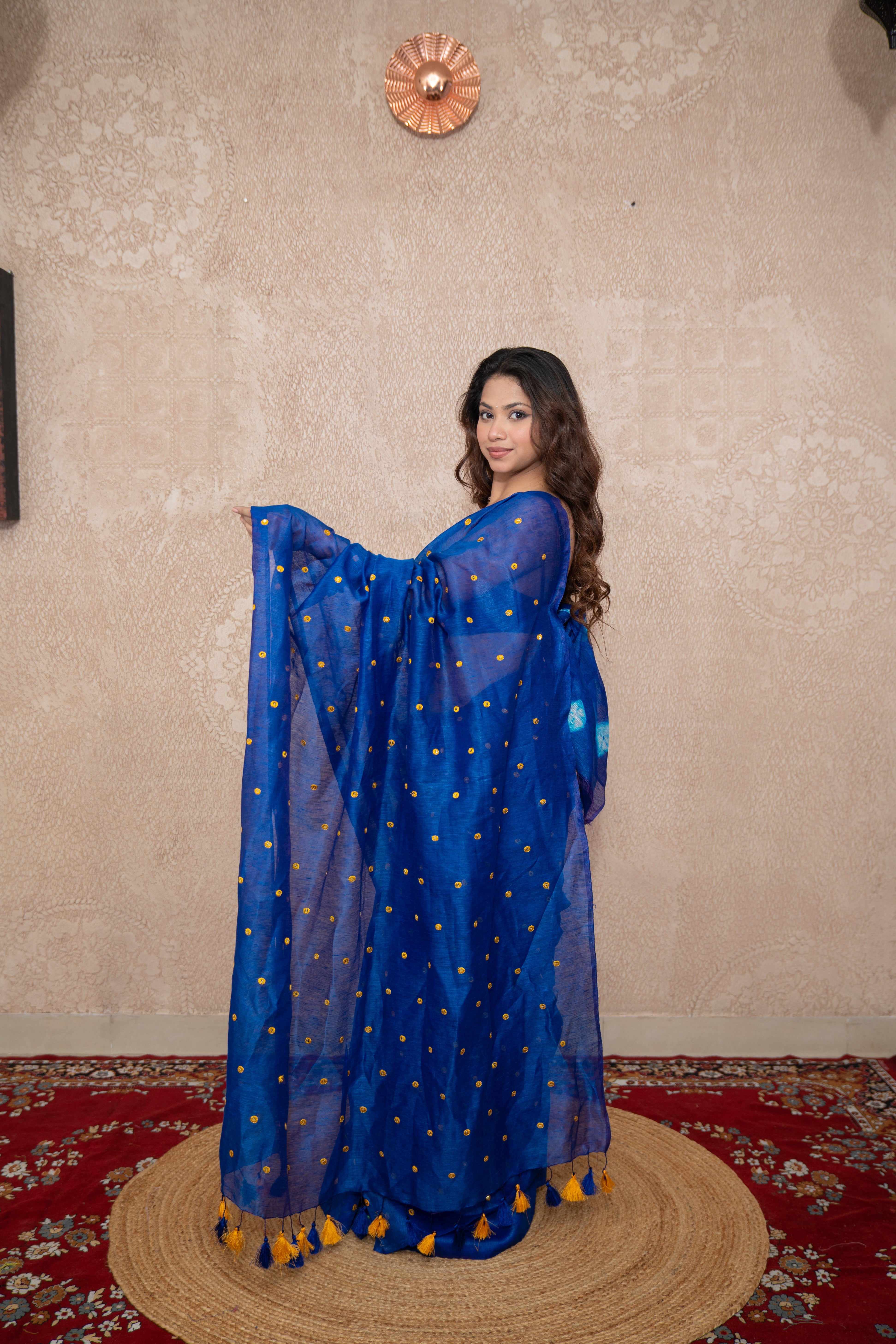 Elevate your ethnic wardrobe with Pranaya, a stunning blue Tikli work saree crafted from pure silk linen fabric. This elegant piece combines timeless craftsmanship with contemporary charm, making it the perfect choice for special occasions, festive gatherings, or weddings.