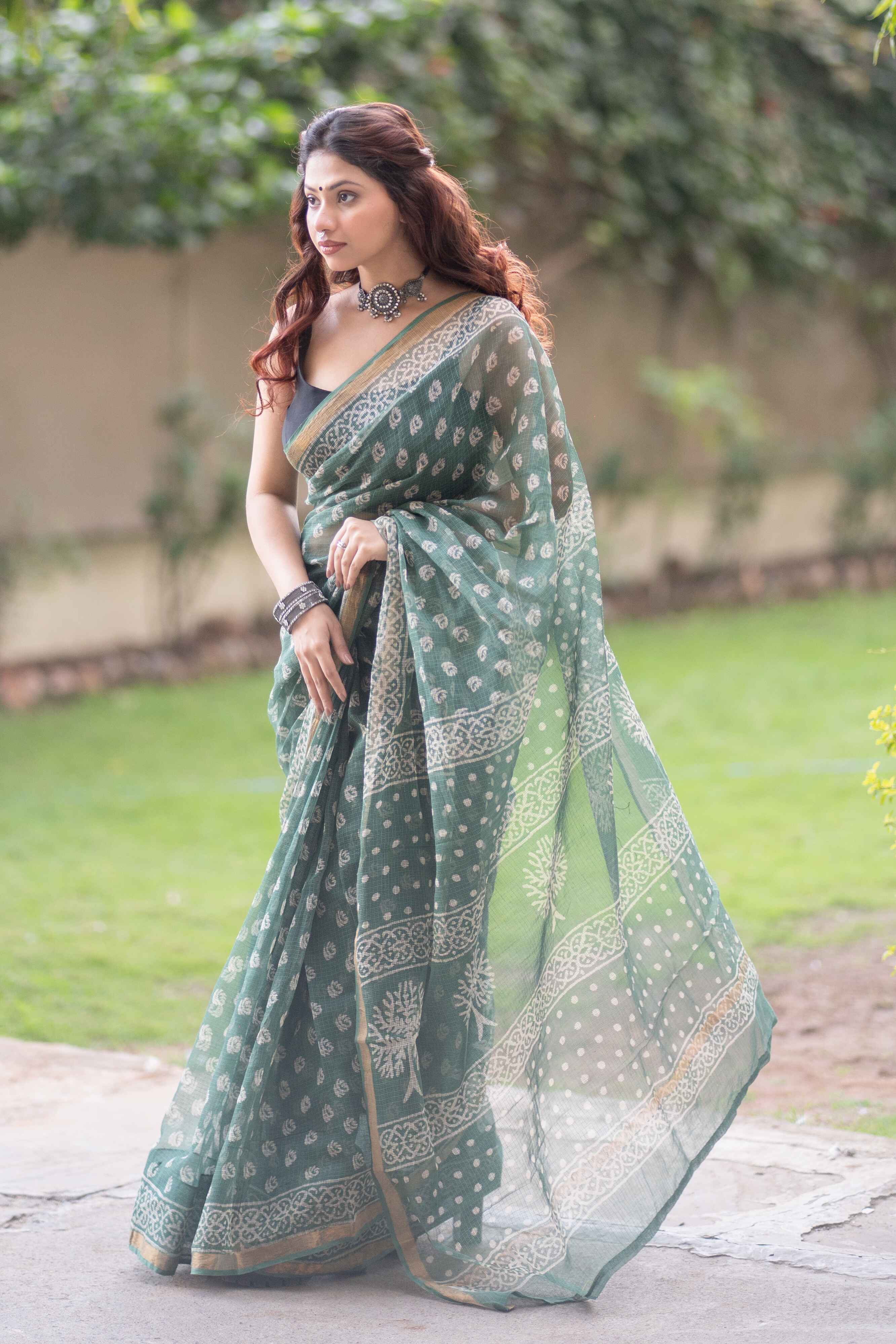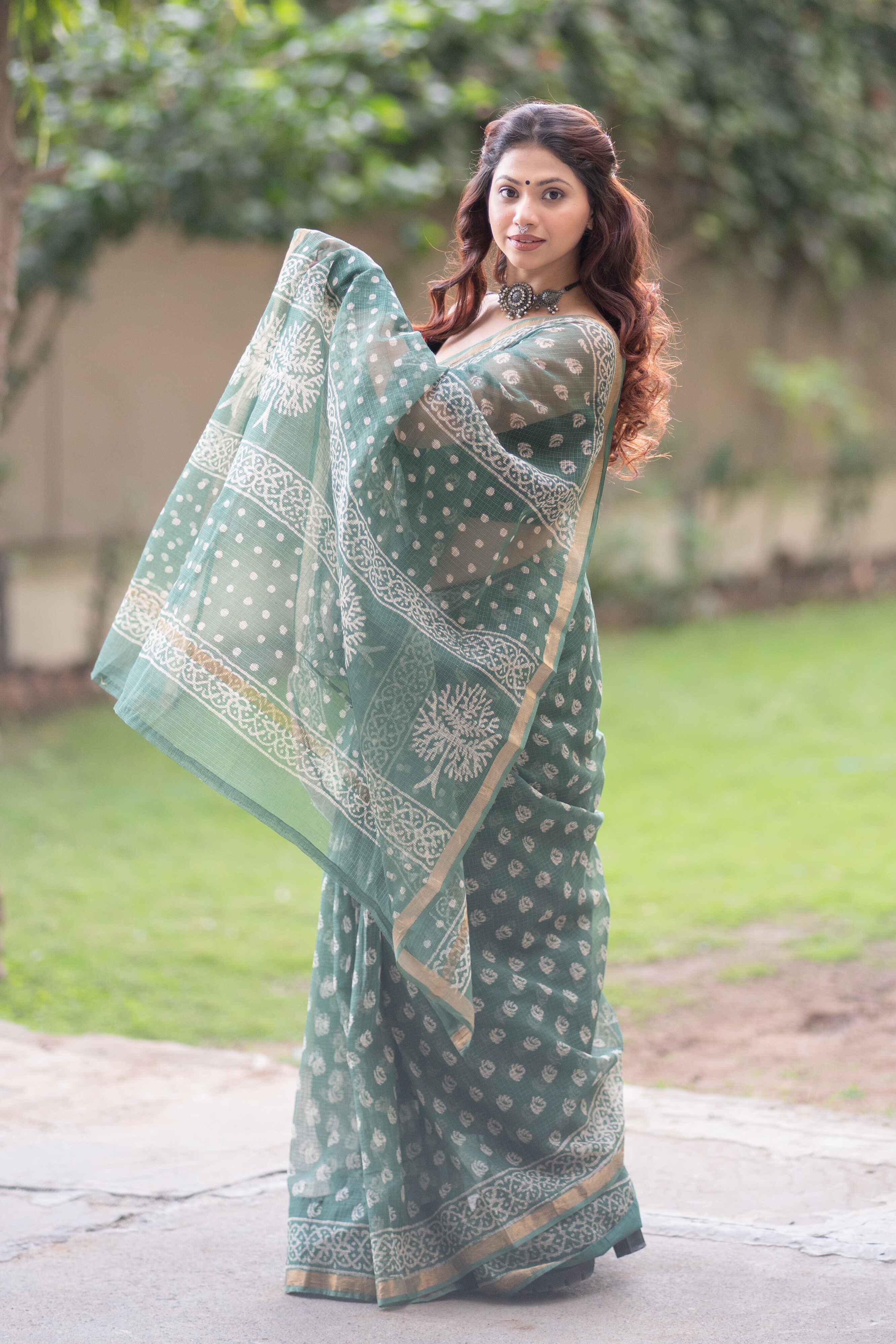 Drape yourself in the understated charm of our Green Kota Doria Saree with White Block Print, a perfect harmony of heritage craftsmanship and modern grace. Designed exclusively by Pravihini, this saree is a must-have for those who adore lightweight yet elegant drapes that celebrate tradition with a contemporary touch.