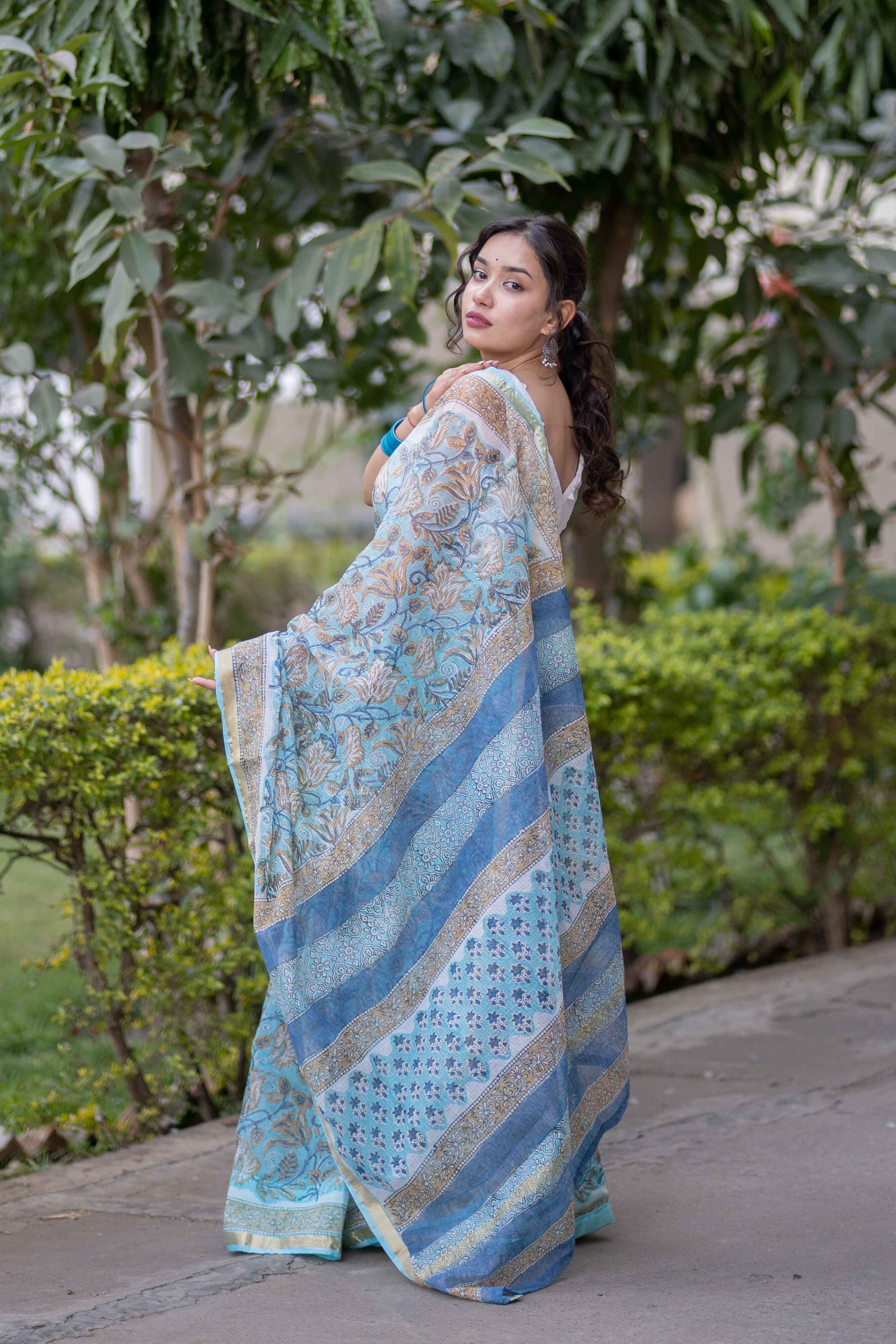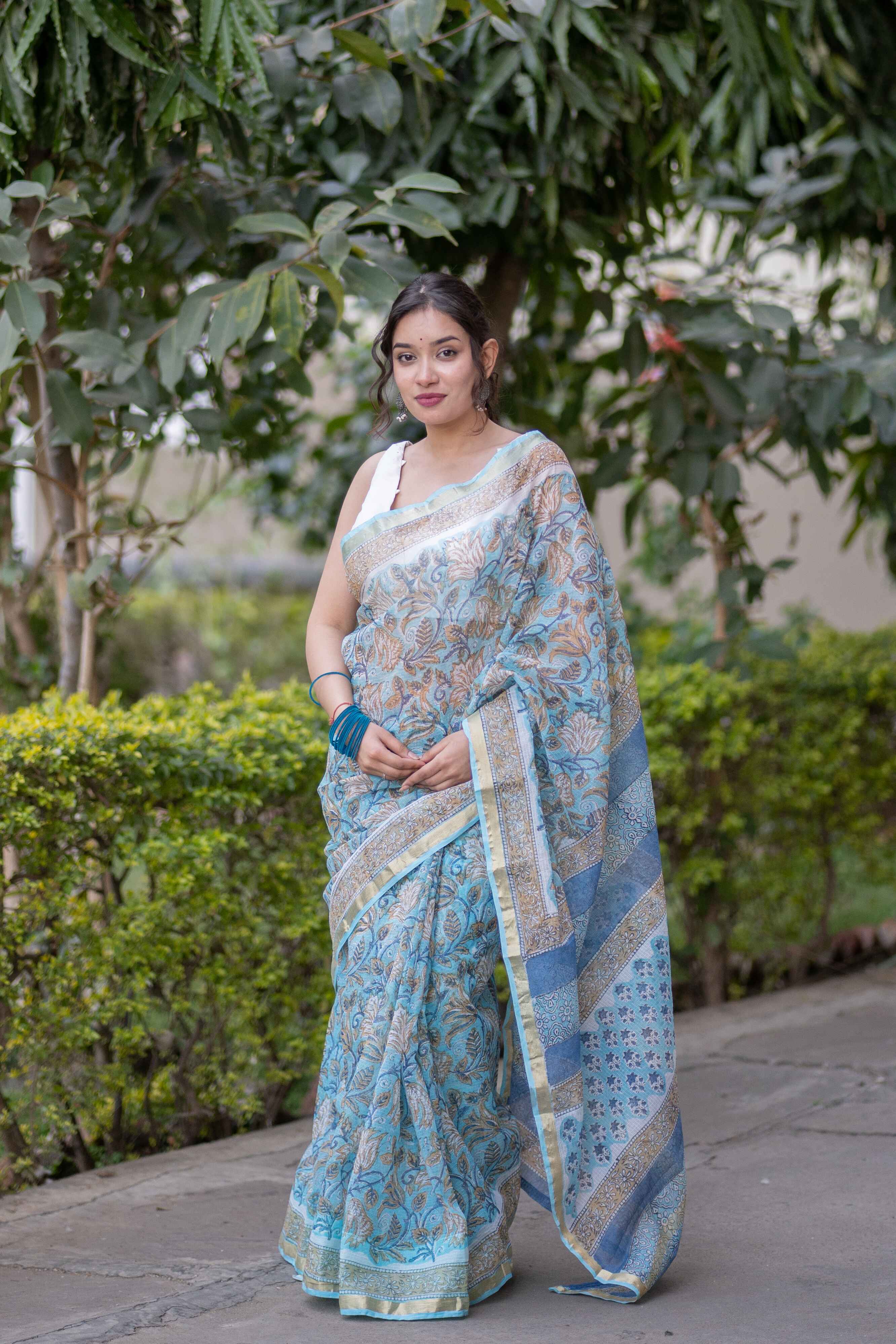 Crafted from premium Kota Doria, this saree is renowned for its lightweight, airy texture and subtle transparency, ensuring comfort without compromising on sophistication. The intricate floral print reflects expert artistry, while the woven striped pallu enhances its visual appeal. The saree comes with a matching Kota Doria blouse, completing the ensemble with effortless harmony.