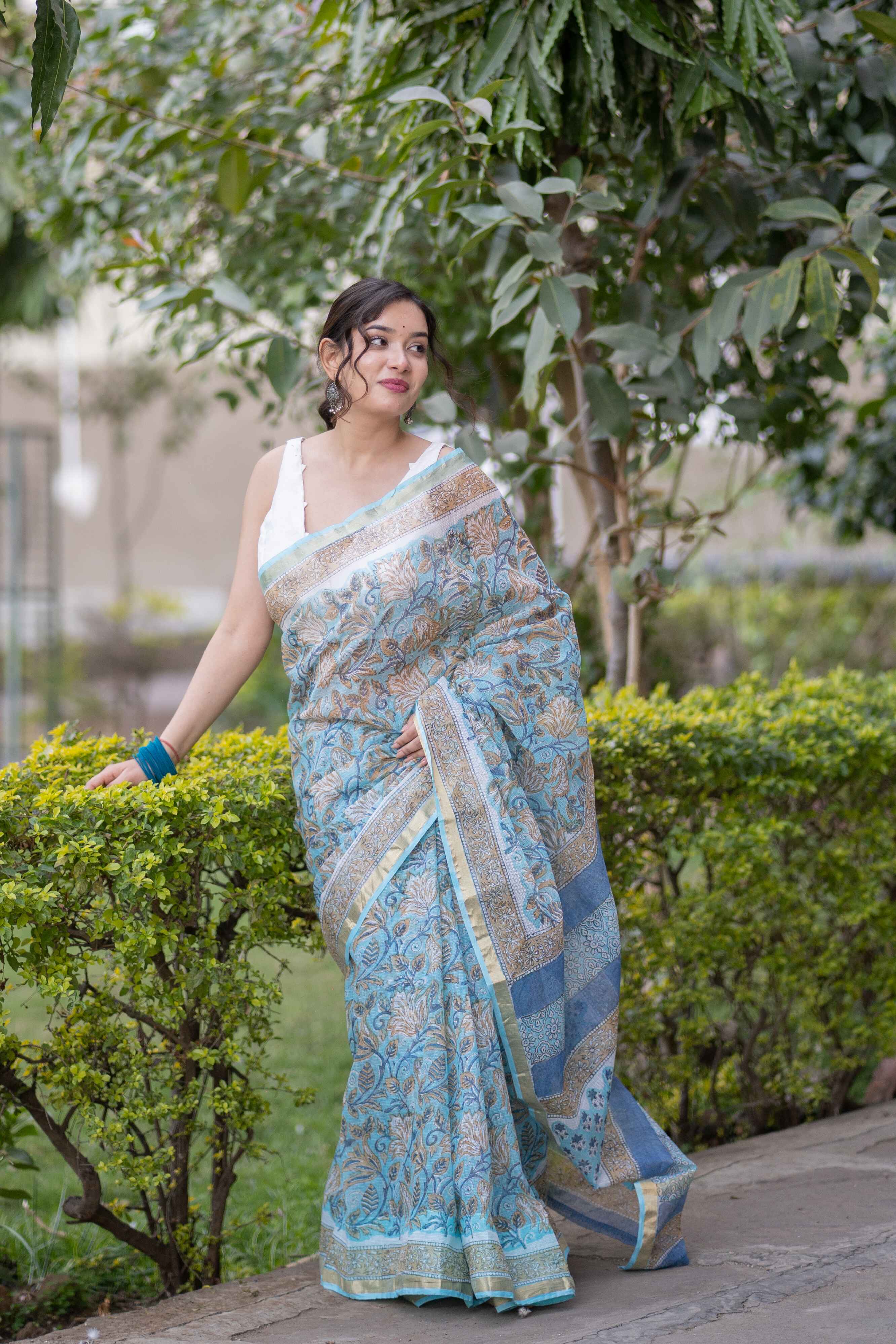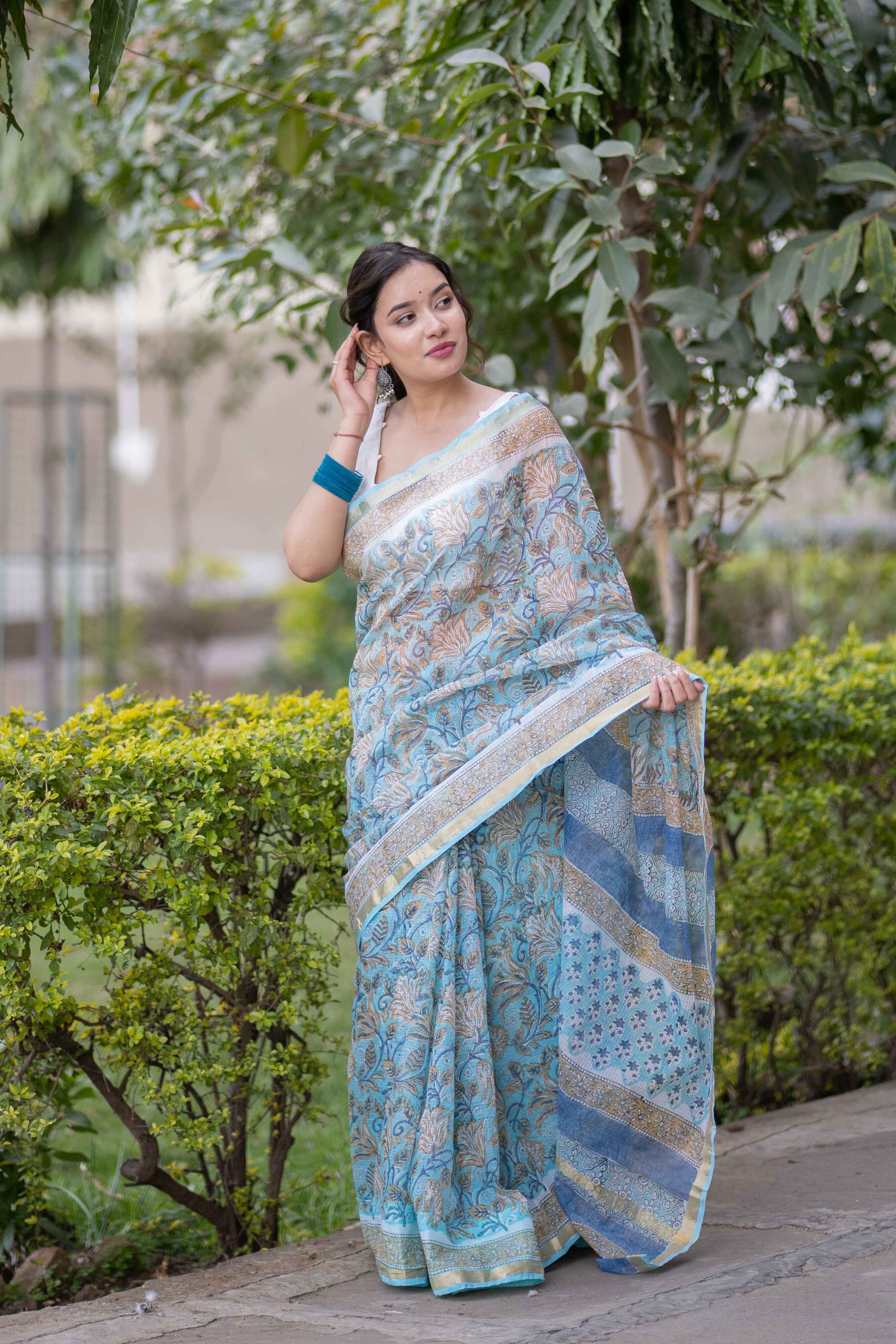 Step into effortless grace with Pushpanjali, a light blue floral print Kota Doria saree that beautifully blends tradition with contemporary charm. Designed exclusively for our Ashi collection, this saree is a tribute to timeless craftsmanship, featuring delicate floral motifs that exude femininity and grace. The striped pallu adds a subtle contrast, making it a perfect choice for casual elegance or special gatherings.