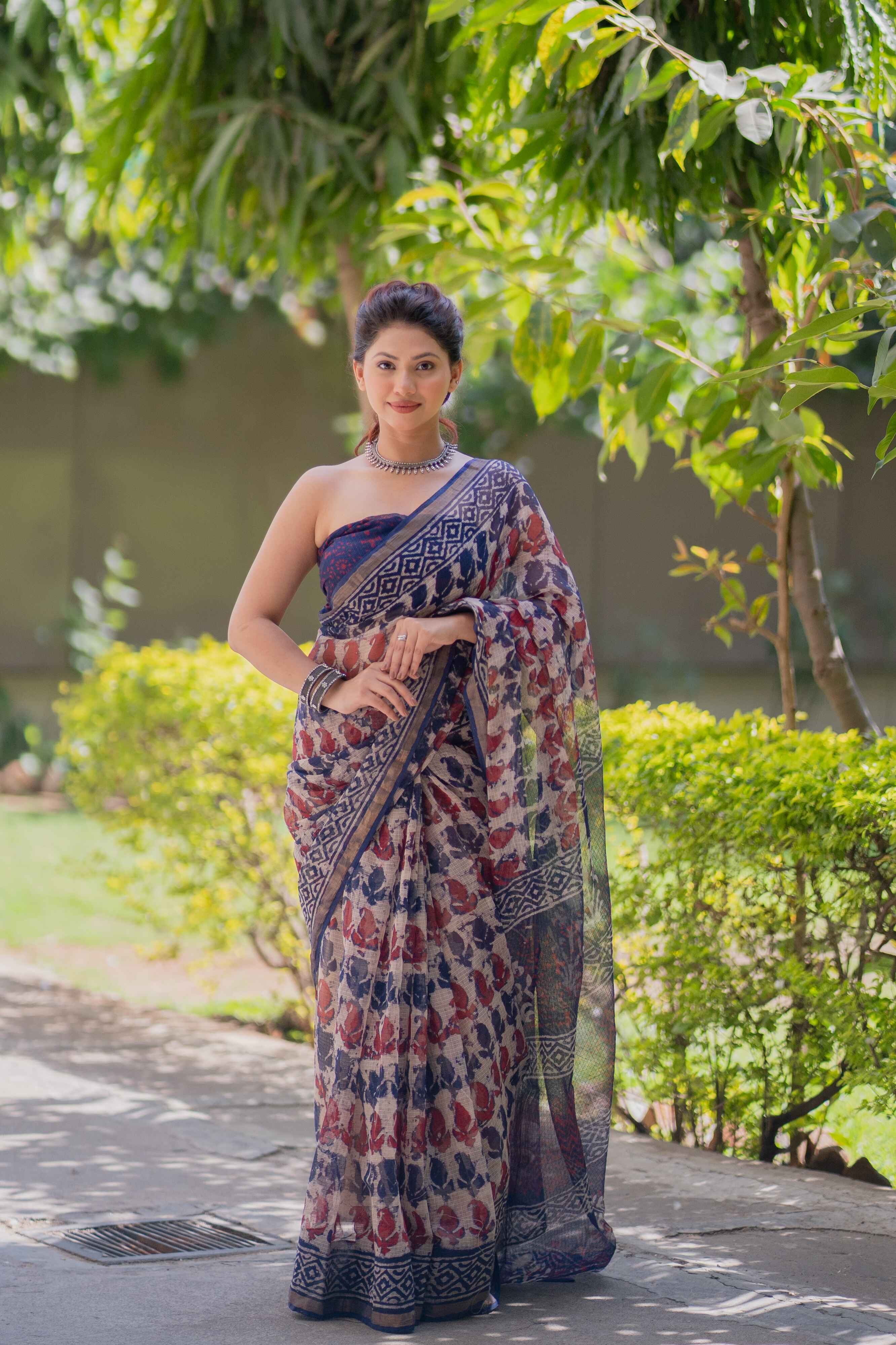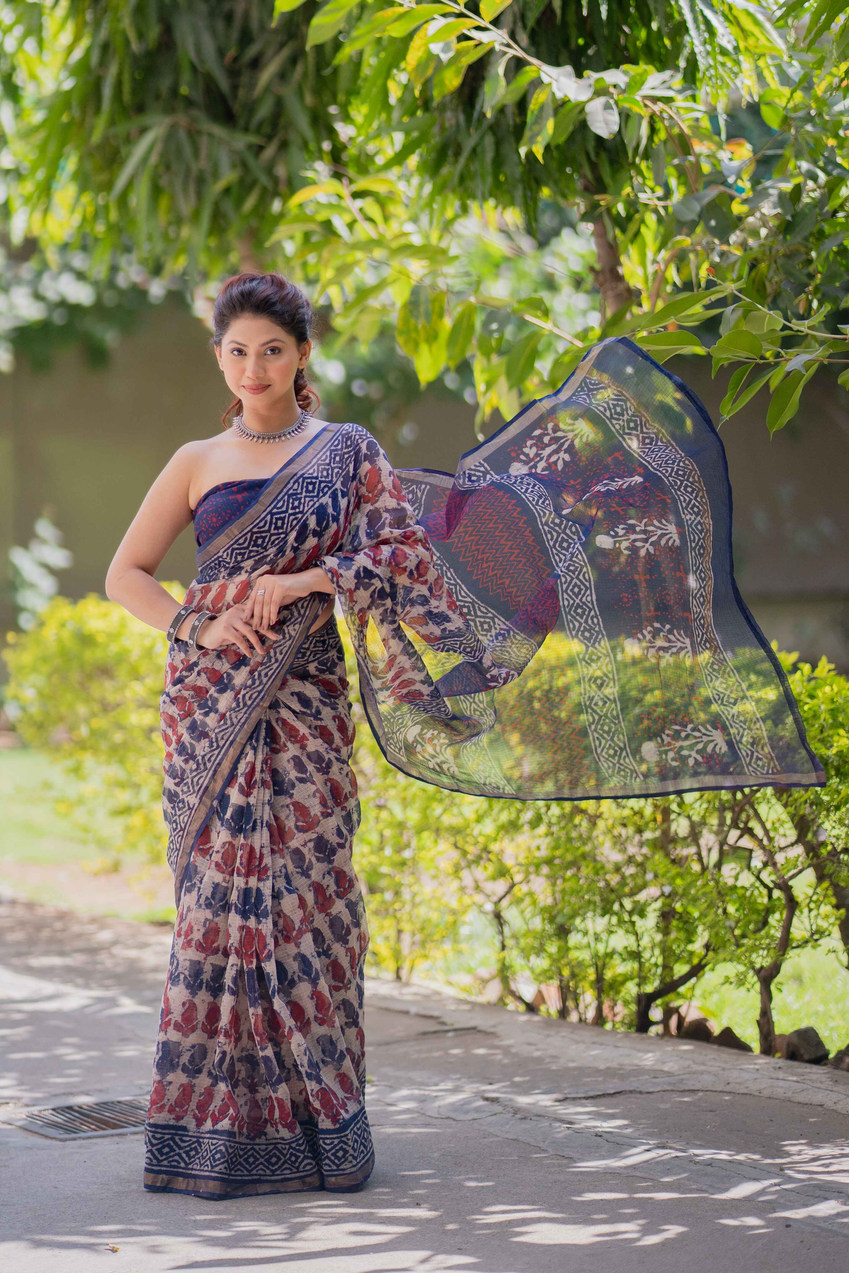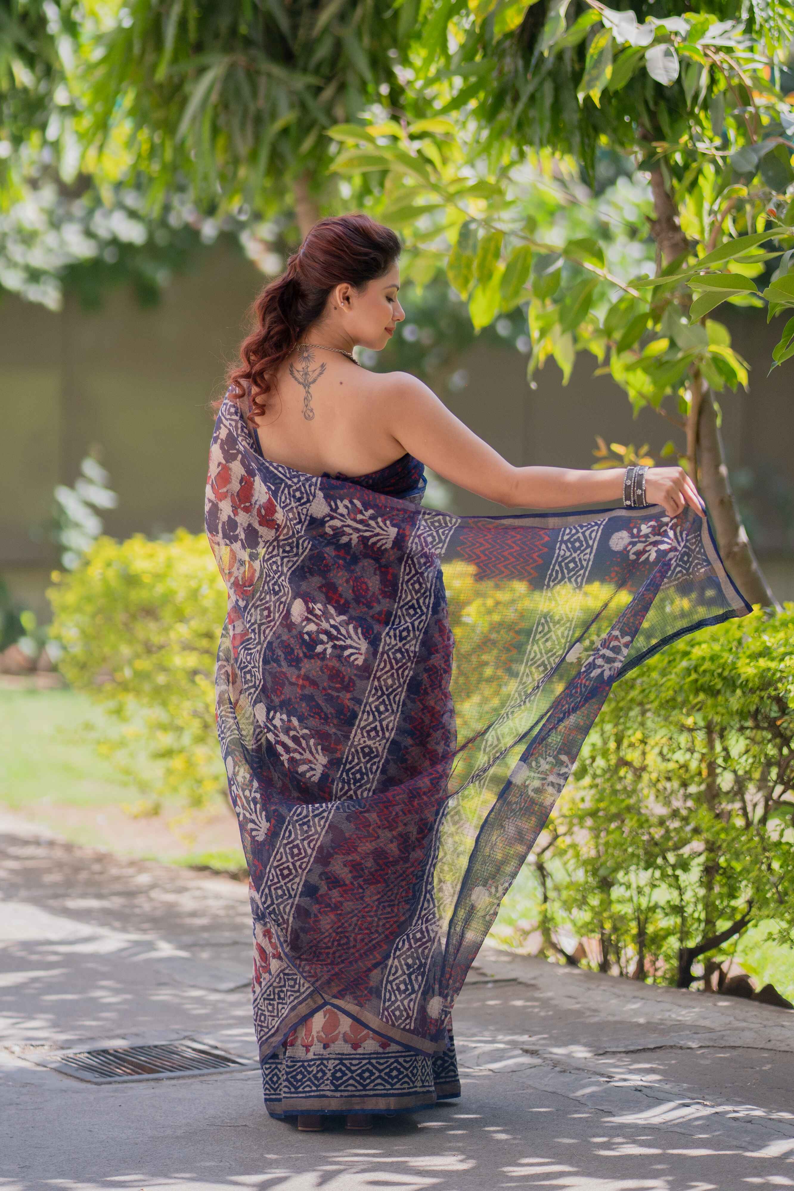 Crafted from the finest pure Kota Doria fabric, this saree is known for its lightweight, breathable texture and airy drape, making it an ideal choice for all-day wear. The hand-block printing in red and blue hues reflects the mastery of skilled artisans, ensuring a unique and authentic appeal. The matching Kota Doria blouse complements the saree beautifully, enhancing its overall aesthetic.