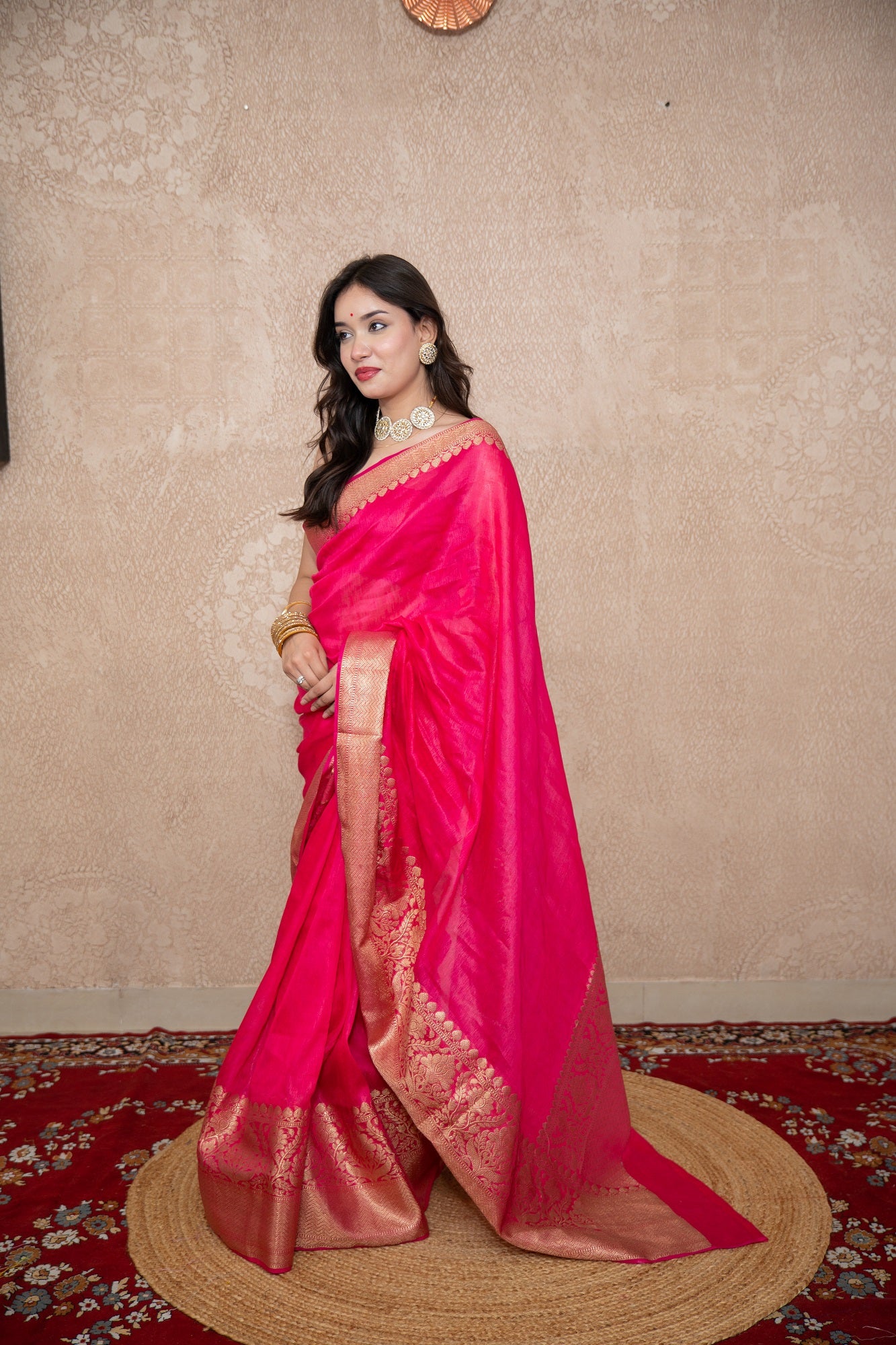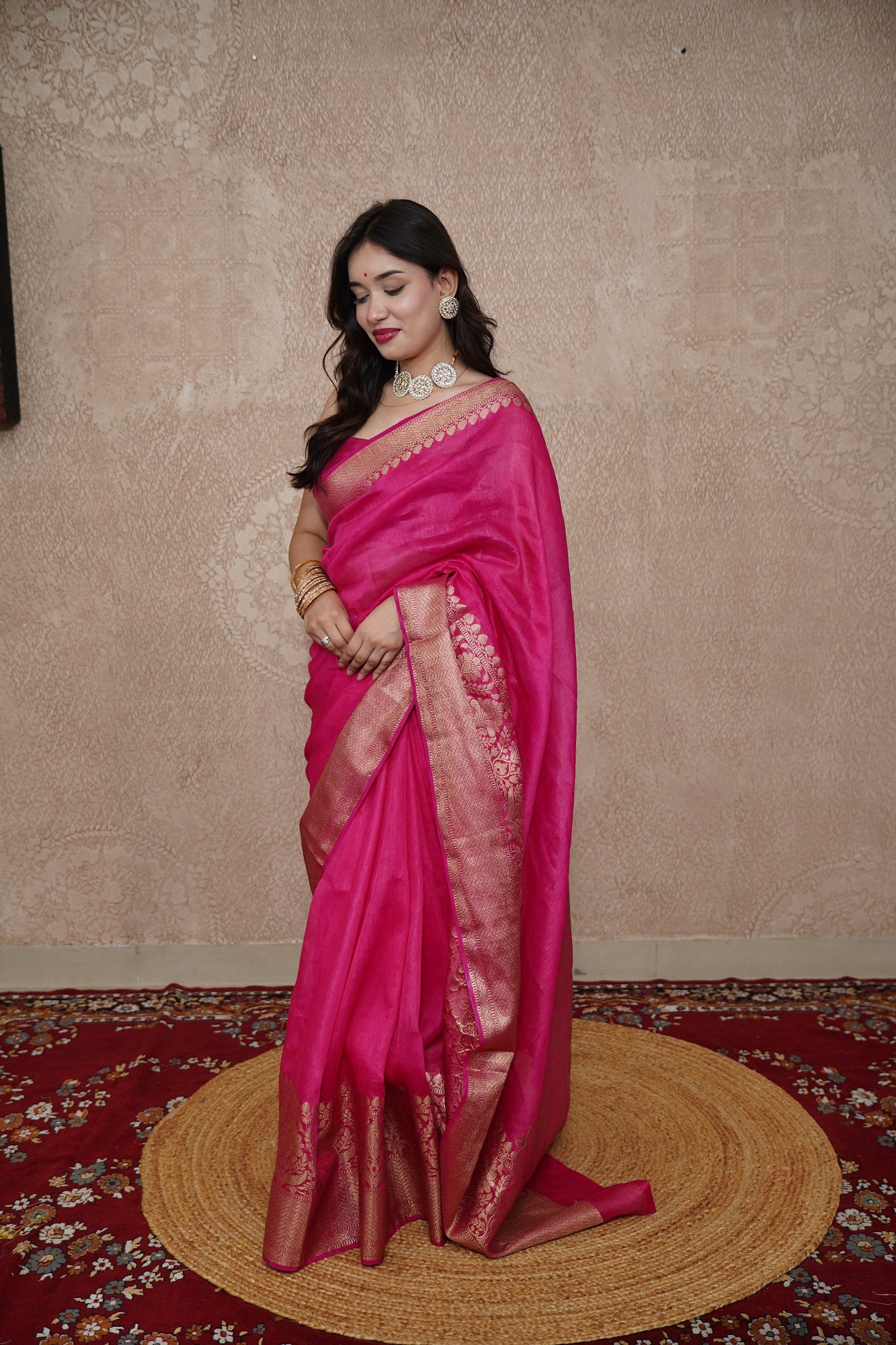 Soft, radiant, and joyfully elegant—Rangrali is a graceful Pink Silk Linen Saree that celebrates the vibrance of femininity and tradition. A charming piece from our handpicked "Sone ki Abha" collection, Rangrali is designed for occasions filled with laughter, light, and heartfelt celebration.