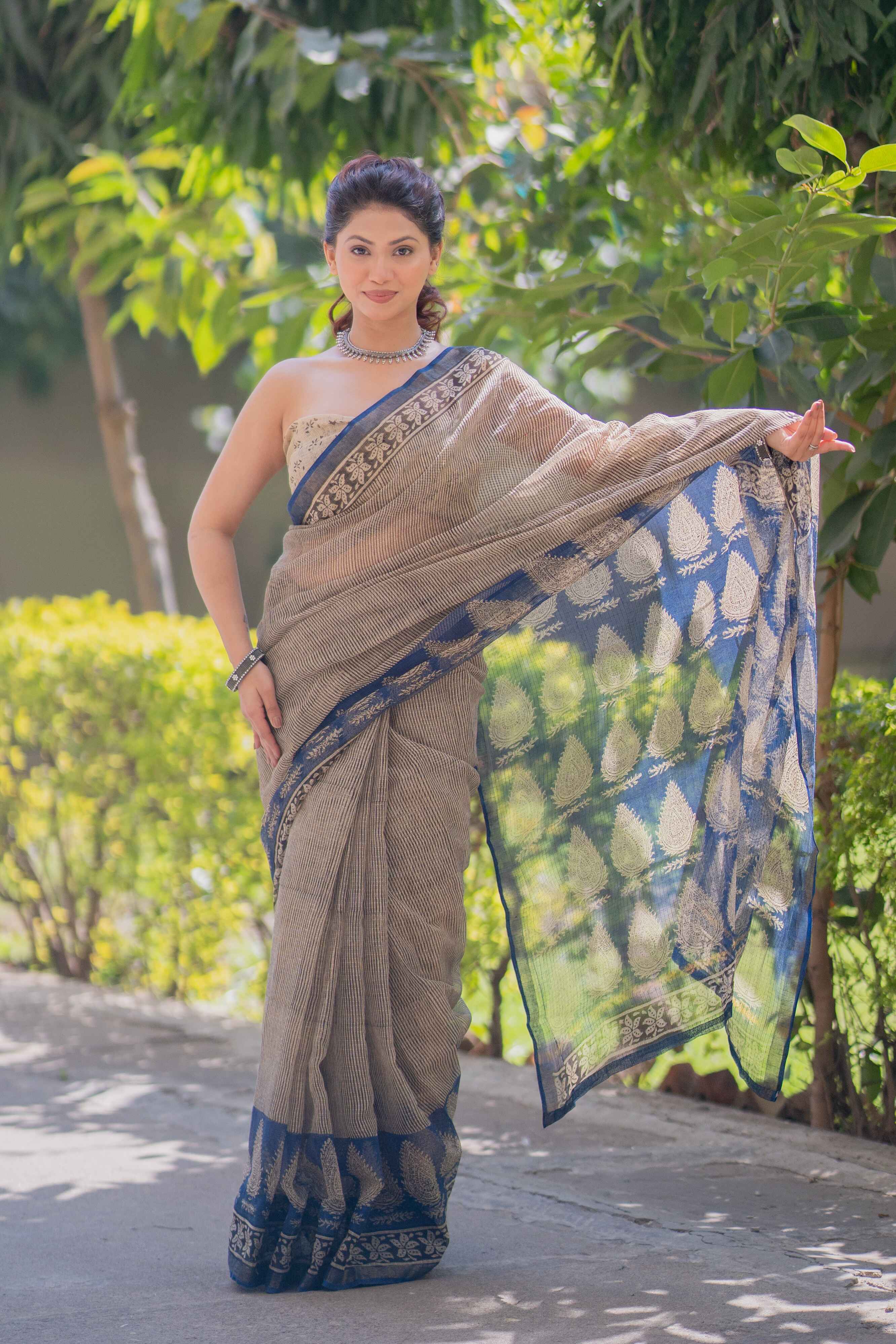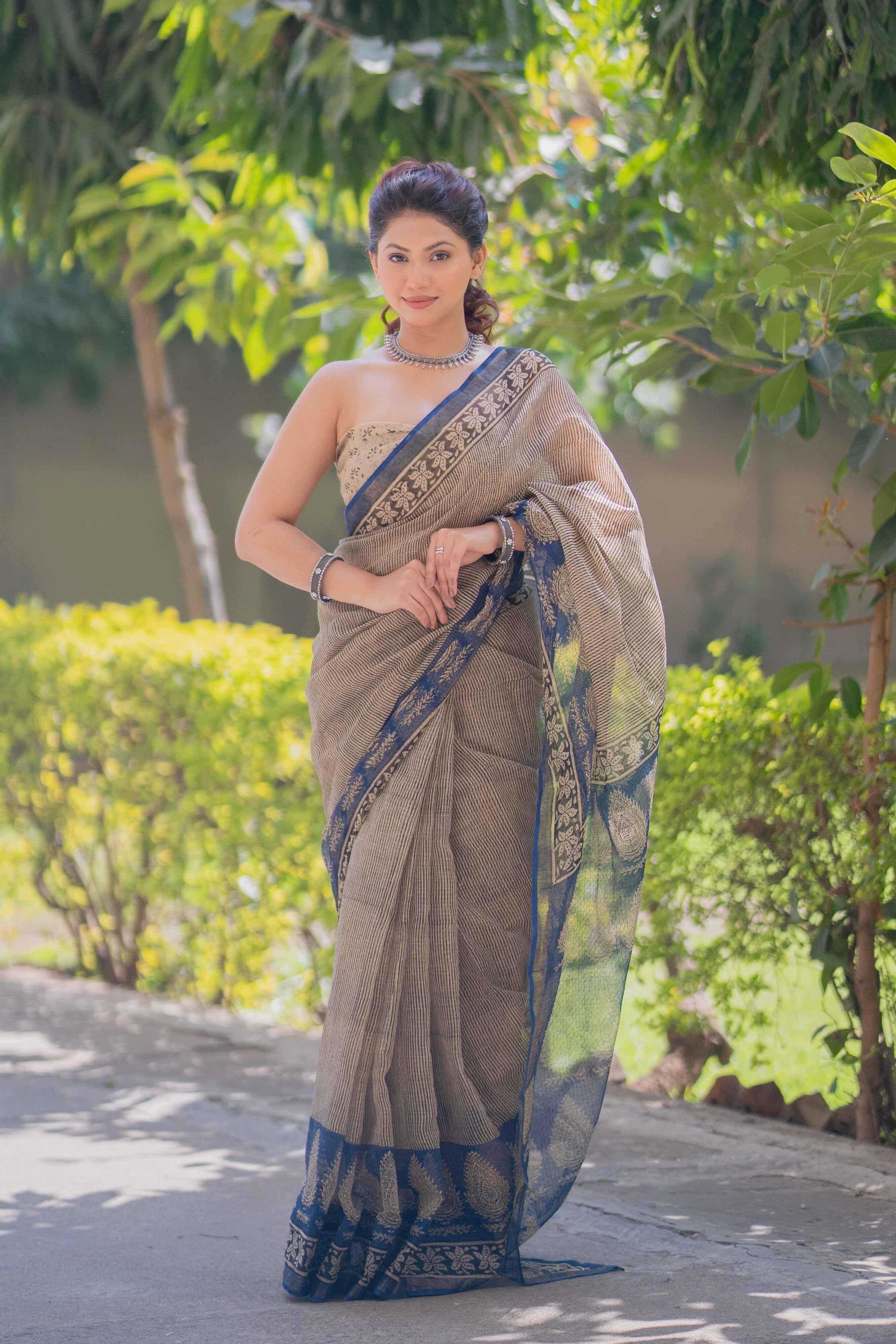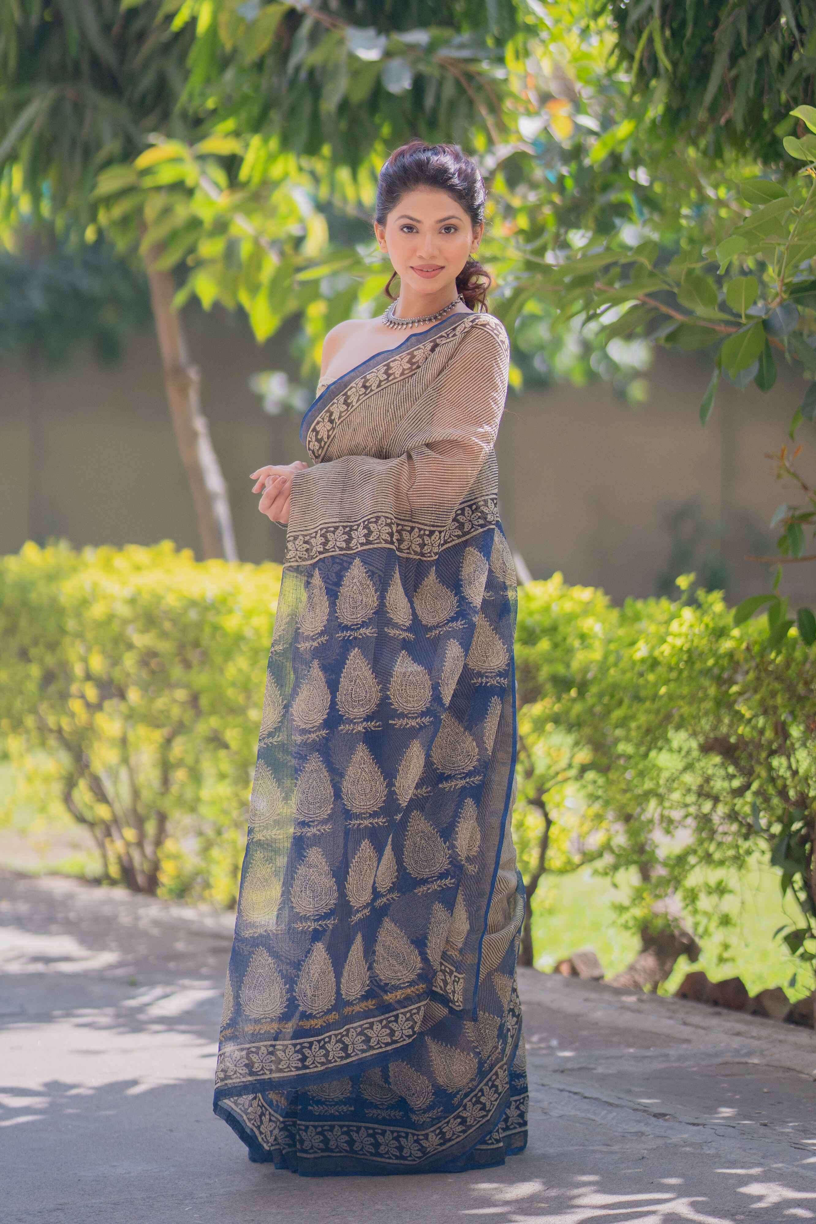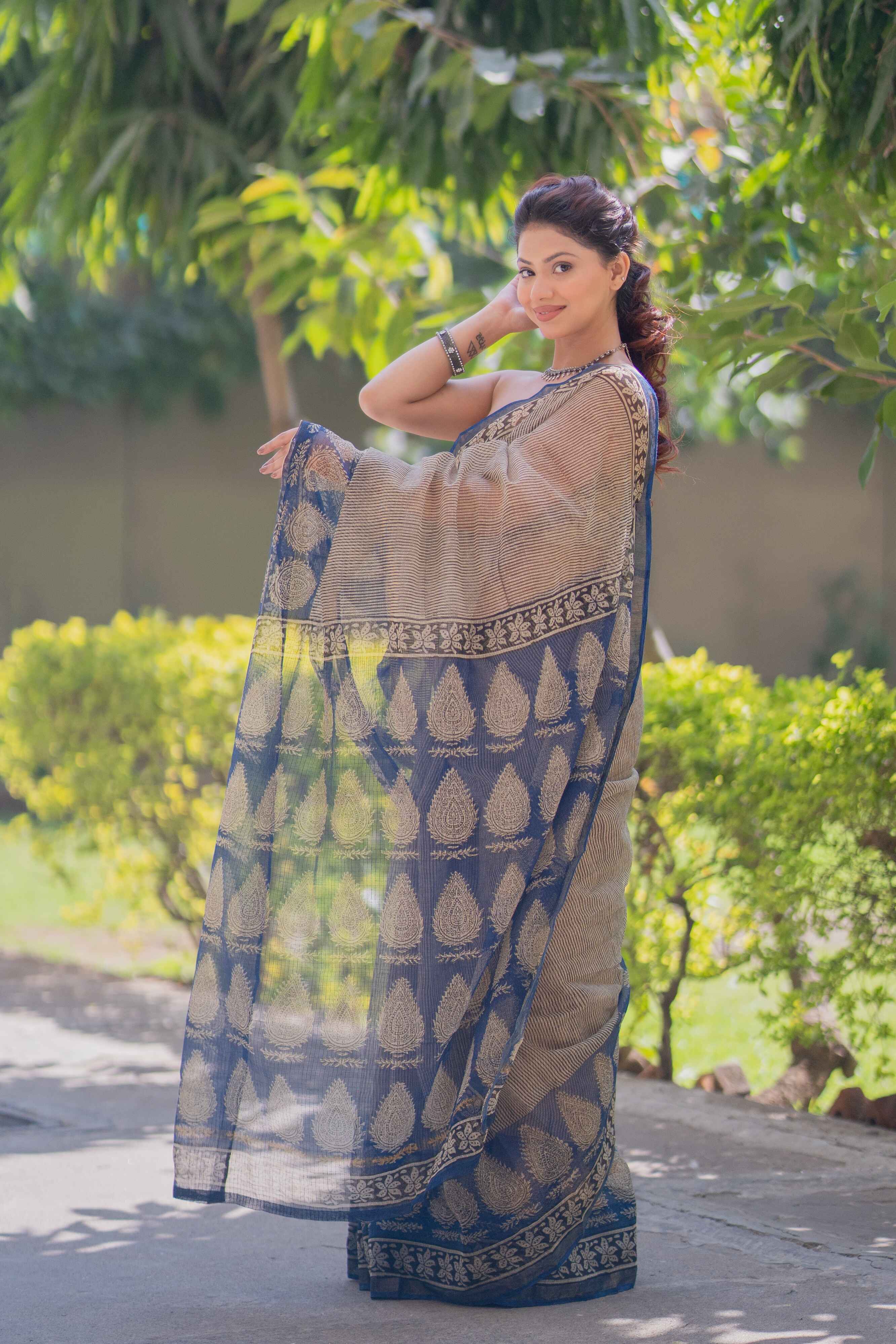 Step into effortless sophistication with Rasika, an exclusive creation from our Ashi collection. This exquisite Kota Doria saree features a graceful cream base adorned with striking black stripes, while the border and pallu boast intricate blue prints that add a touch of artistic finesse. A blend of heritage craftsmanship and contemporary aesthetics, Rasika is perfect for those who appreciate subtle elegance with a statement edge.