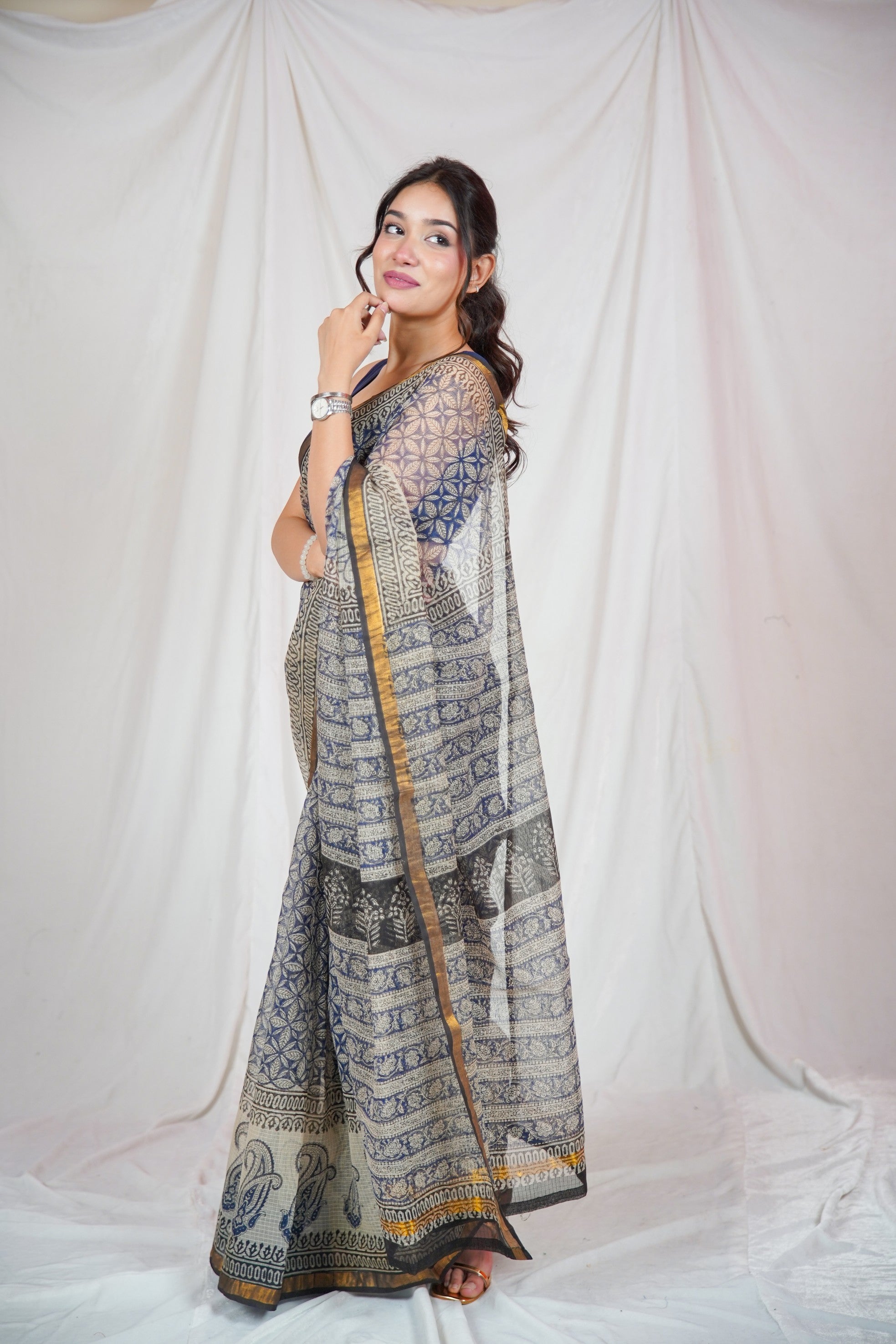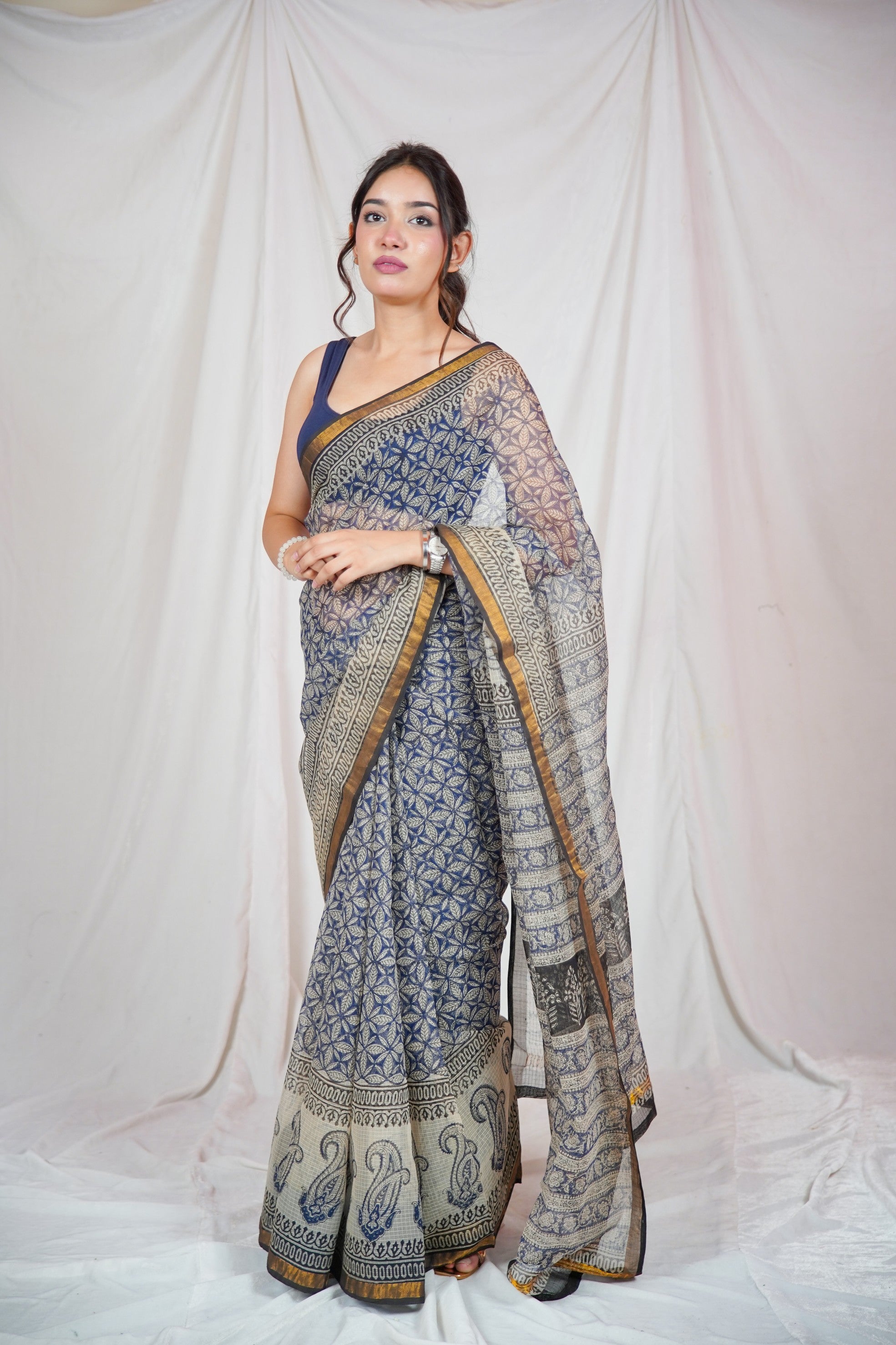 The deep regal blue hue is enhanced with hand block-printed motifs, adding a touch of timeless artistry and earthy charm to this graceful drape. Whether you're attending a daytime function, festive celebration, or simply embracing everyday elegance, this saree strikes the perfect balance between understated sophistication and ethnic flair.
