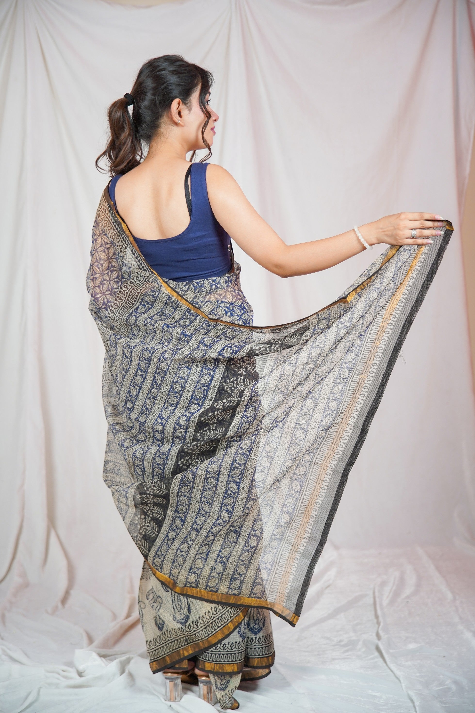 Buy the Regal Blue Block Printed Kota Doria Saree online at The Raksha Store and celebrate India's timeless textile legacy with every fold.