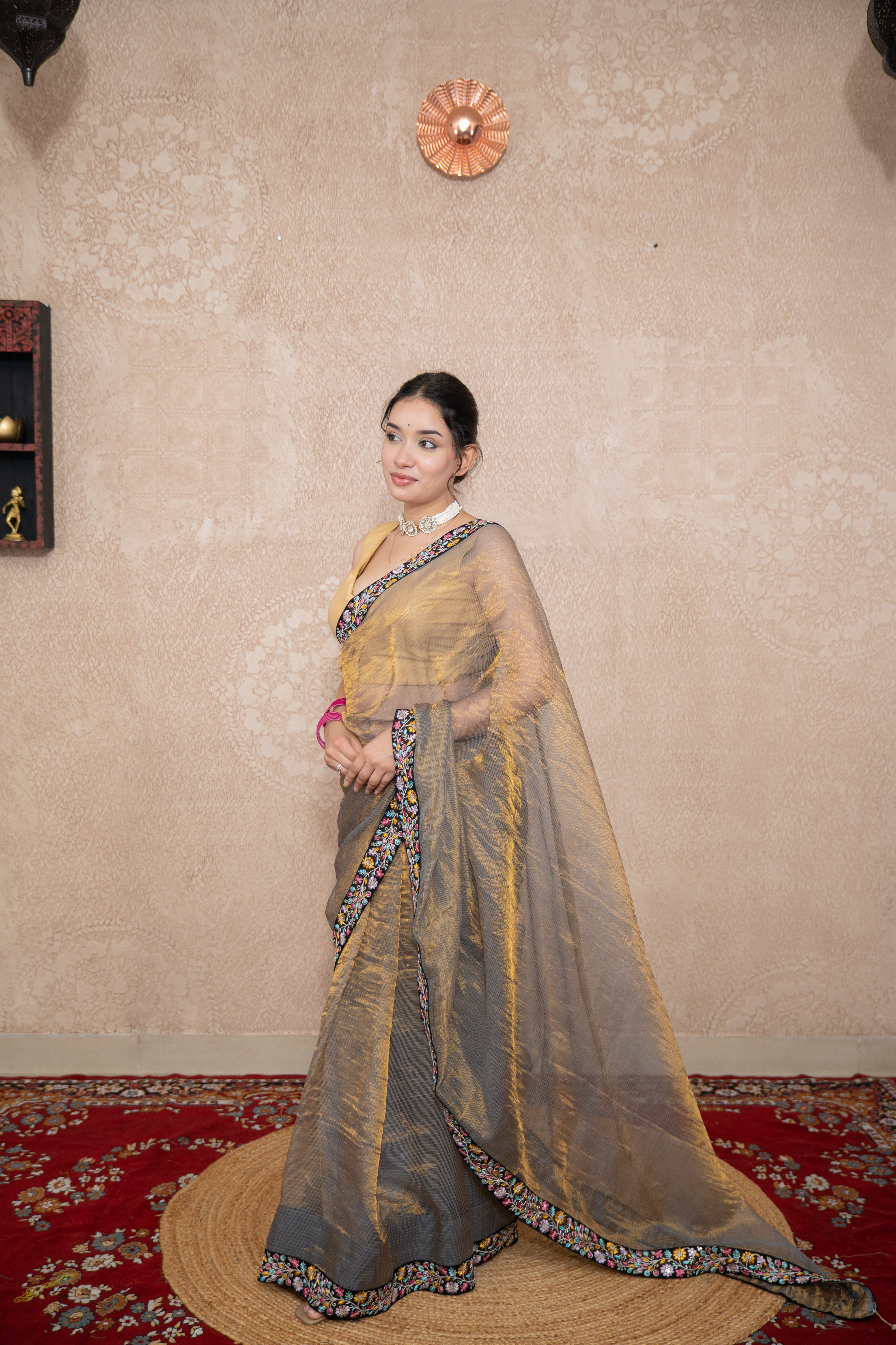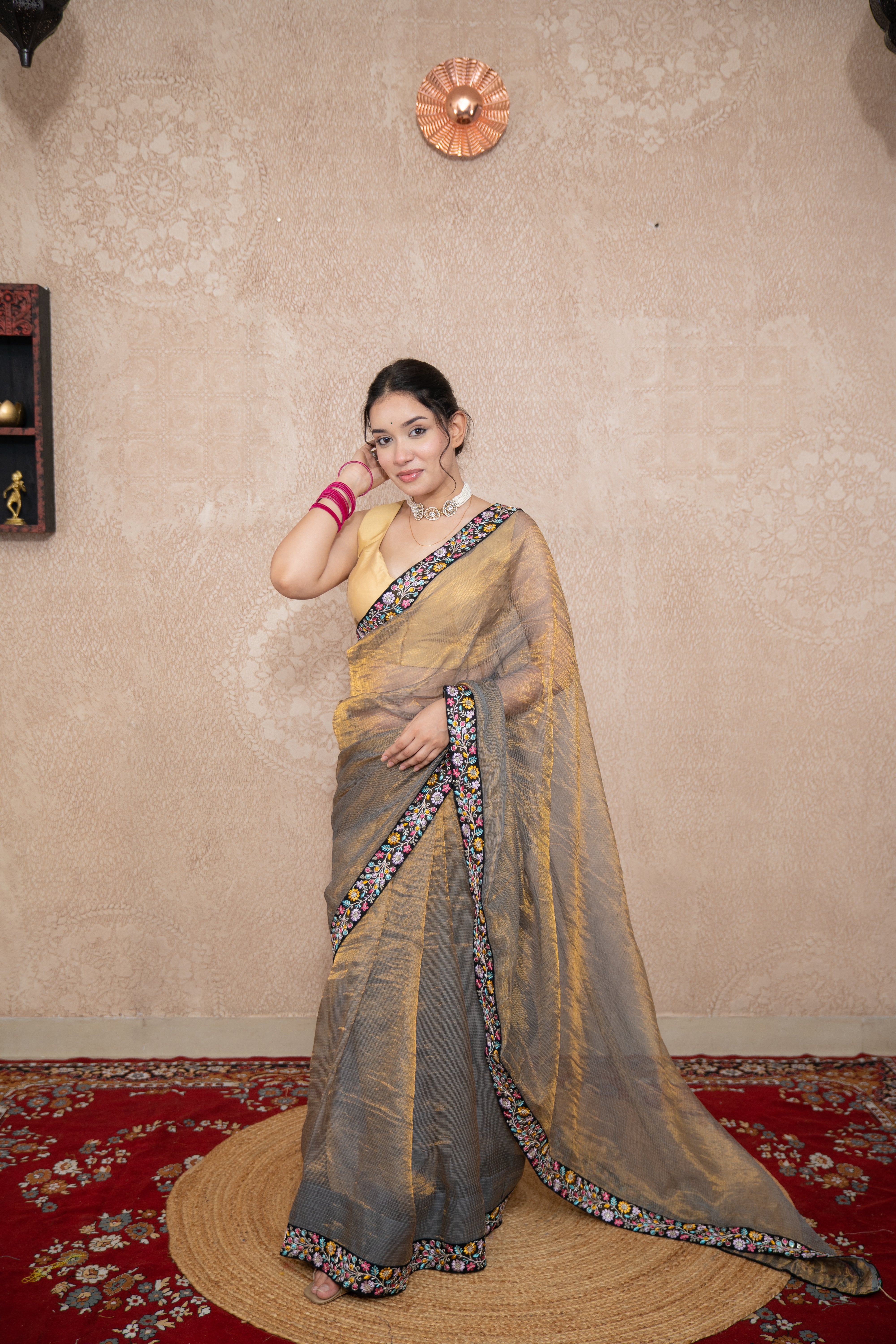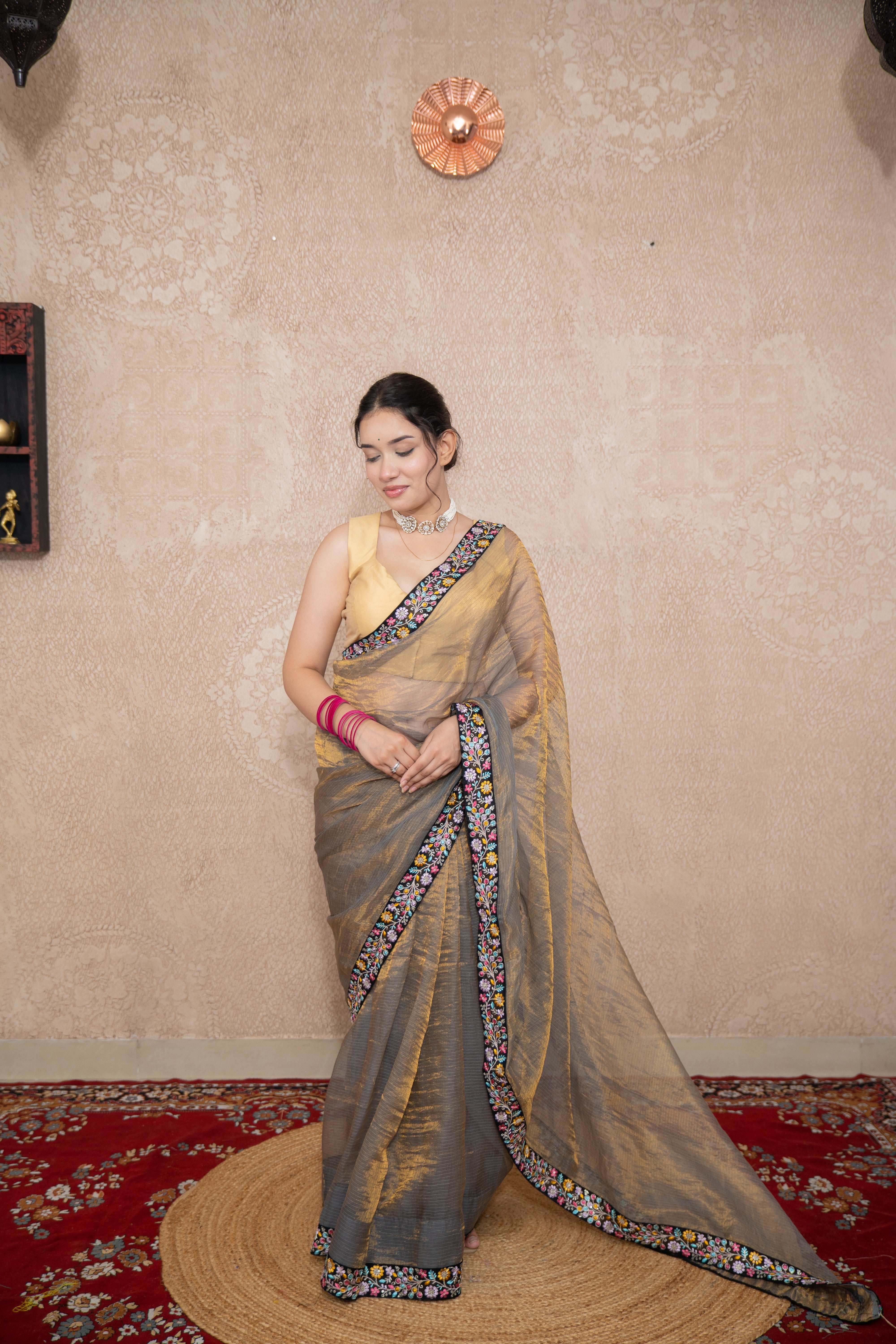 Bold, elegant, and effortlessly regal — Renuka is a timeless Black Tissue Saree with a beautifully woven border, crafted for those who embody strength with grace. A standout in our "Sone ki Abha" collection, this saree is perfect for formal evenings, festive nights, and occasions that call for a commanding, classic presence.