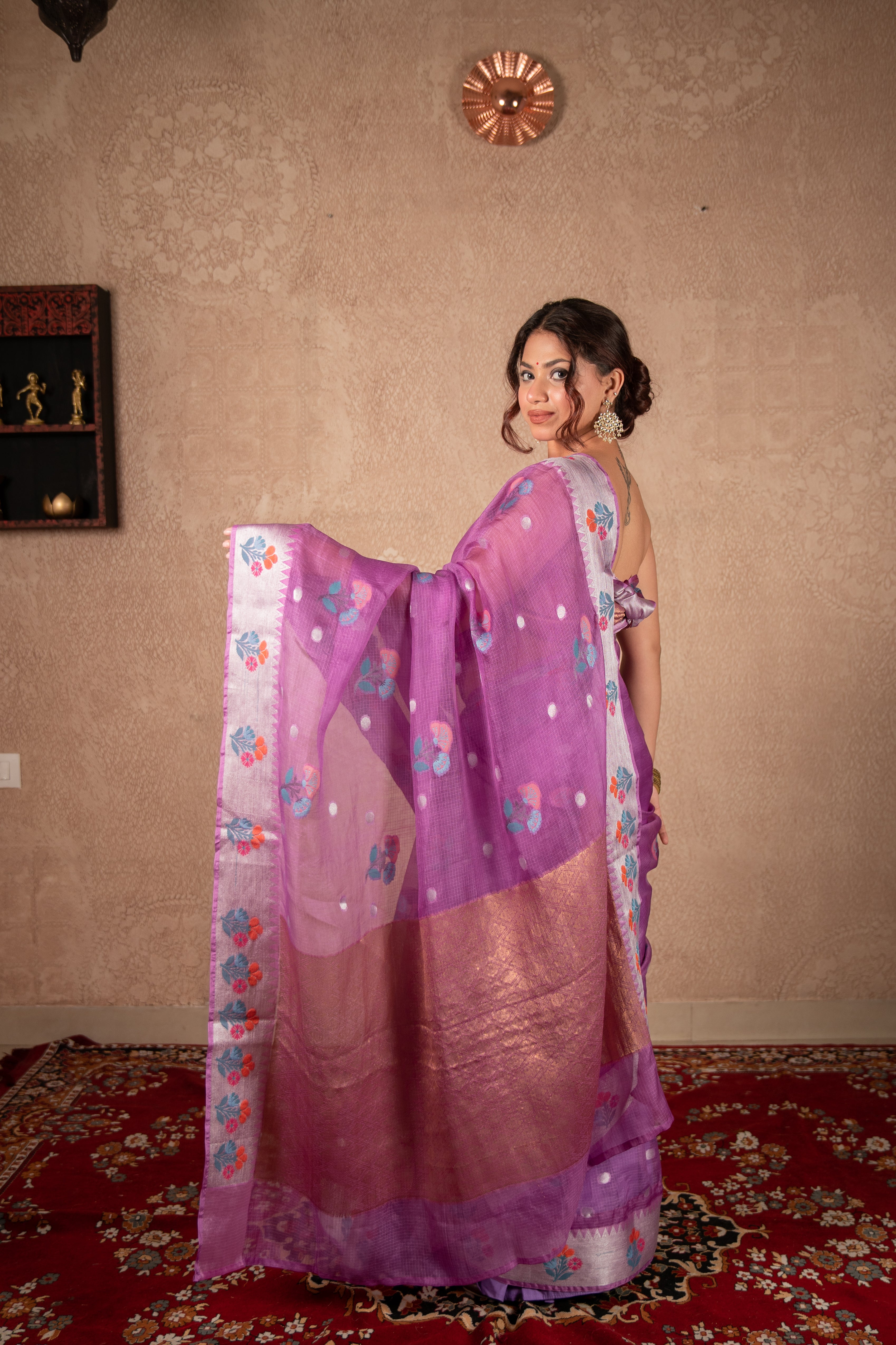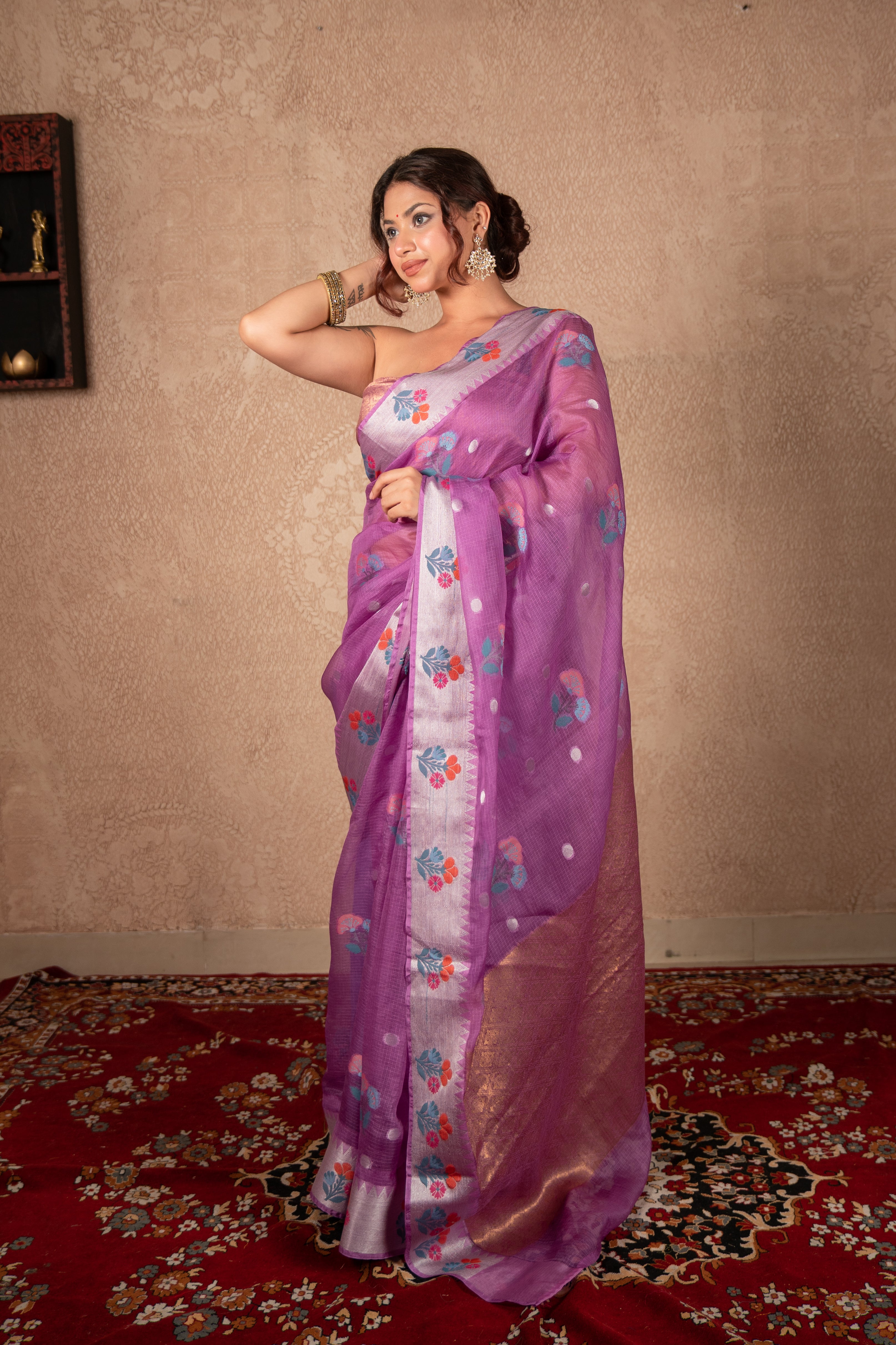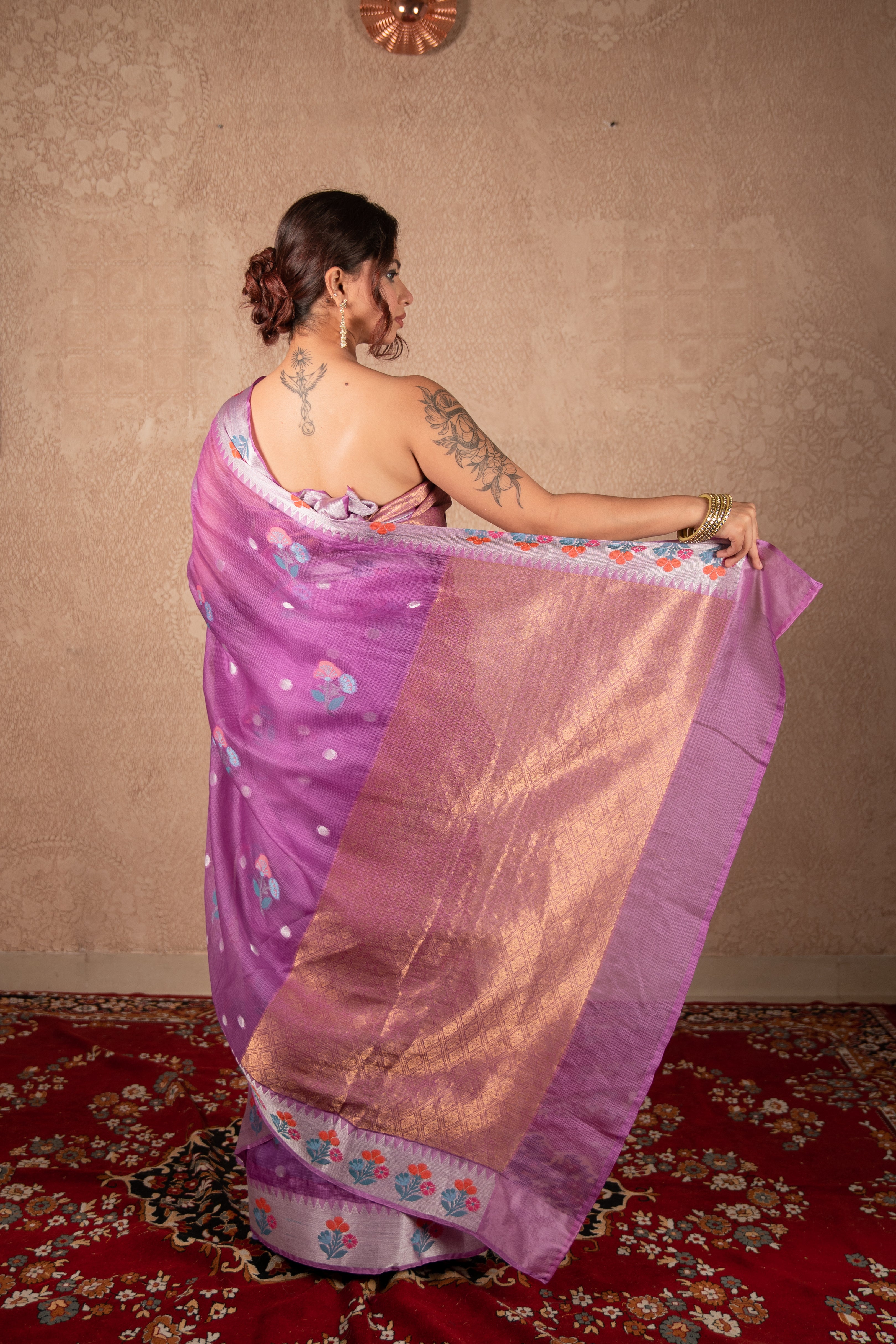 Grace your wardrobe with this Purple Kota Silk Saree, adorned with delicate floral designs and complemented by a shimmering golden pallu. Crafted from lightweight and breathable Kota silk, this saree blends comfort with elegance, making it perfect for festive occasions and weddings.