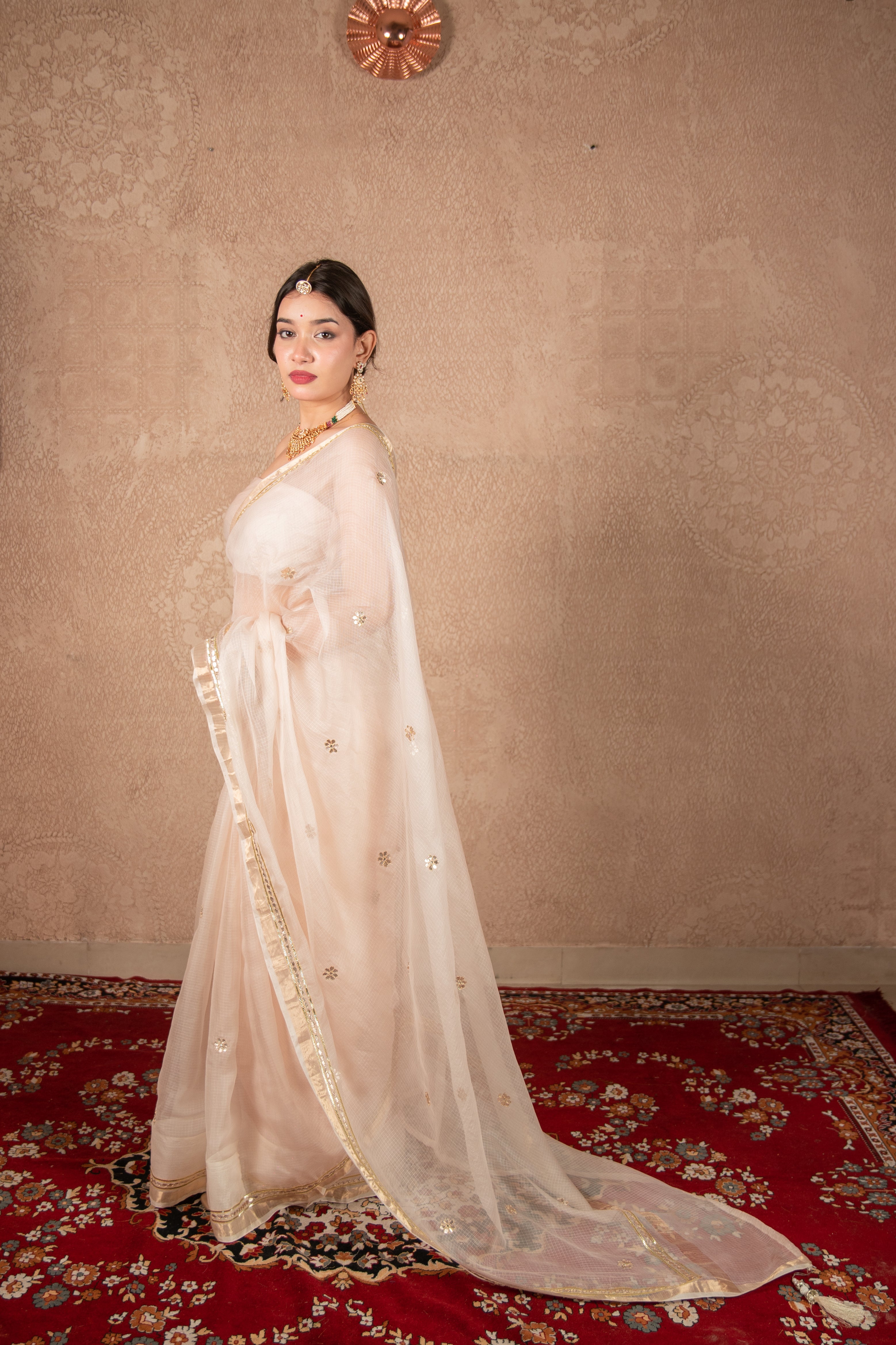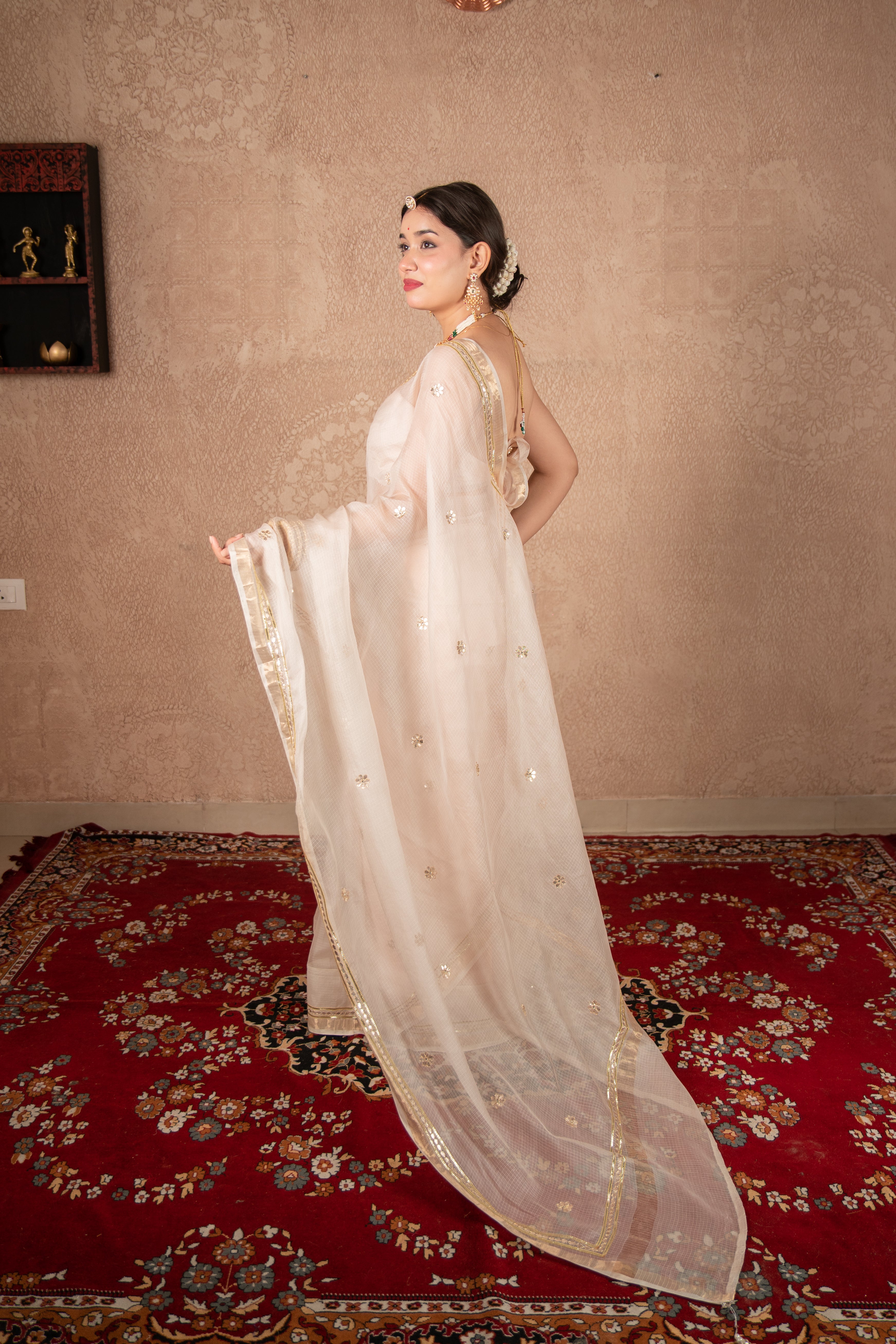 Radiate elegance with this Cream Kota Silk Saree beautifully detailed with handwork, dainty buti motifs, and a refined thin gota border. Woven from airy and lightweight Kota Silk, it drapes effortlessly while ensuring day-long comfort. The subtle cream shade reflects grace and purity, while the delicate buti embroidery showcases fine craftsmanship that enhances its festive charm.