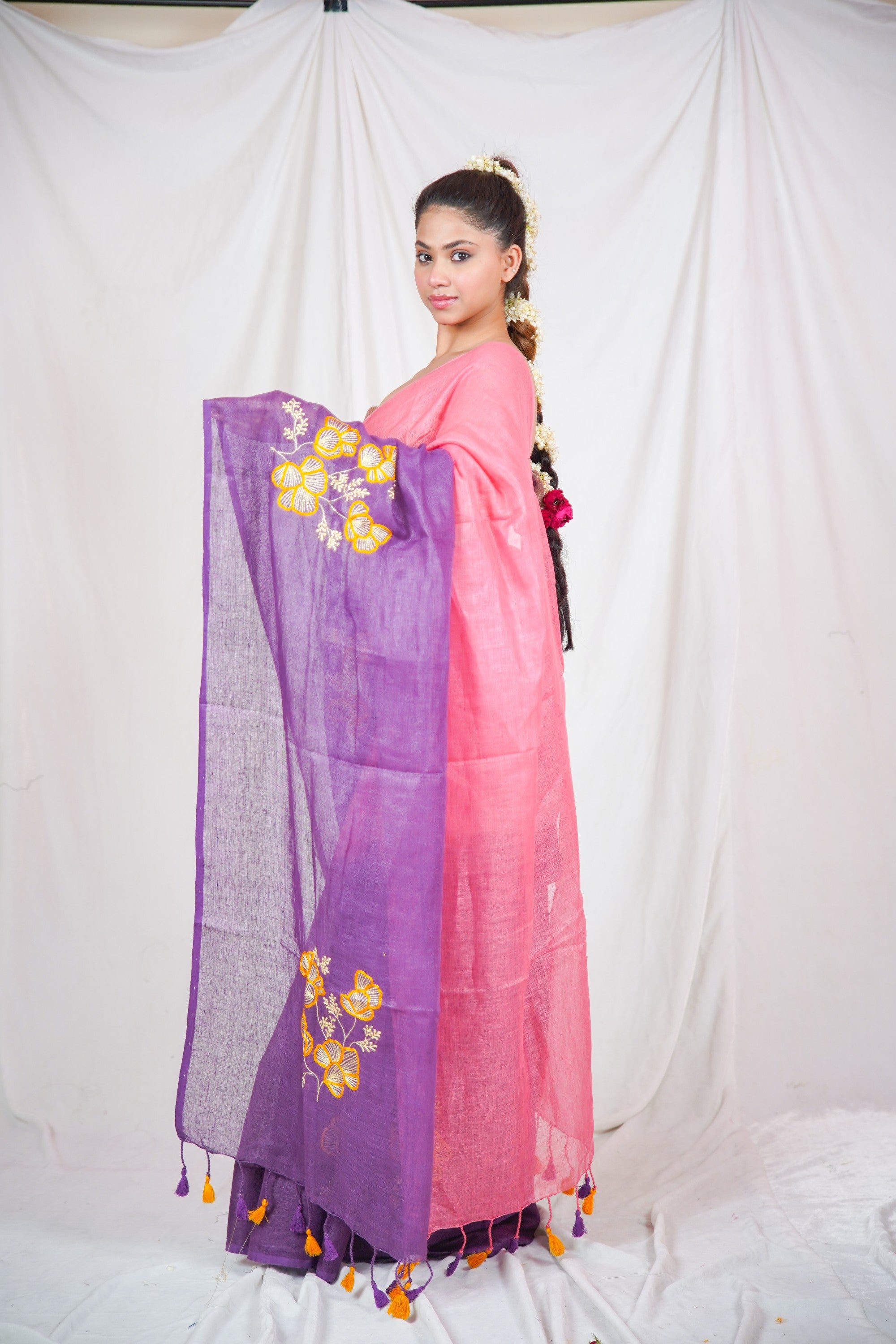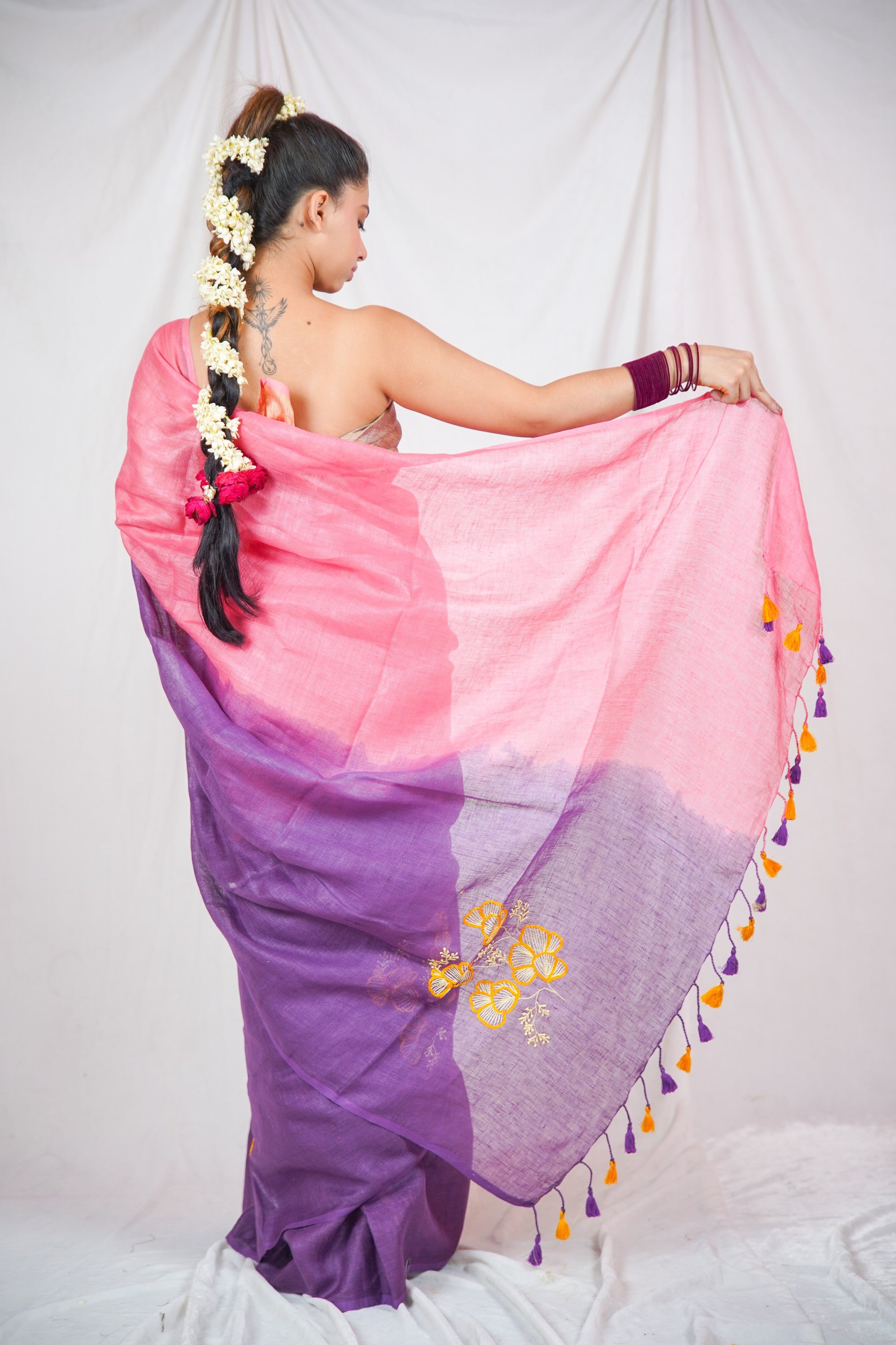 Crafted with precision and passion, this saree embodies the essence of timeless beauty and contemporary charm. The dual pink and purple hue of the linen fabric evokes a sense of tranquility and depth. The delicate gold floral handwork adds a touch of regal opulence, creating a mesmerizing visual symphony that captivates admirers.