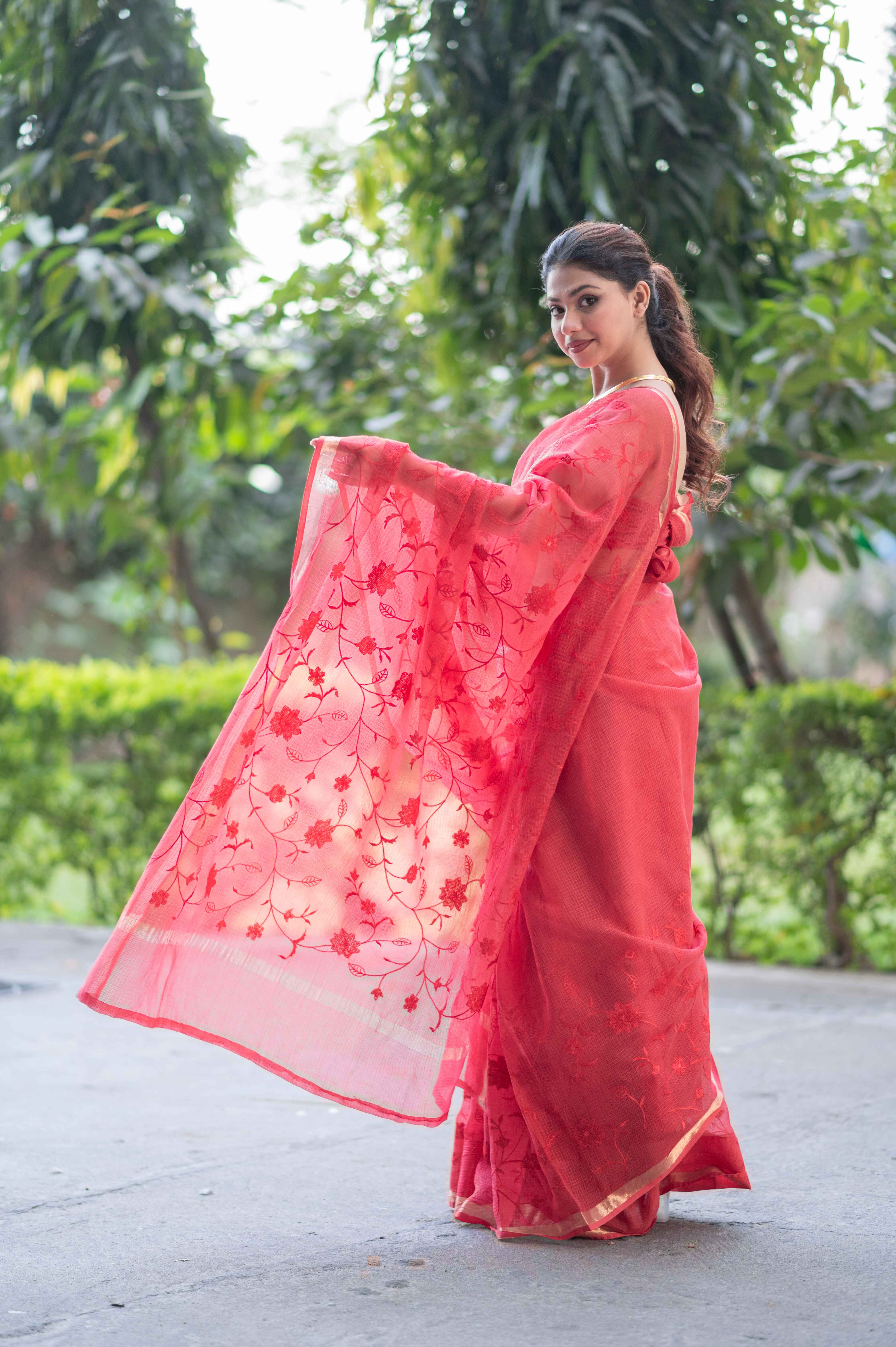 Step into sophistication with our Ruby Glow - Red Kota Doria Saree, a perfect blend of tradition and contemporary grace. Designed exclusively for our brand, this saree is crafted to make you stand out at every occasion.