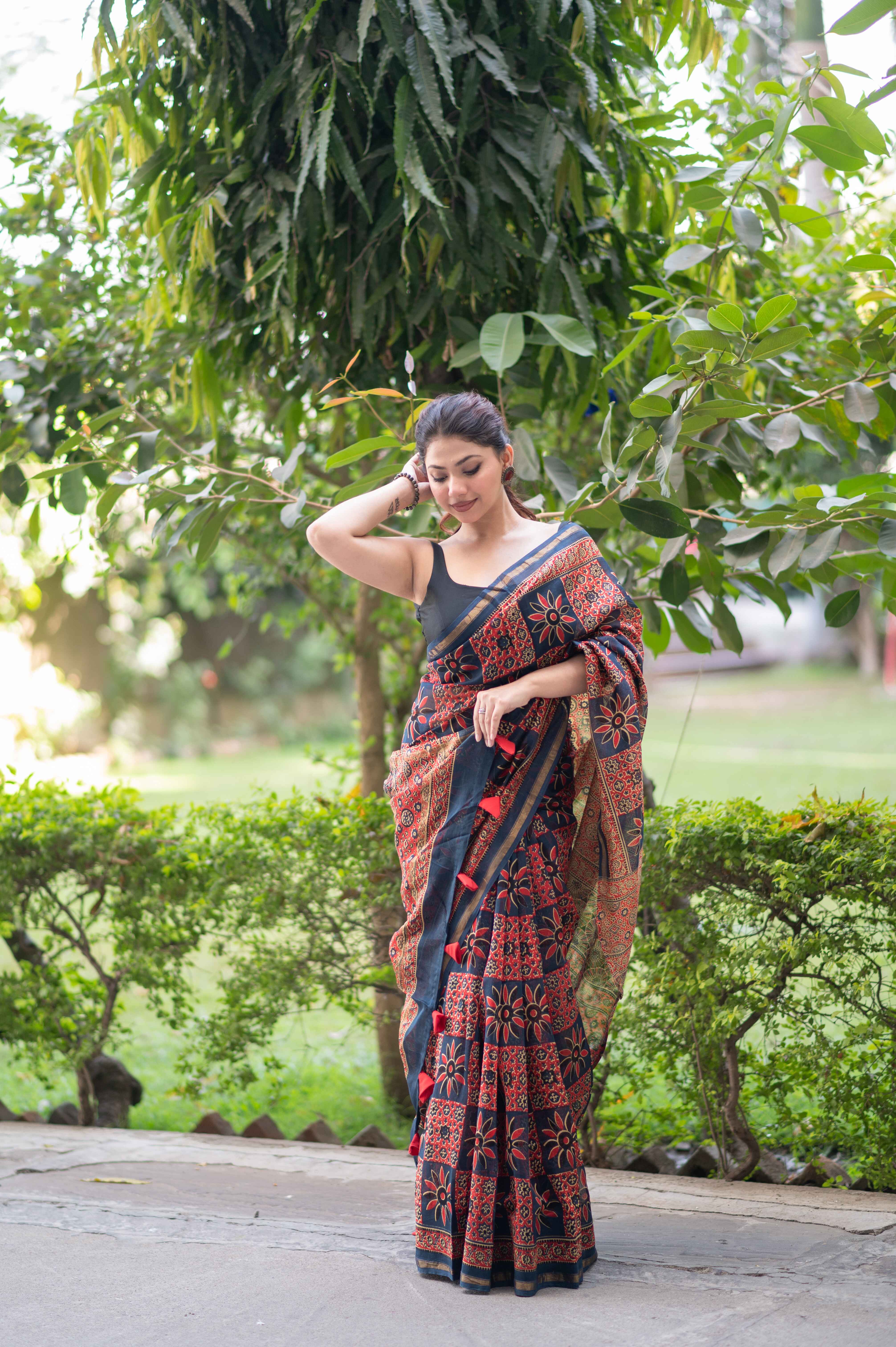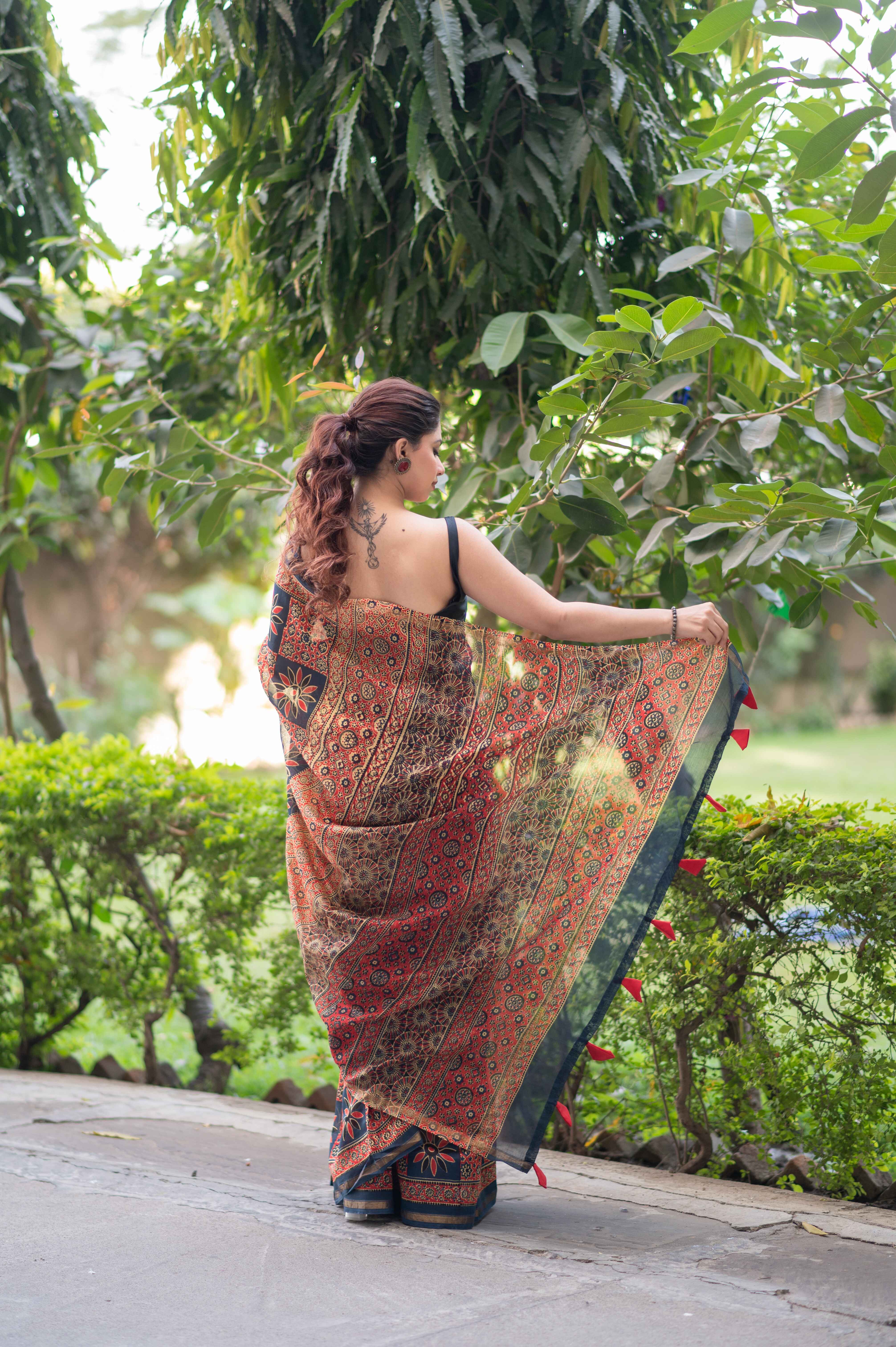 The pallu is adorned with striking Ajrakh prints in blue and red. It adds an extra layer of vibrancy and charm to the ensemble. As you drape yourself in its soft folds, you'll experience the luxurious texture of the Maheshwari silk against your skin, creating a feeling of comfort and elegance.