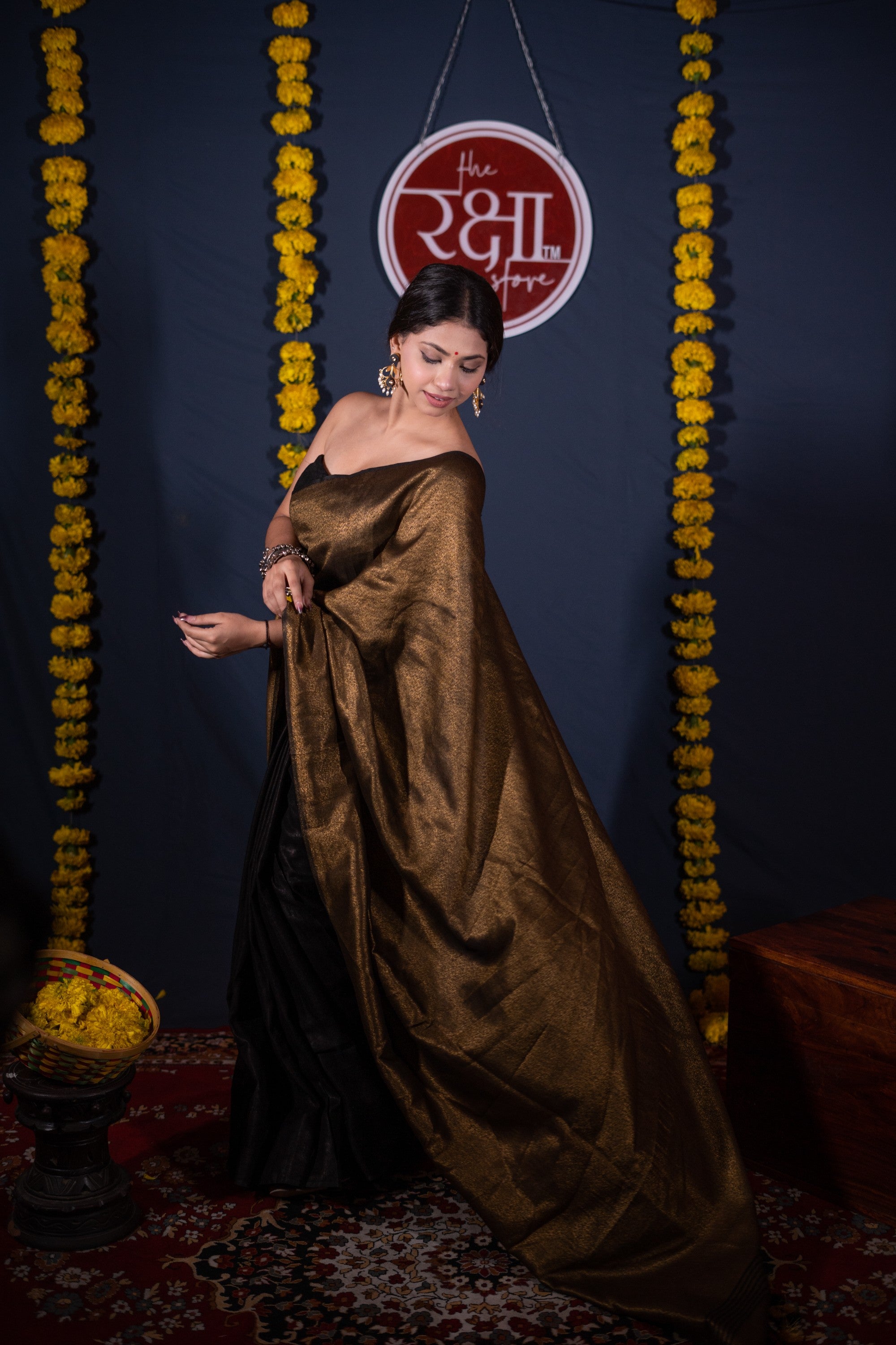 Unveil timeless sophistication with the Sarita Black Copper Linen Saree, a stunning piece that exudes understated charm and grace. This saree combines the allure of a classic black base with the striking elegance of a copper pallu, creating a versatile ensemble for both formal occasions and festive celebrations.