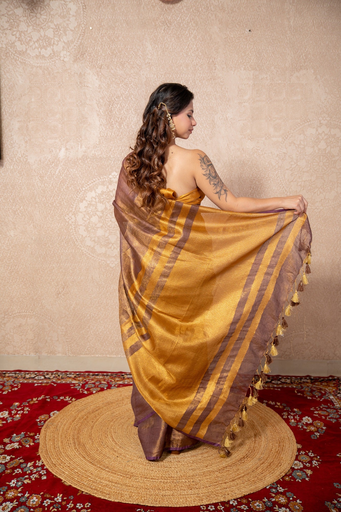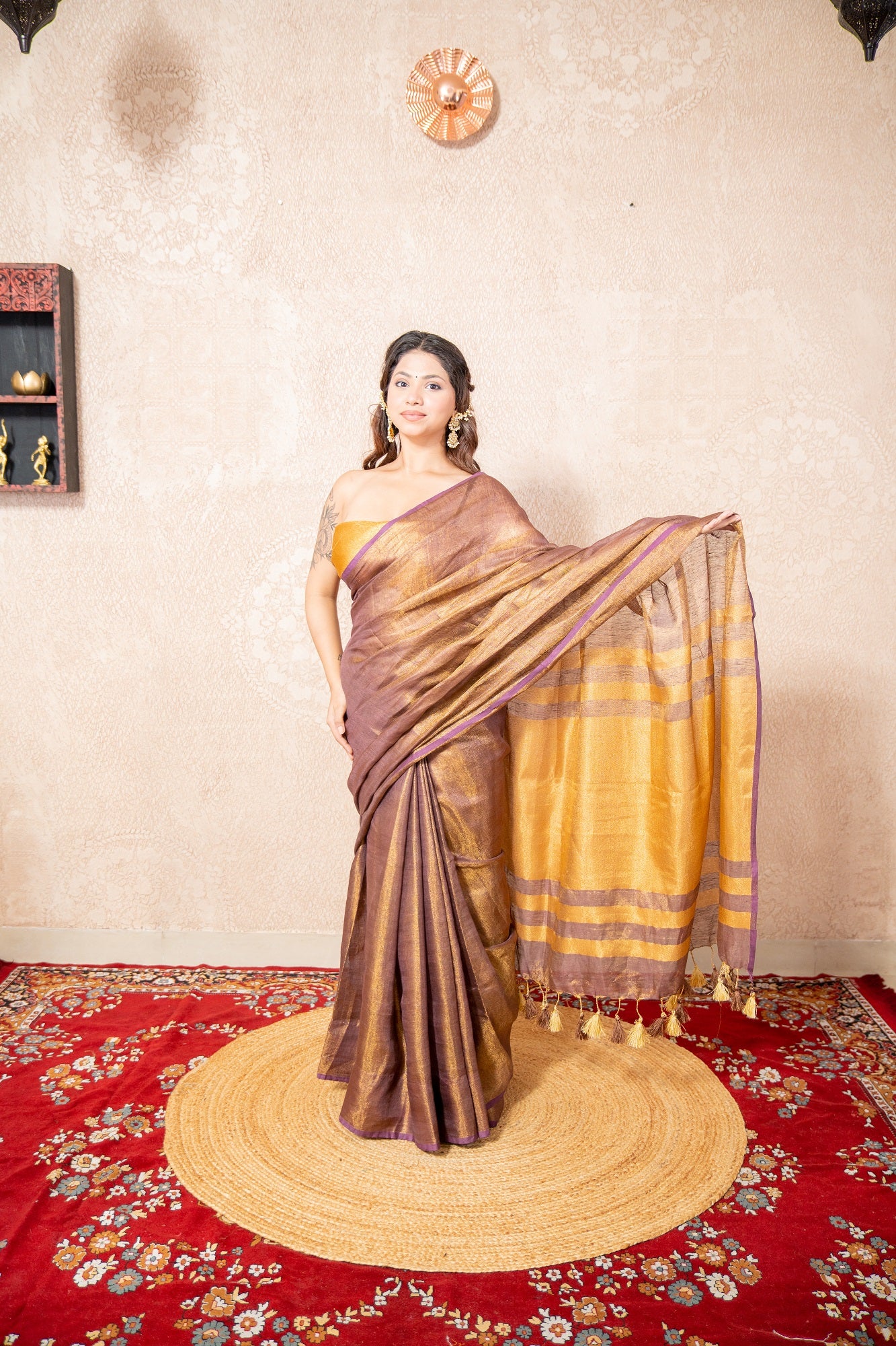 Grace every moment with the subtle brilliance of Seher, a luminous Copper Saree with Zari Stripes. Part of our elegant "Sone ki Abha" collection, Seher captures the warm glow of sunrise in every fold—perfect for intimate celebrations, festive mornings, or evening soirées where understated luxury shines.