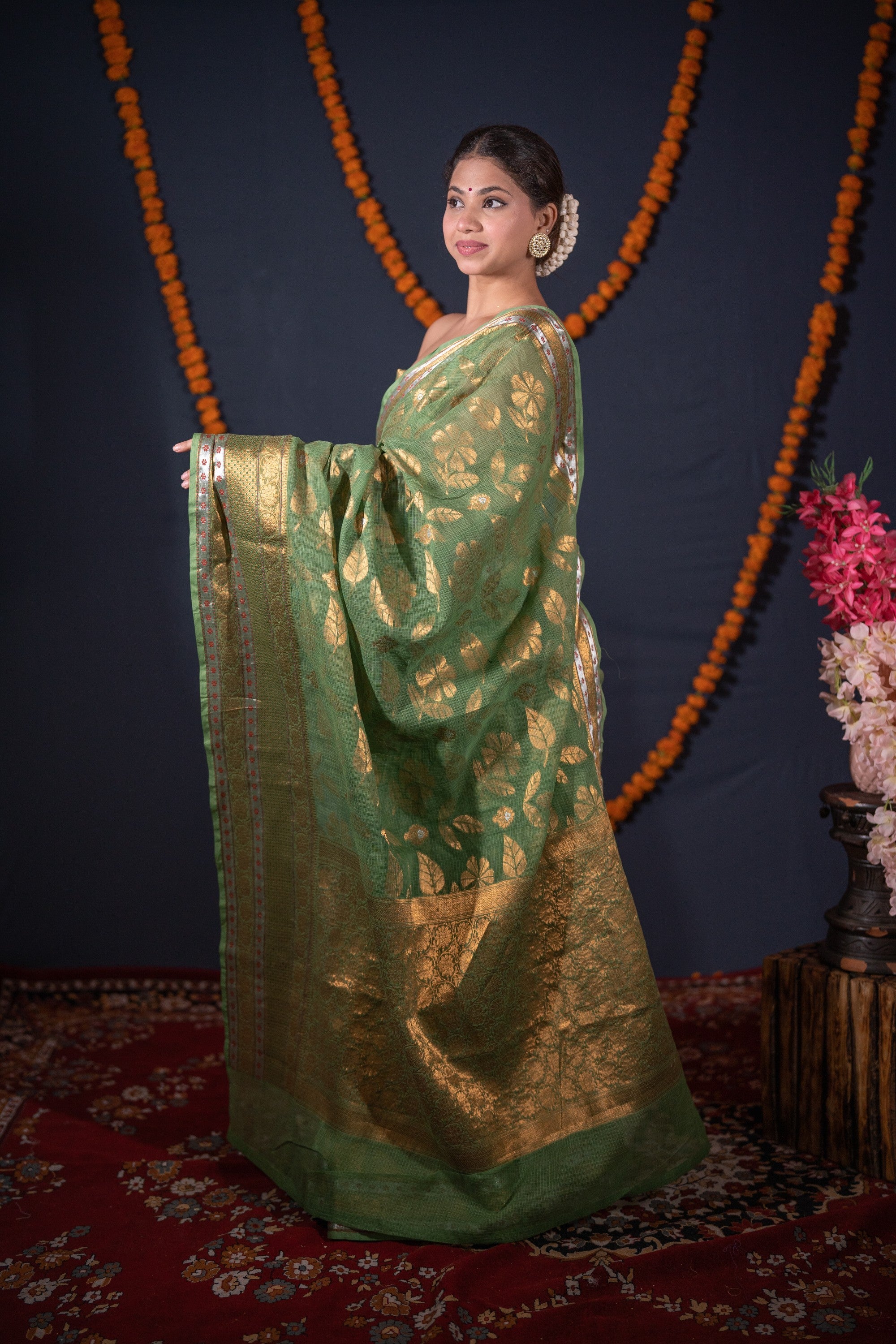 Elevate your wardrobe with Snigdha, a breathtaking green floral woven Kota Doria saree that exudes timeless elegance and charm. Crafted from pure, lightweight fabric, this saree is a seamless blend of tradition and sophistication, perfect for every occasion, from casual gatherings to festive celebrations.