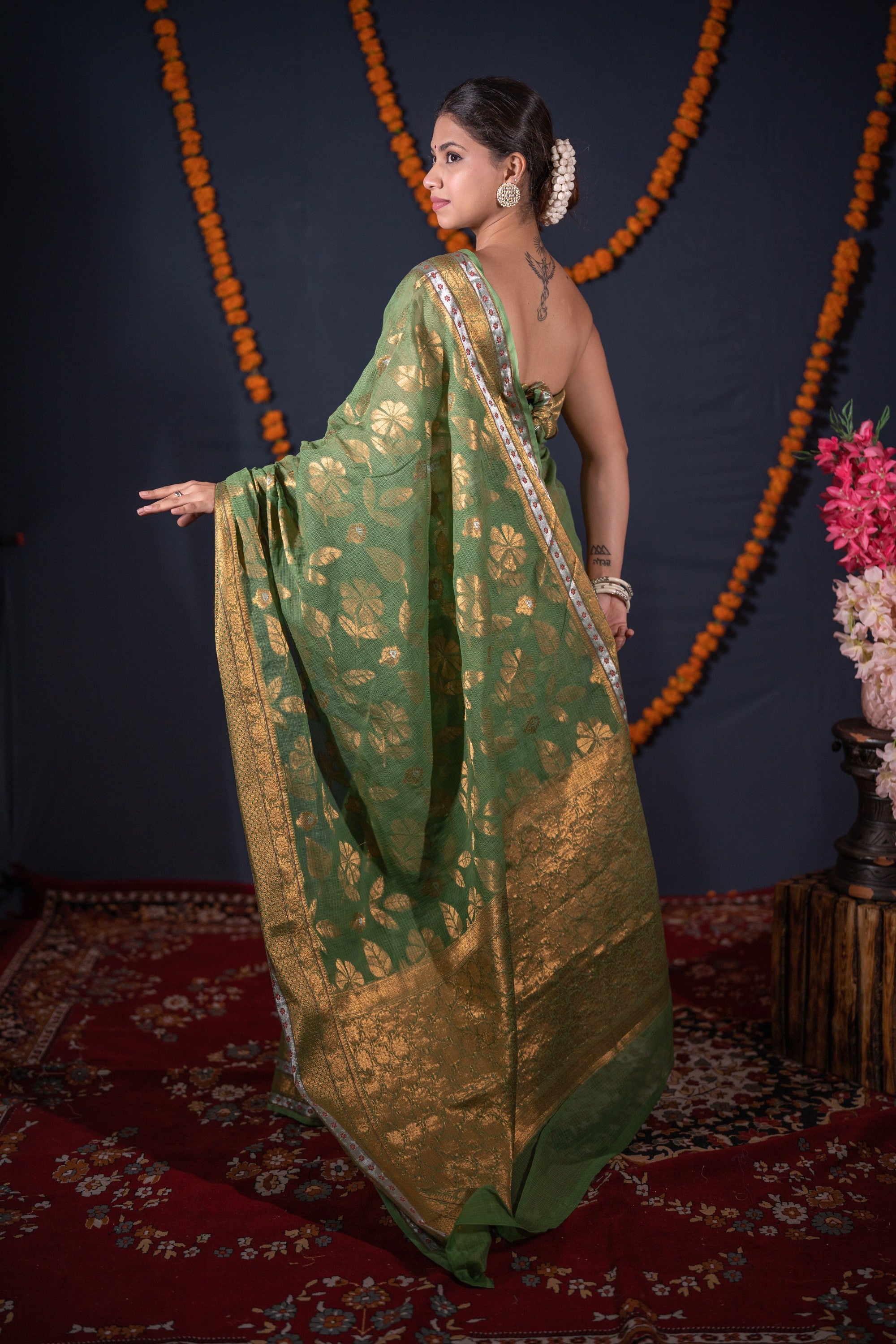 The golden woven border enhances the rich texture of the saree, adding a touch of luxury to its vibrant green hue. The delicate floral patterns gracefully woven into the fabric create a mesmerizing visual appeal, making this saree an exquisite choice for the modern woman who cherishes heritage.