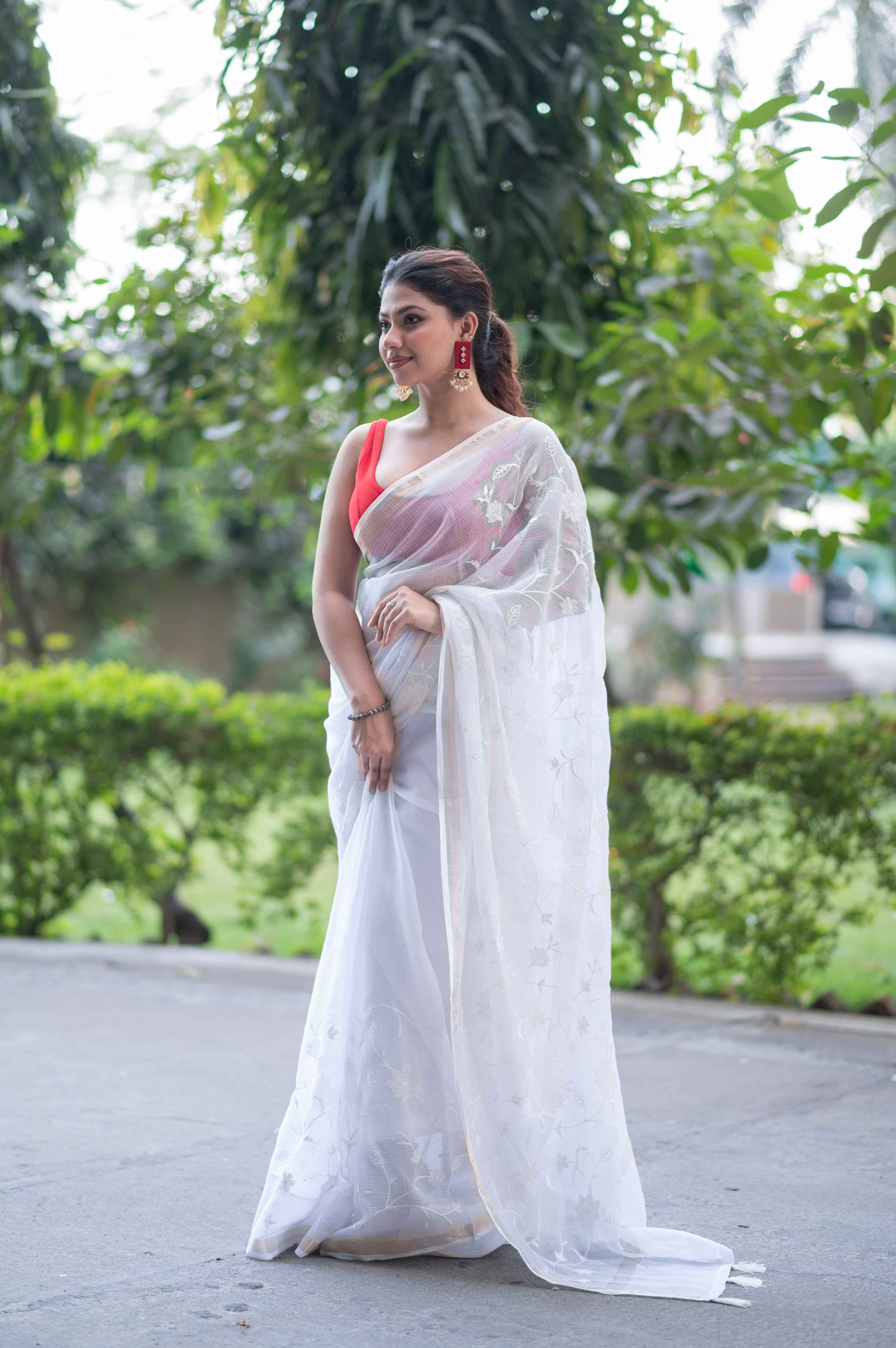 Introducing our enchanting Snowflakes White Kota Doria Saree, adorned with delicate embroidery along the bottom and pallu.