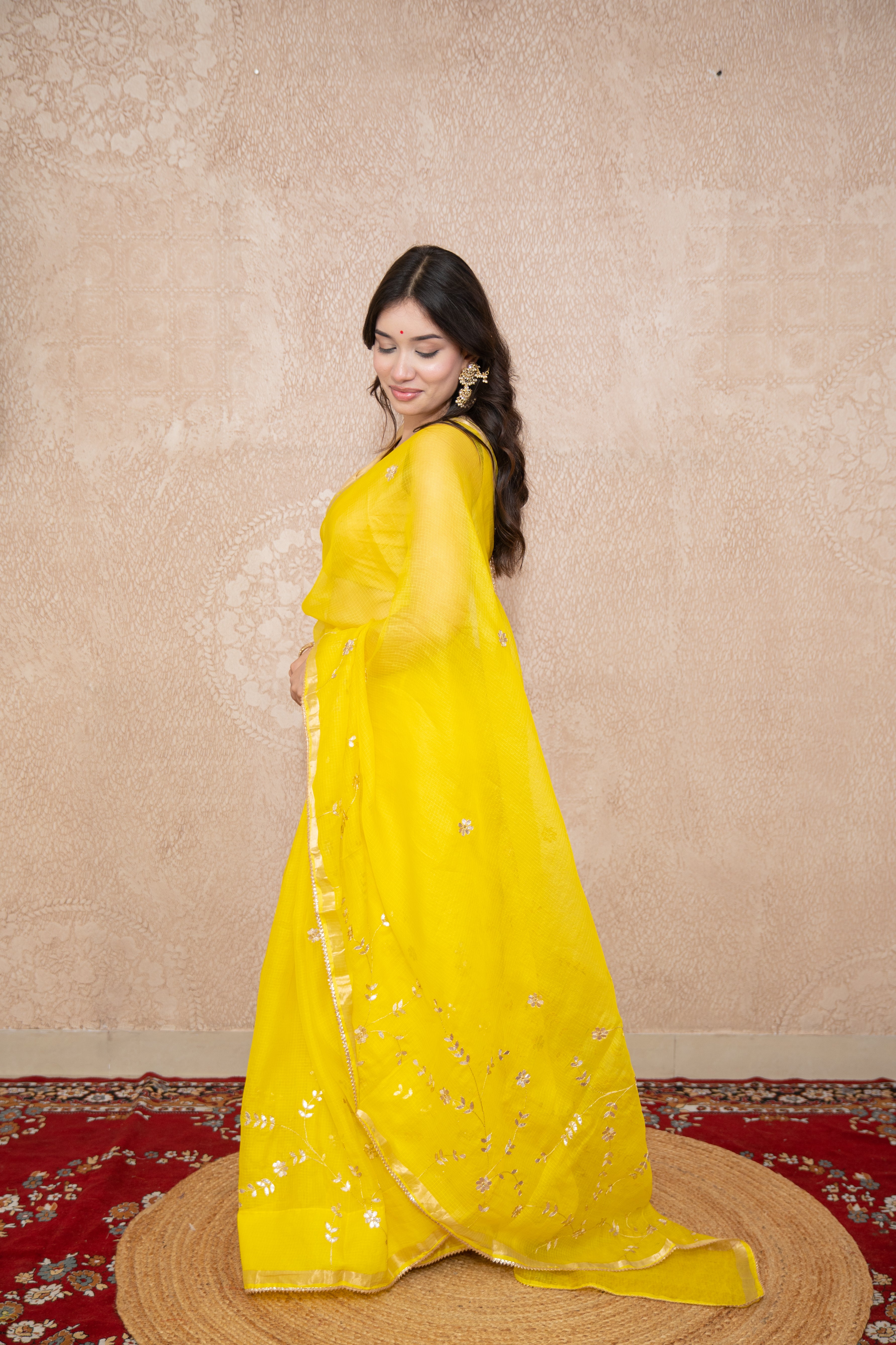 Yellow Floral work Gota Patti saree with floral jaal on pallu