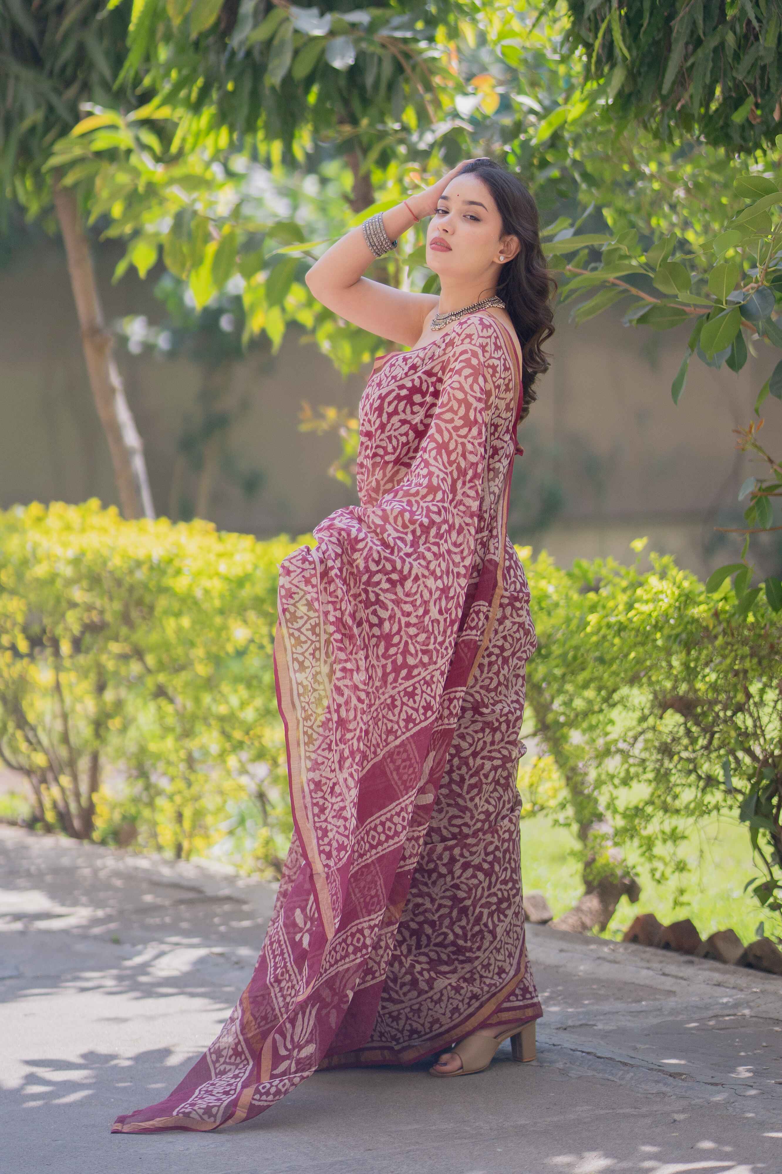 Expertly woven in premium Kota Doria fabric, this saree offers an airy, lightweight drape, ensuring all-day comfort. The fine cotton-silk blend enhances its durability while maintaining the signature sheer texture of Kota Doria. The detailed white leafy print is a tribute to nature’s elegance, adding a touch of charm to this rich maroon base. Finished with meticulous fall and pico work, this saree is ready to wear straight out of the box.