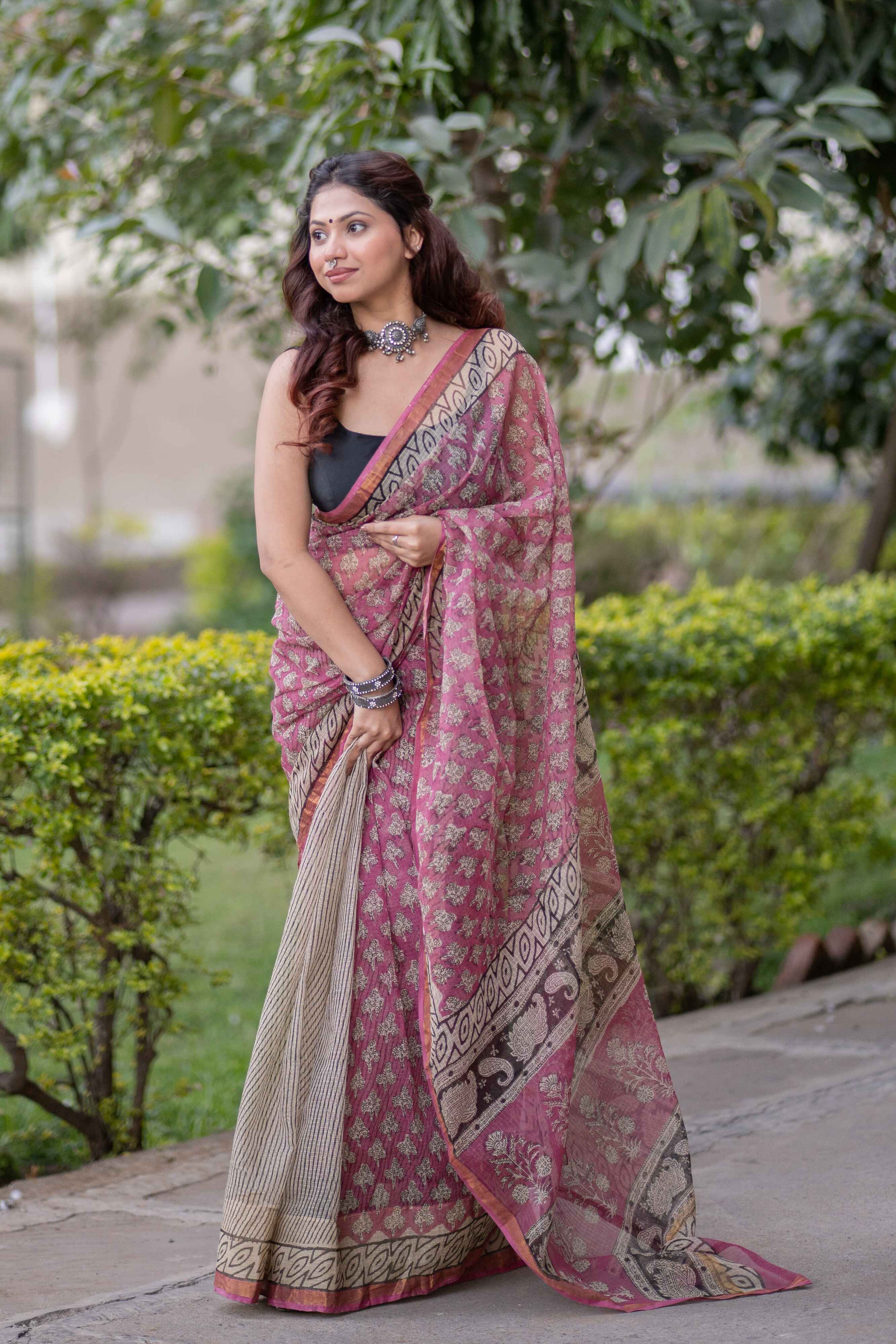 Handwoven from pure Kota Doria fabric, this saree showcases the finesse of Indian artisans. The lightweight weave, adorned with subtle cream stripes, ensures breathability and comfort. The pink floral pallu, meticulously designed, enhances its aesthetic appeal, making it a perfect pick for both day and evening occasions.