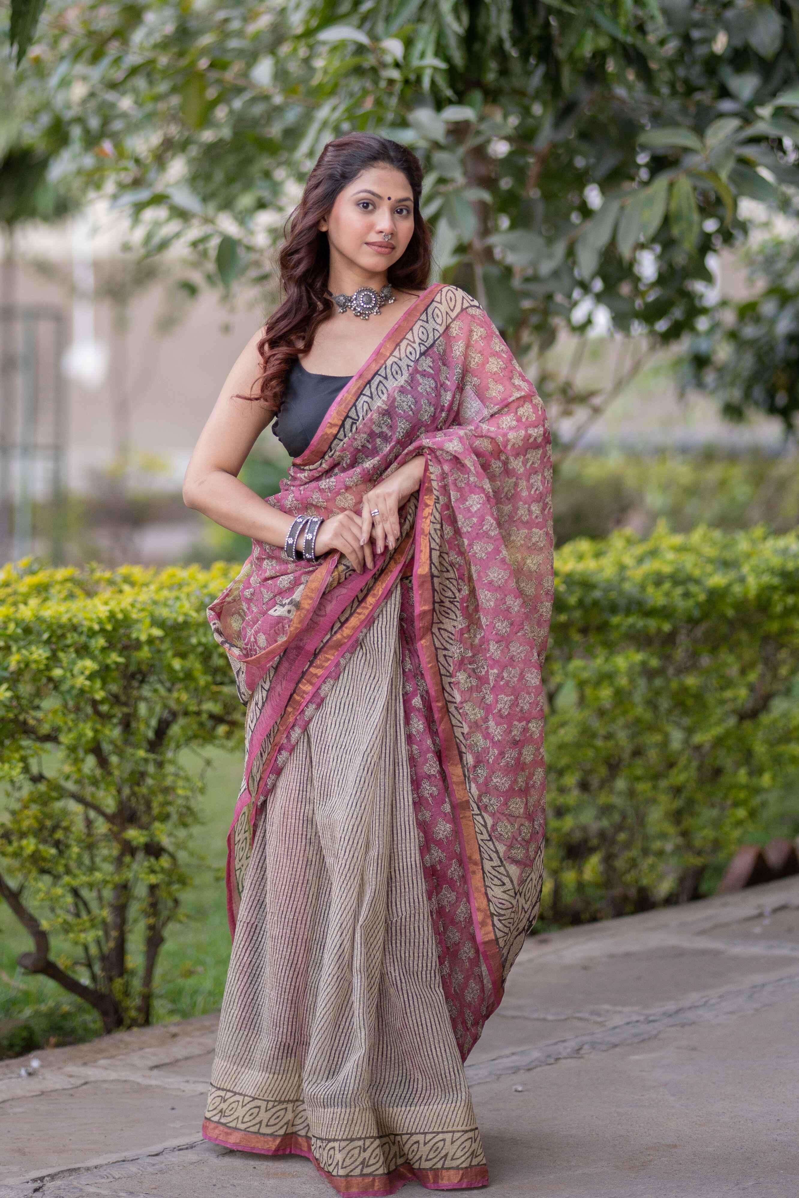 Drape yourself in the elegance of Suhavini, a mesmerizing blend of tradition and contemporary charm. This cream-striped Kota Doria saree is a timeless masterpiece, exuding sheer sophistication with its delicate texture and airy feel. The highlight of this saree is its exquisite pink floral pallu, adding a touch of femininity and grace. Part of our exclusive Ashi Collection, this saree is designed to make you stand out effortlessly.
