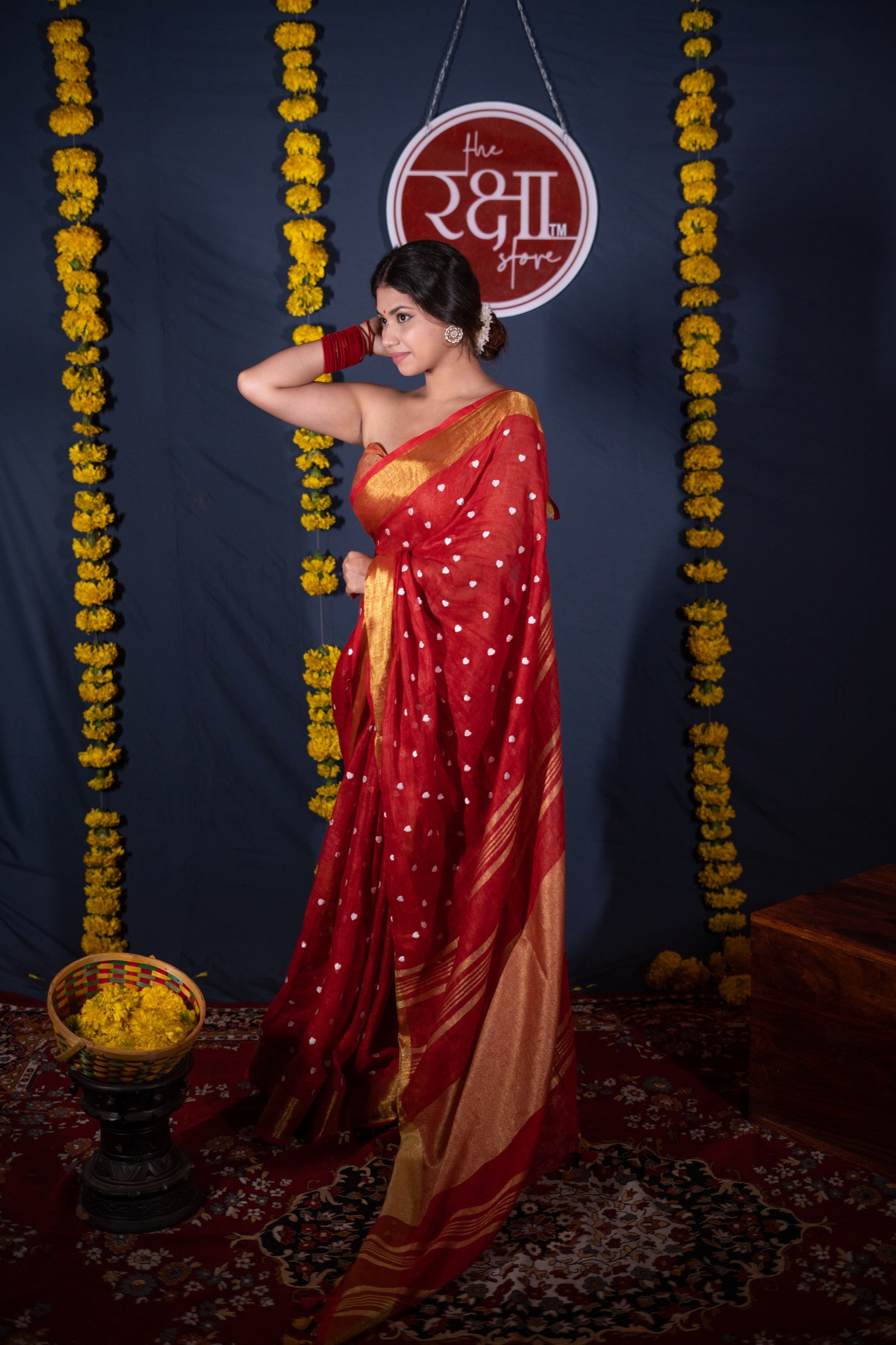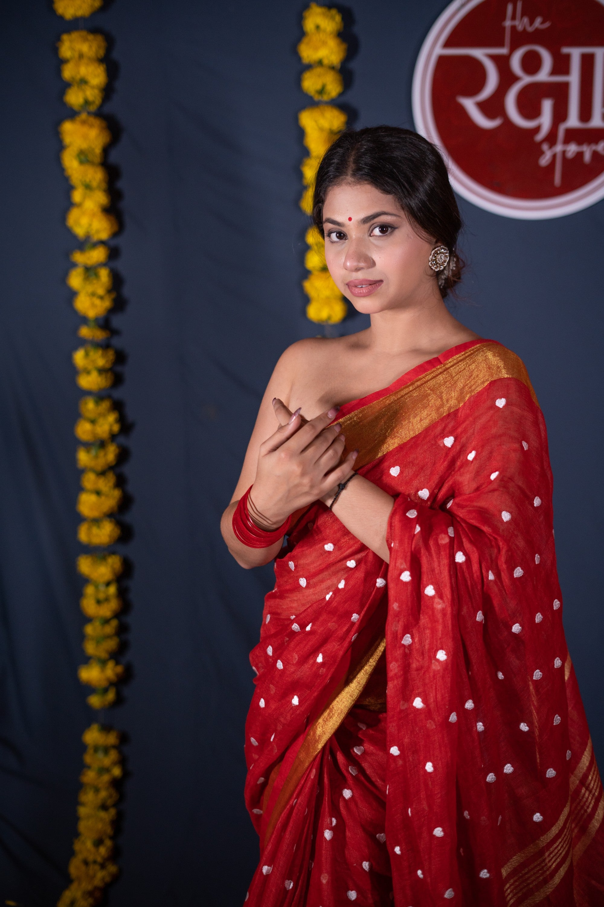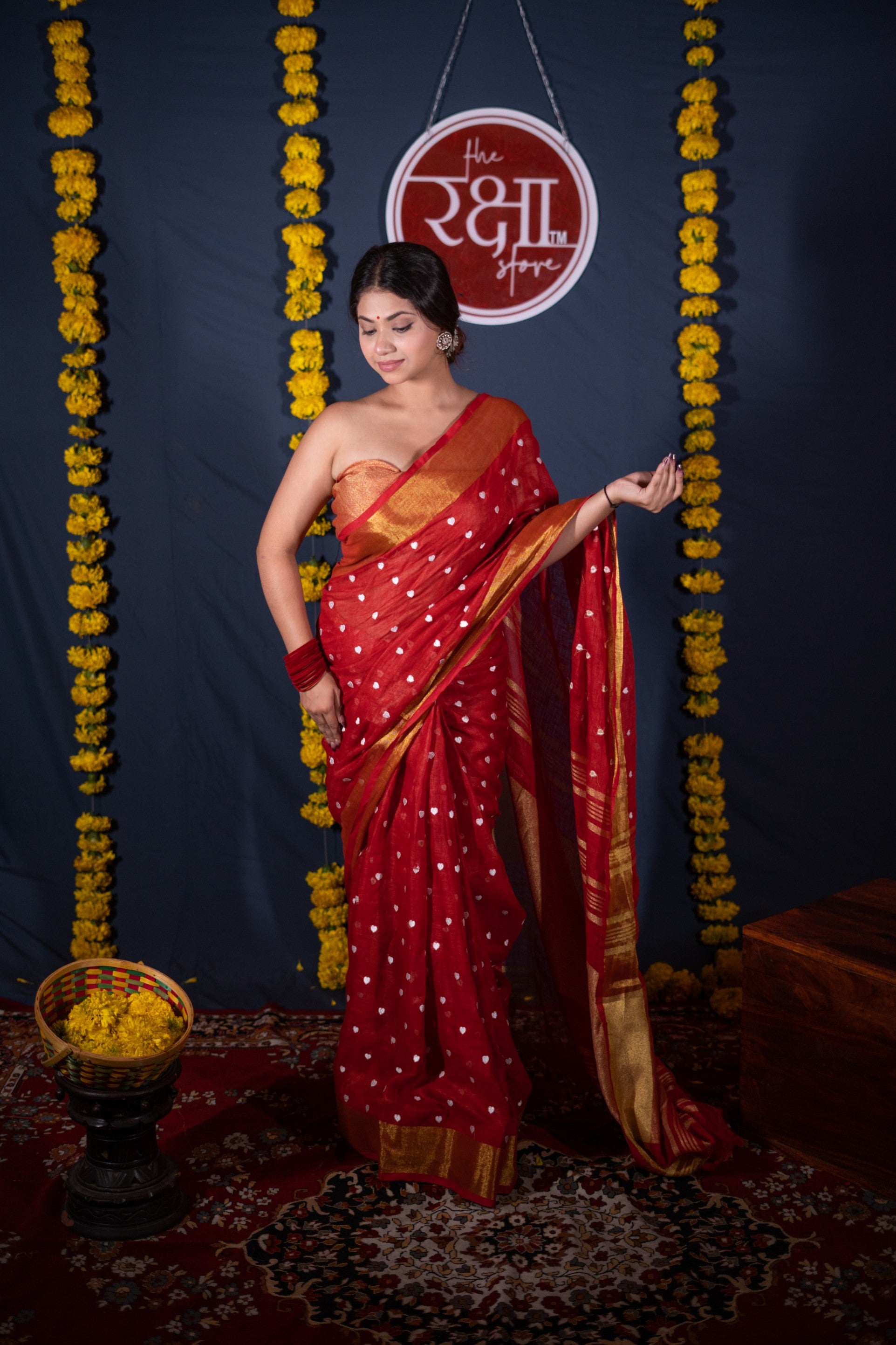 Pair the Sukriti Red Heart Linen Saree with gold jewelry and heels for a regal look, or opt for pearl accessories for a softer, romantic touch.