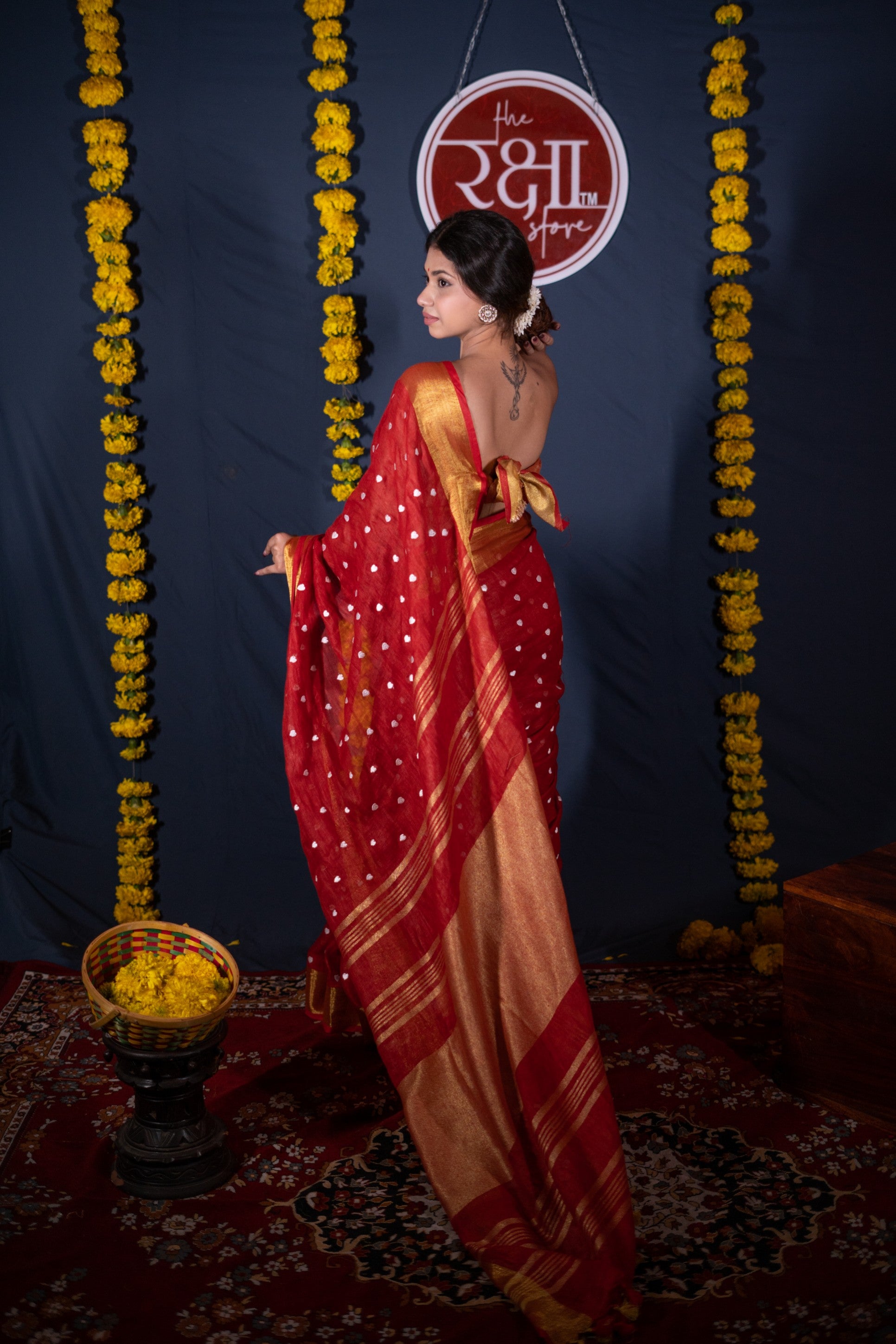 Add a touch of charm and elegance to your wardrobe with the Sukriti Red Heart Linen Saree. Crafted from pure linen fabric, this saree is a perfect blend of traditional craftsmanship and modern design, making it a must-have for festive occasions, romantic evenings, or special celebrations.