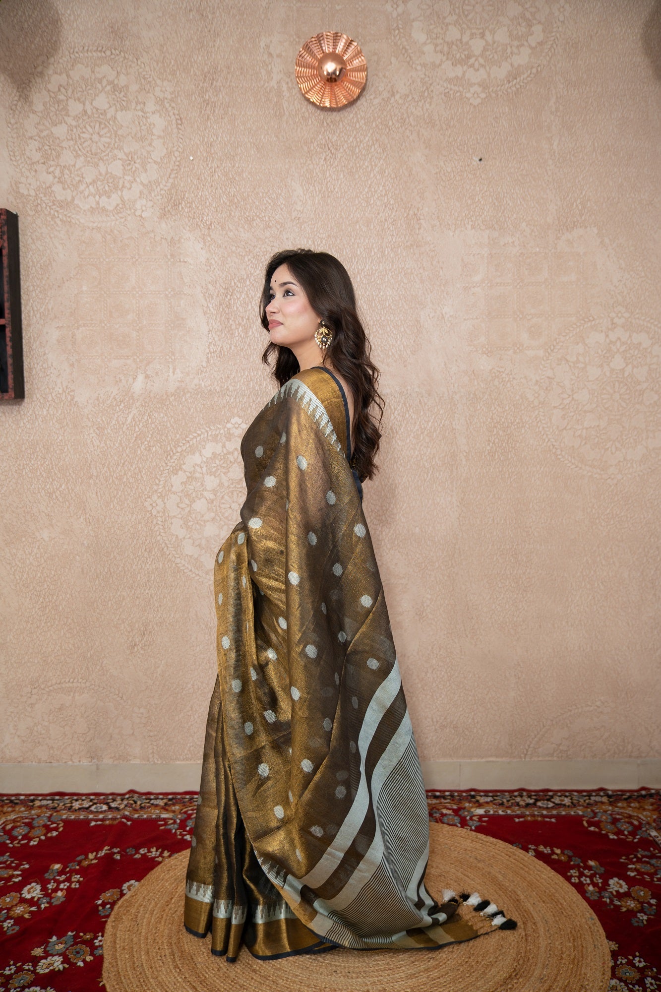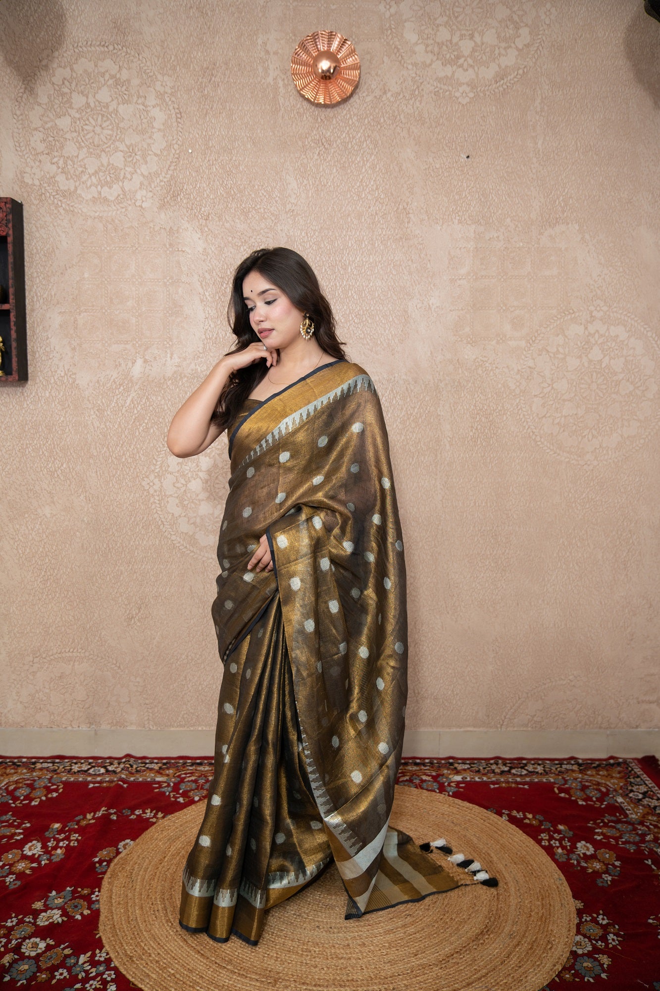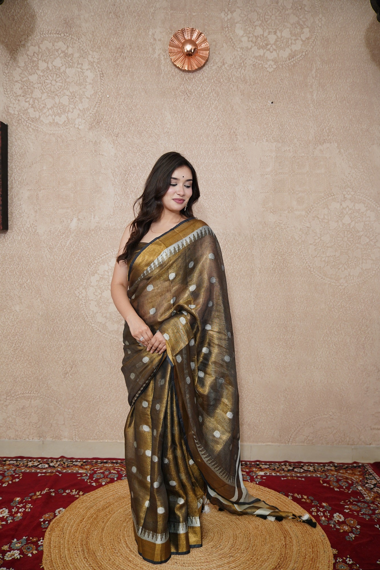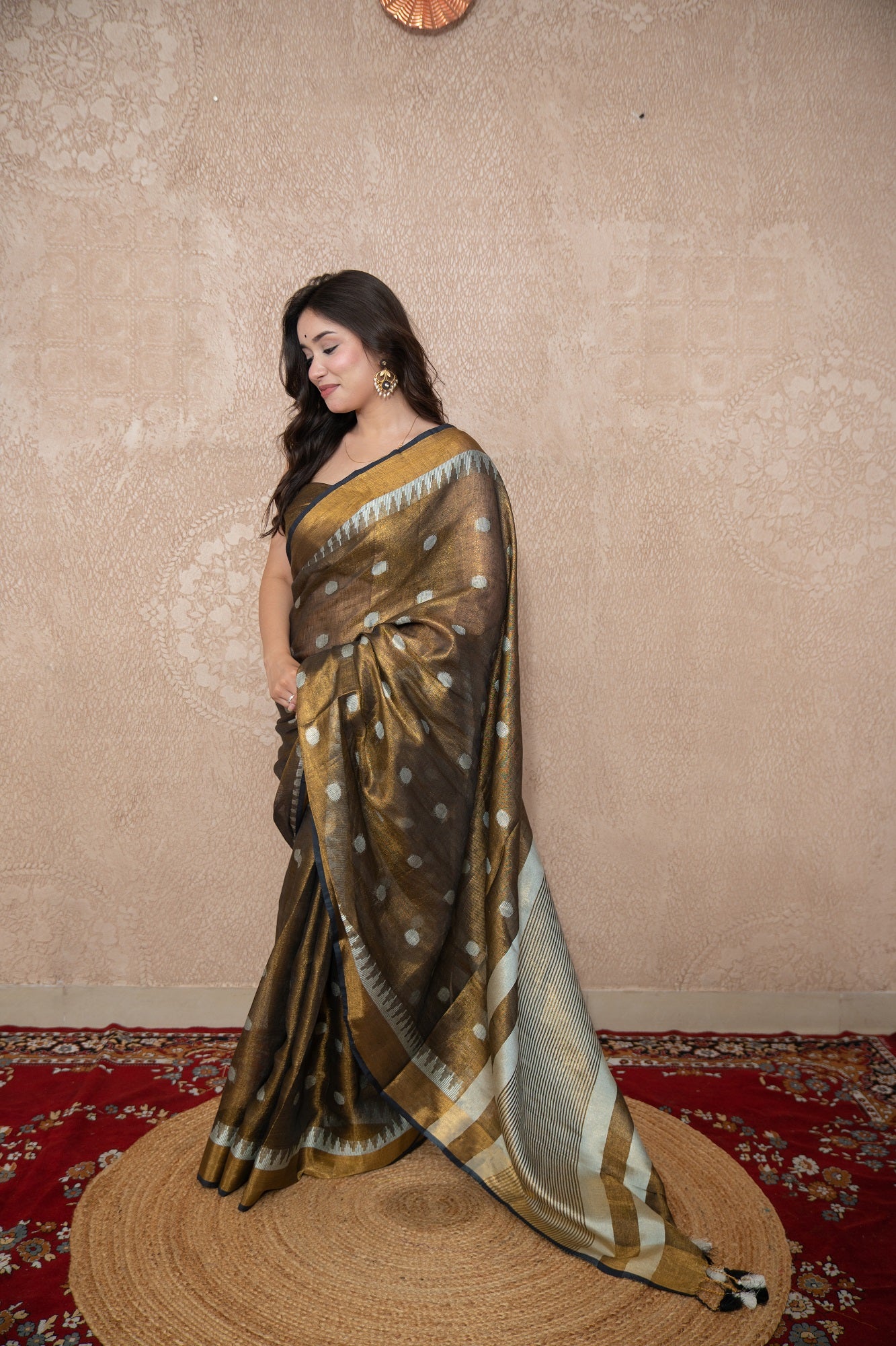 Introducing Sunahli, a radiant Copper Zari Linen Saree that embodies grace, luxury, and timeless tradition. From our exclusive “Sone ki Abha” collection, this saree brings together earthy richness and festive shimmer—crafted for women who appreciate understated glamour with an artisanal soul.