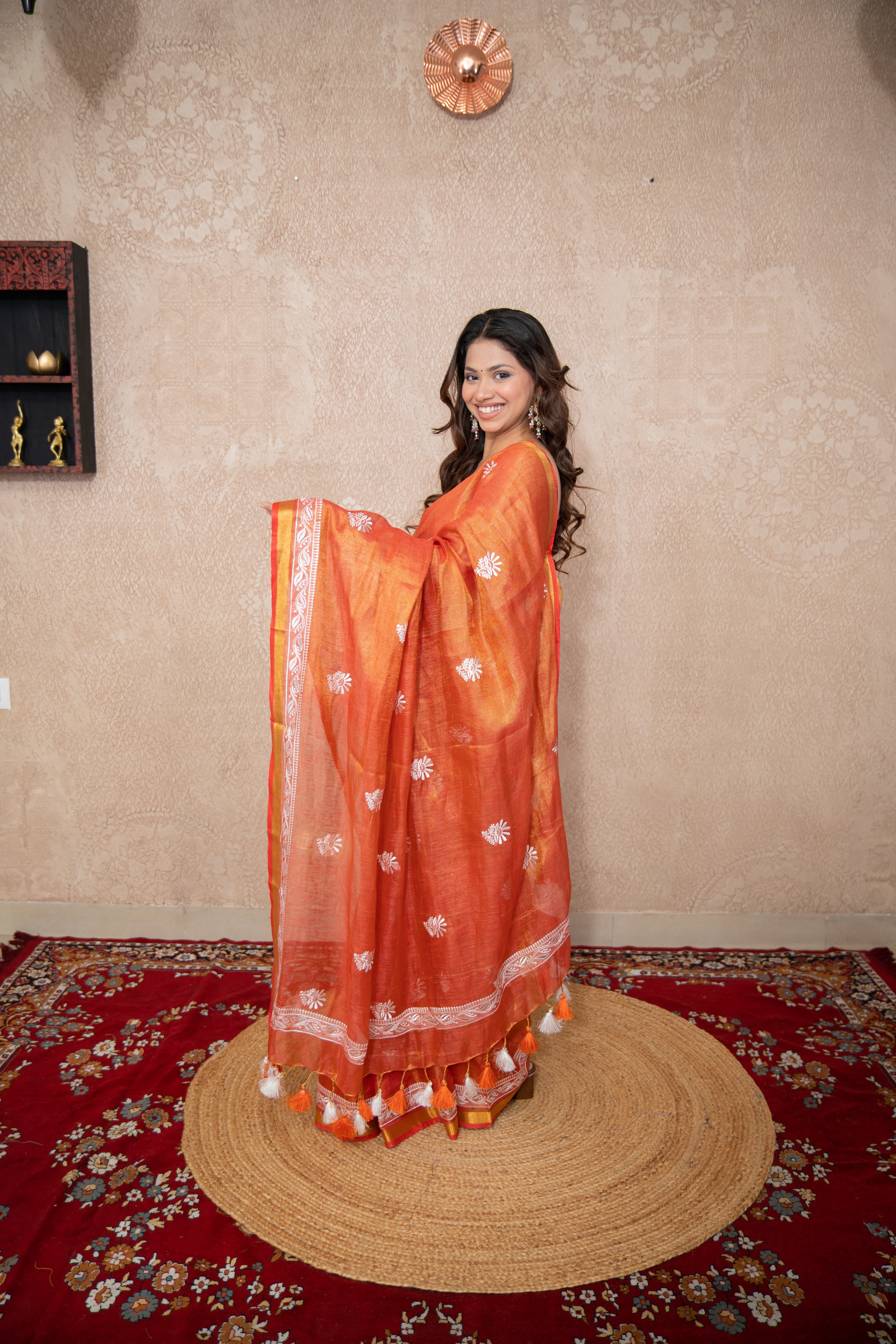 Orange Zari Linen Saree with white embroidery