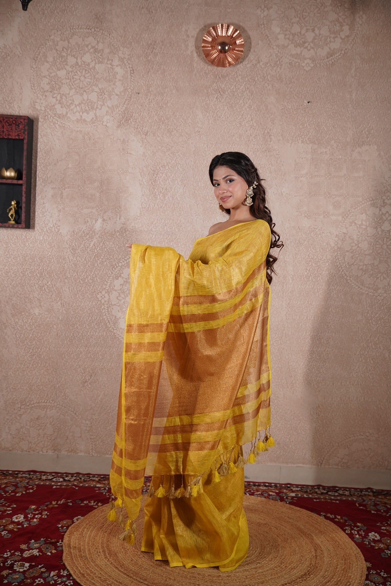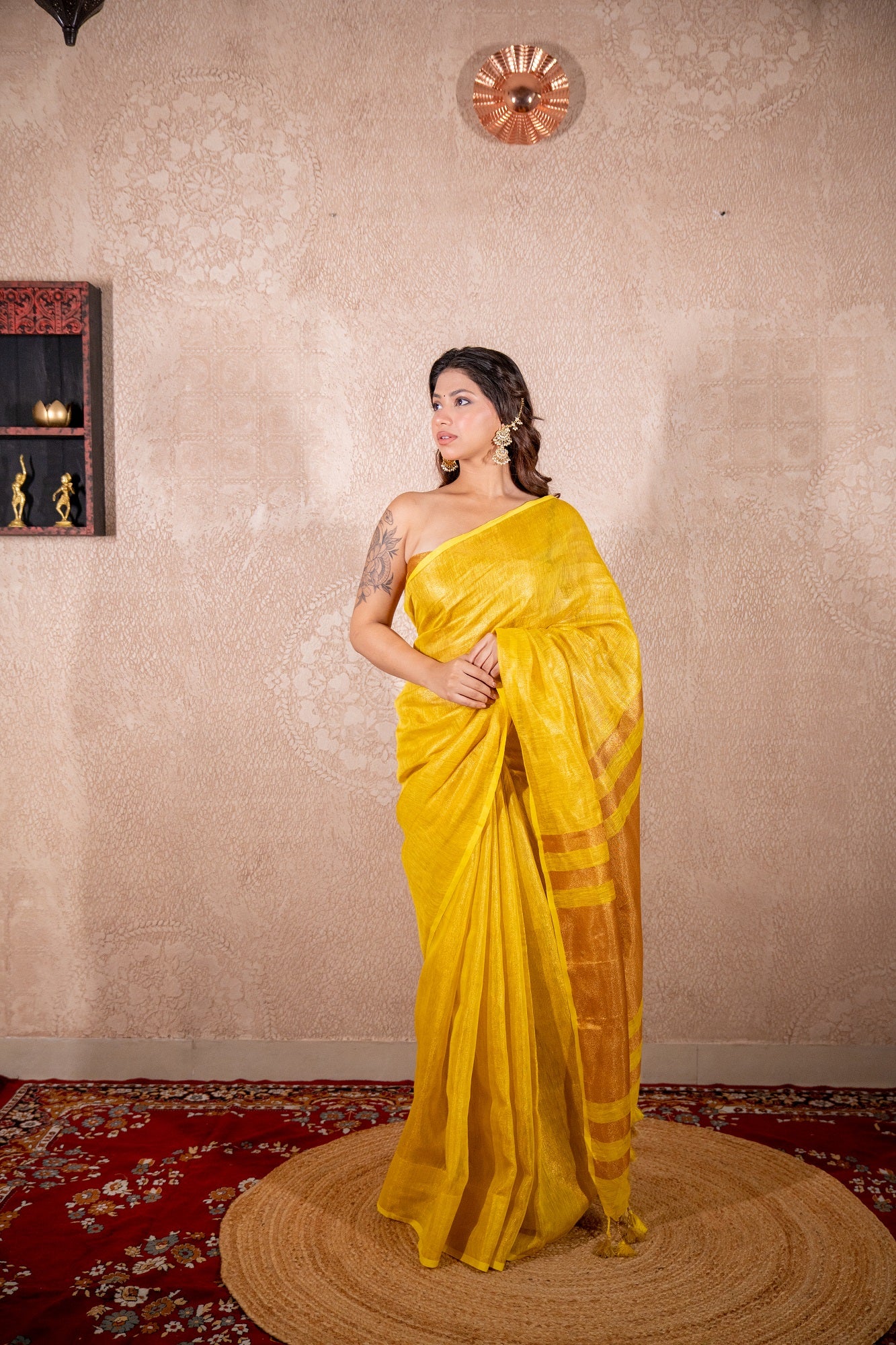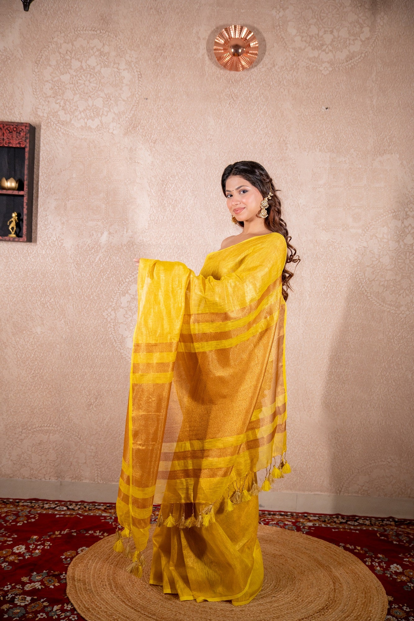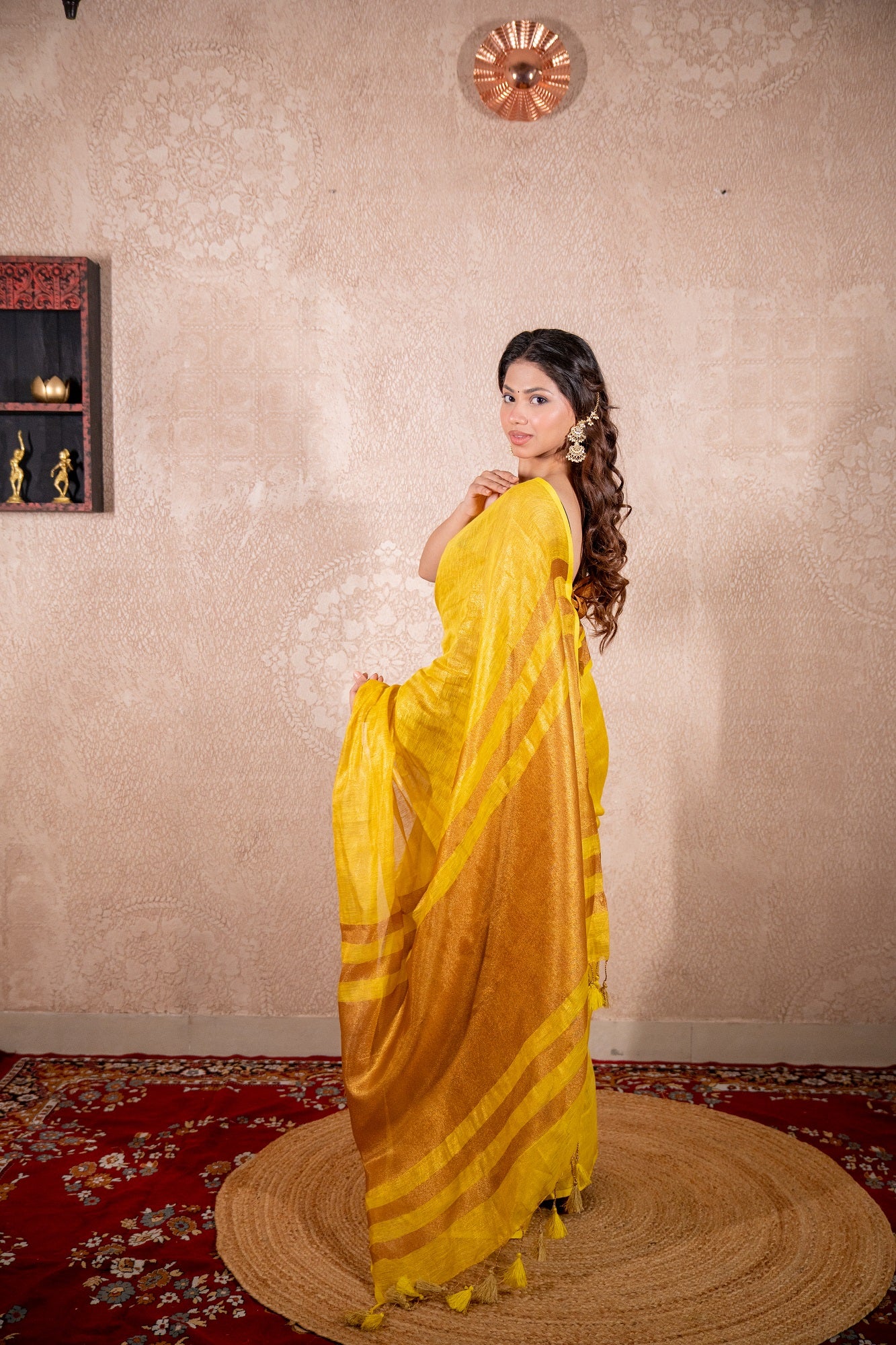 Radiate warmth and joy with Swara, a sunshine-hued Yellow Saree with Zari Stripes that celebrates the vibrance of Indian tradition. A bright addition to our "Sone ki Abha" collection, Swara is designed for moments filled with light—haldi ceremonies, festive mornings, or any day that calls for effortless elegance.