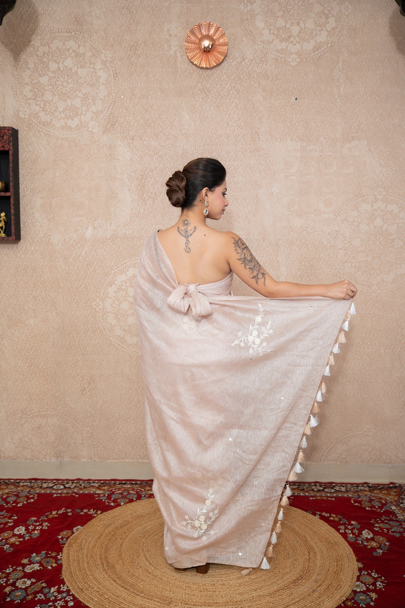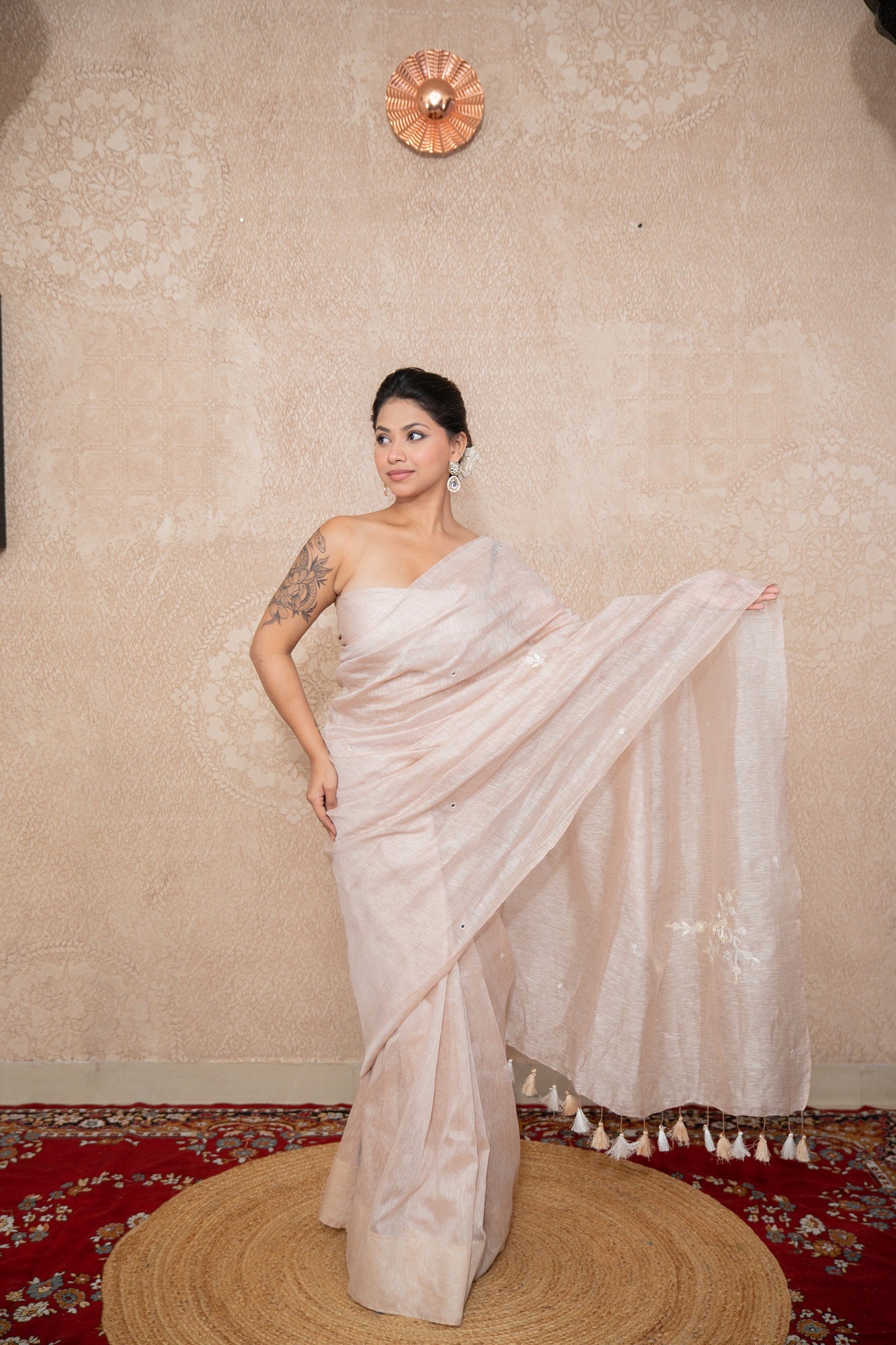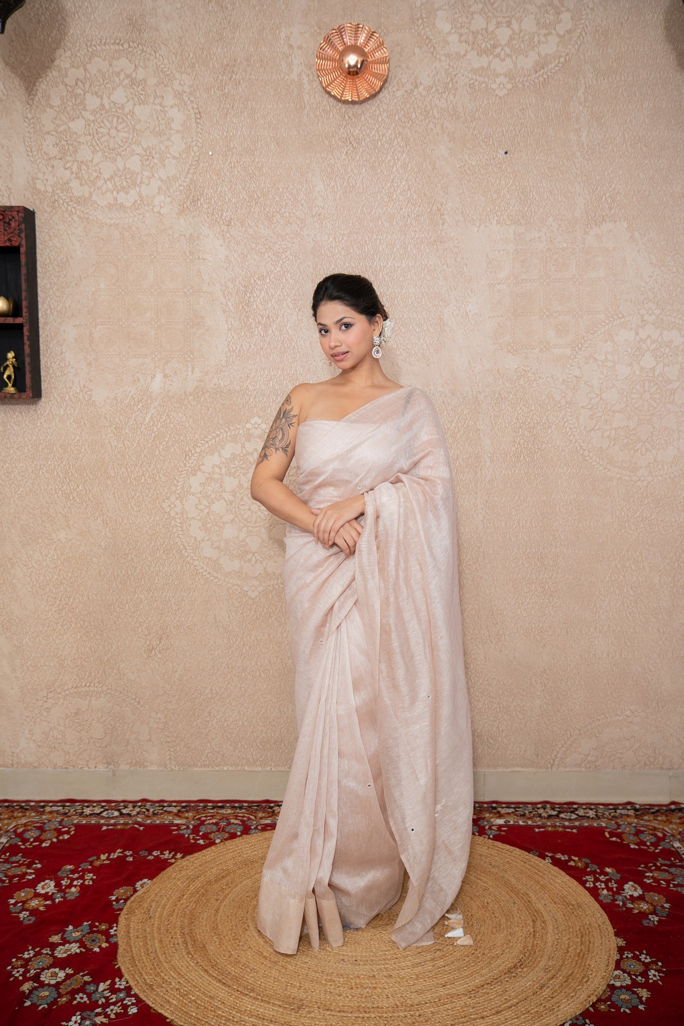 Tanirika is made from a premium silk-linen blend, offering the richness of silk with the breathable comfort of linen. The neutral beige tone makes it a versatile choice across seasons and settings, while the fabric’s natural sheen adds a gentle radiance. Expertly finished with fall and pico, this saree is thoughtfully tailored and ready to drape.