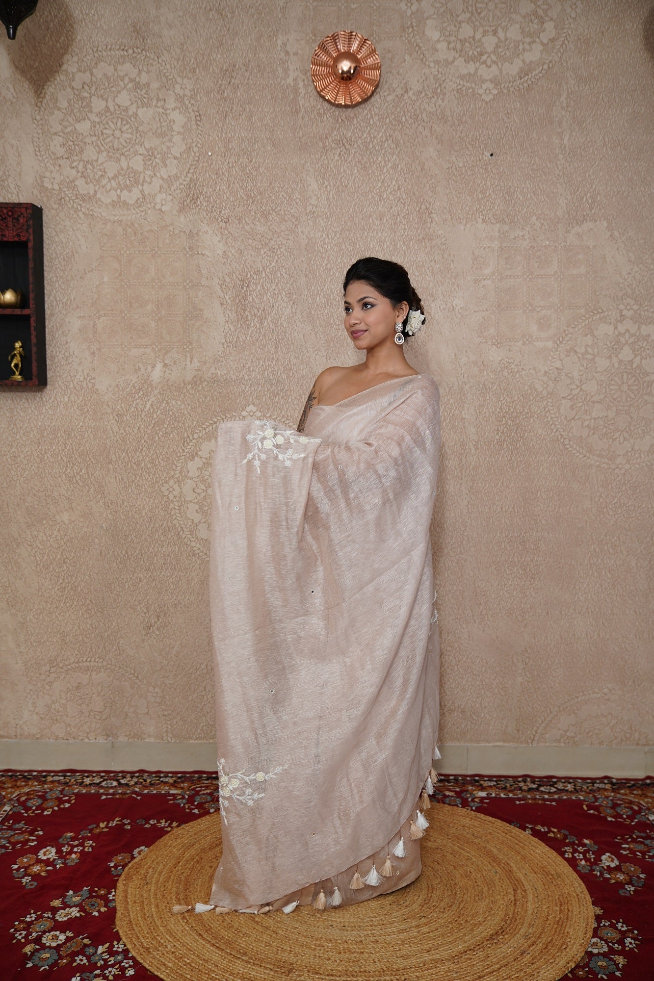 Understated, timeless, and quietly elegant — Tanirika is a graceful Beige Silk Linen Saree designed for women who find power in poise and simplicity. A refined pick from our signature "Sone ki Abha" collection, Tanirika is ideal for day functions, office wear, or cultural occasions where minimalism speaks volumes.