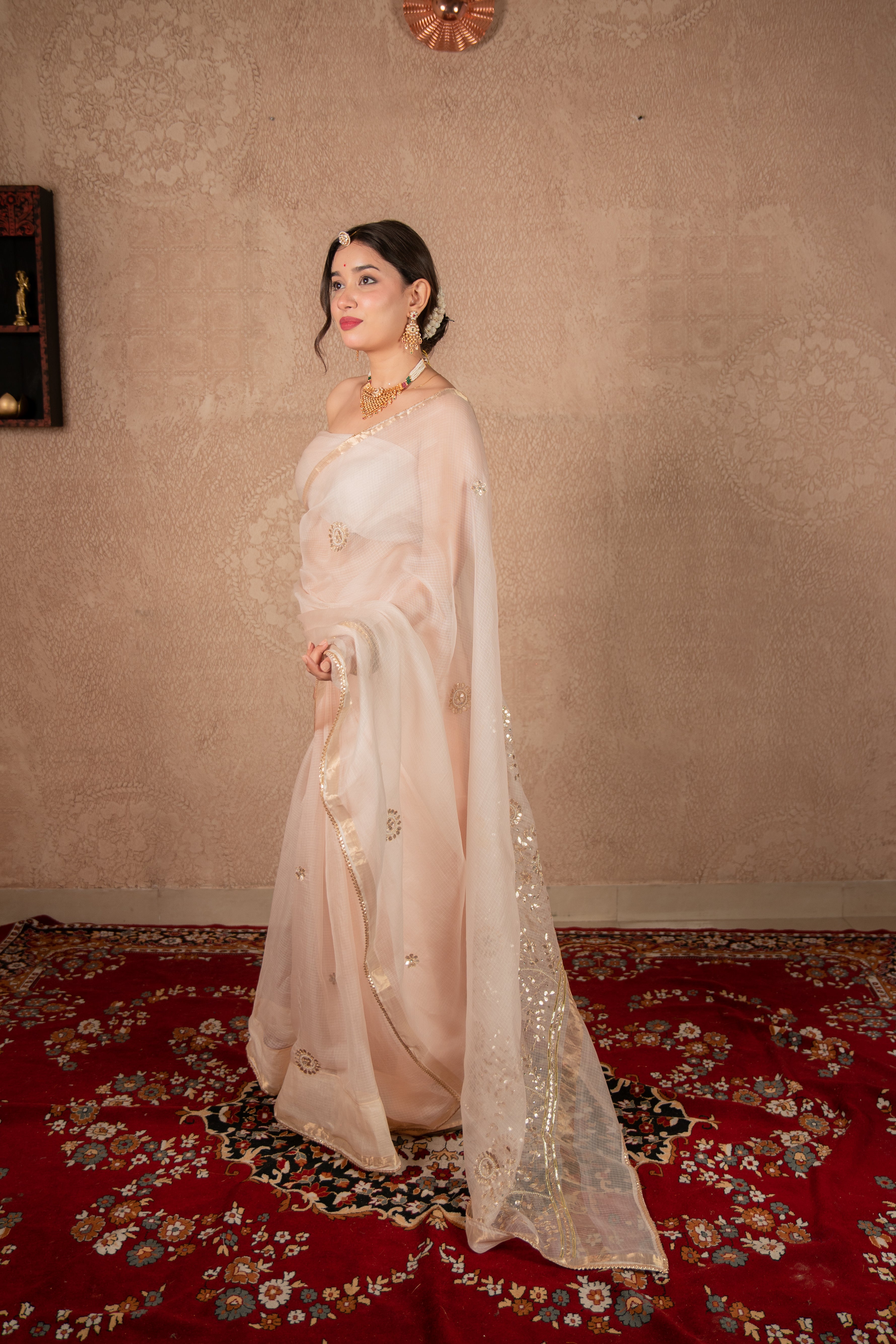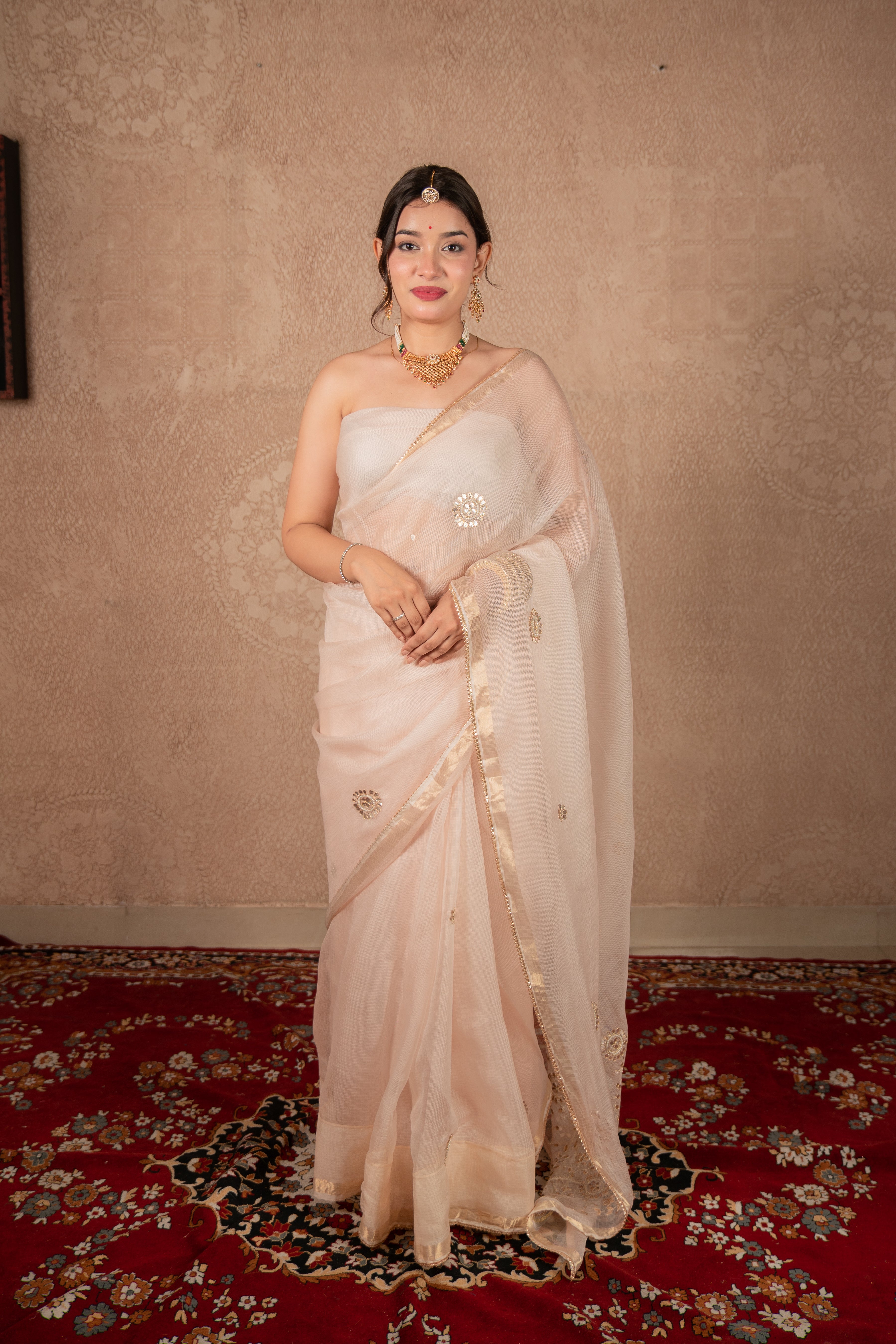 Exude timeless grace with this Cream Kota Silk Saree featuring elegant gota jaal work on the pallu and a delicate lace border. Woven from airy and lightweight Kota Silk, it drapes beautifully, offering both comfort and sophistication. The soothing cream shade adds subtle charm, while the intricate gota embroidery brings festive richness and traditional artistry.