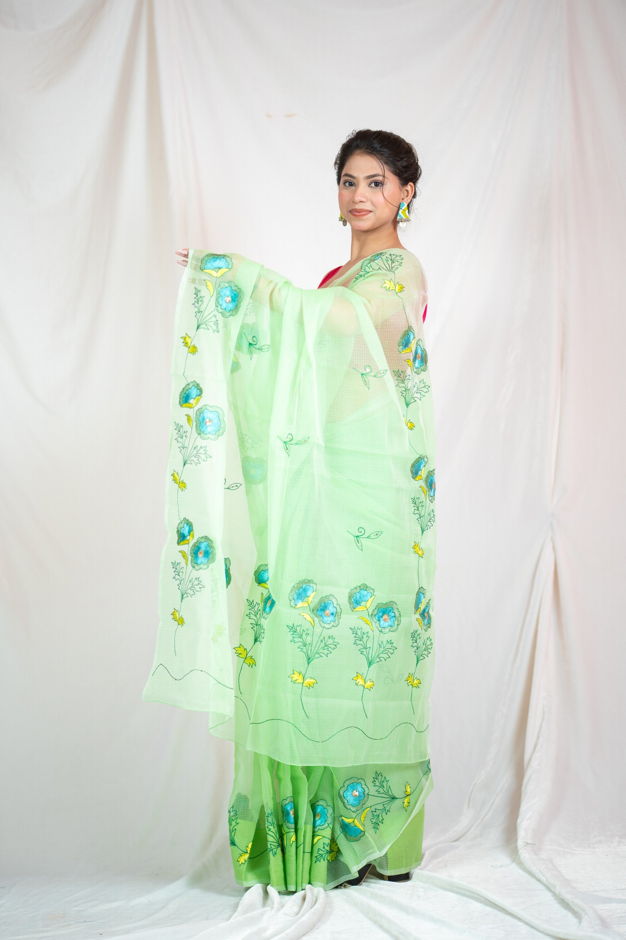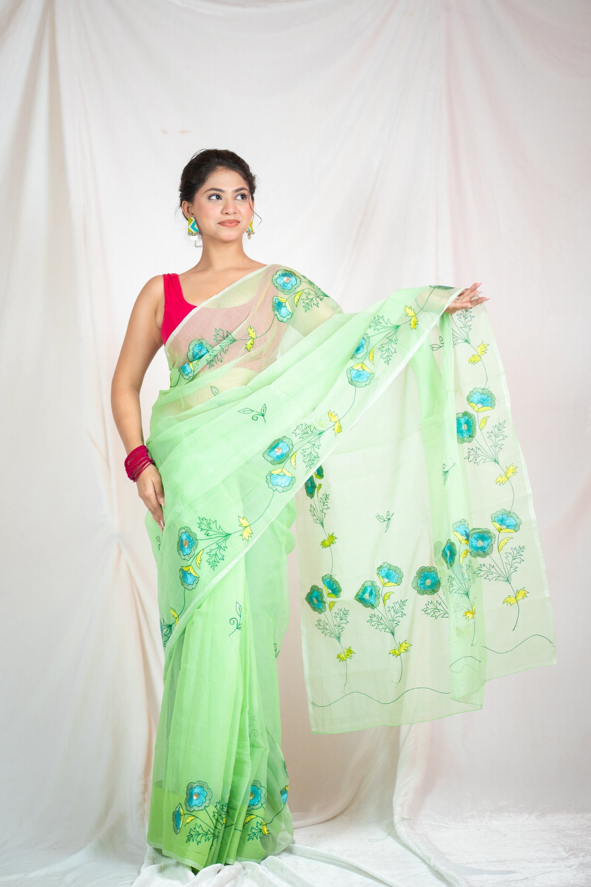 Imbued with delicate hand embroidery in serene shades of blue. A backdrop of refreshing mint green, this saree blooms with intricate floral motifs. Crafted for the summer, its lightweight Kota Doria fabric ensures a breathable embrace on warm days.