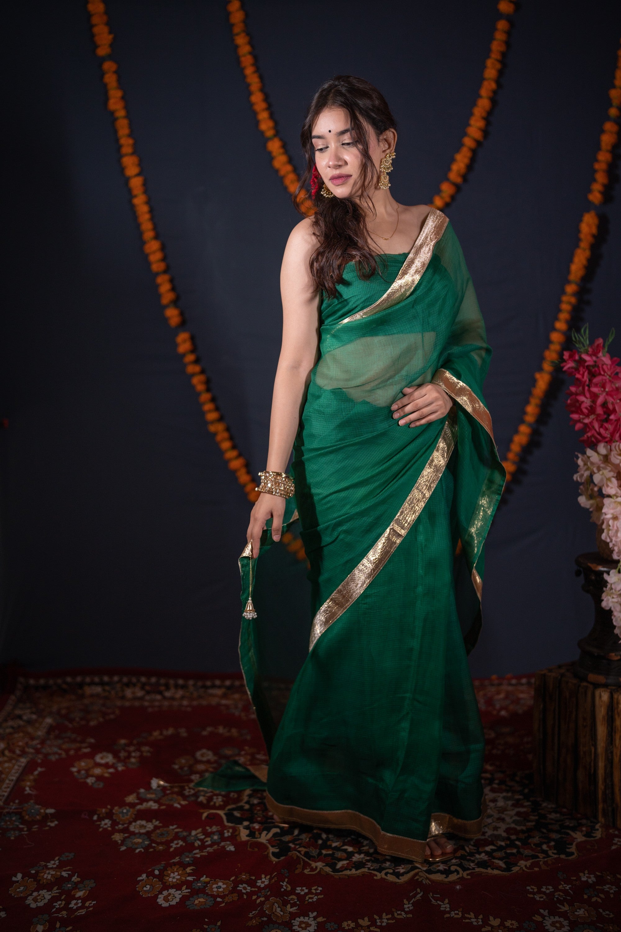 Elevate your ethnic wardrobe with the Trina Green Kota Silk Saree, a beautiful fusion of traditional craftsmanship and contemporary elegance. This dark green saree is crafted from pure Kota silk, known for its lightweight texture and exquisite drape, making it the perfect choice for any occasion.