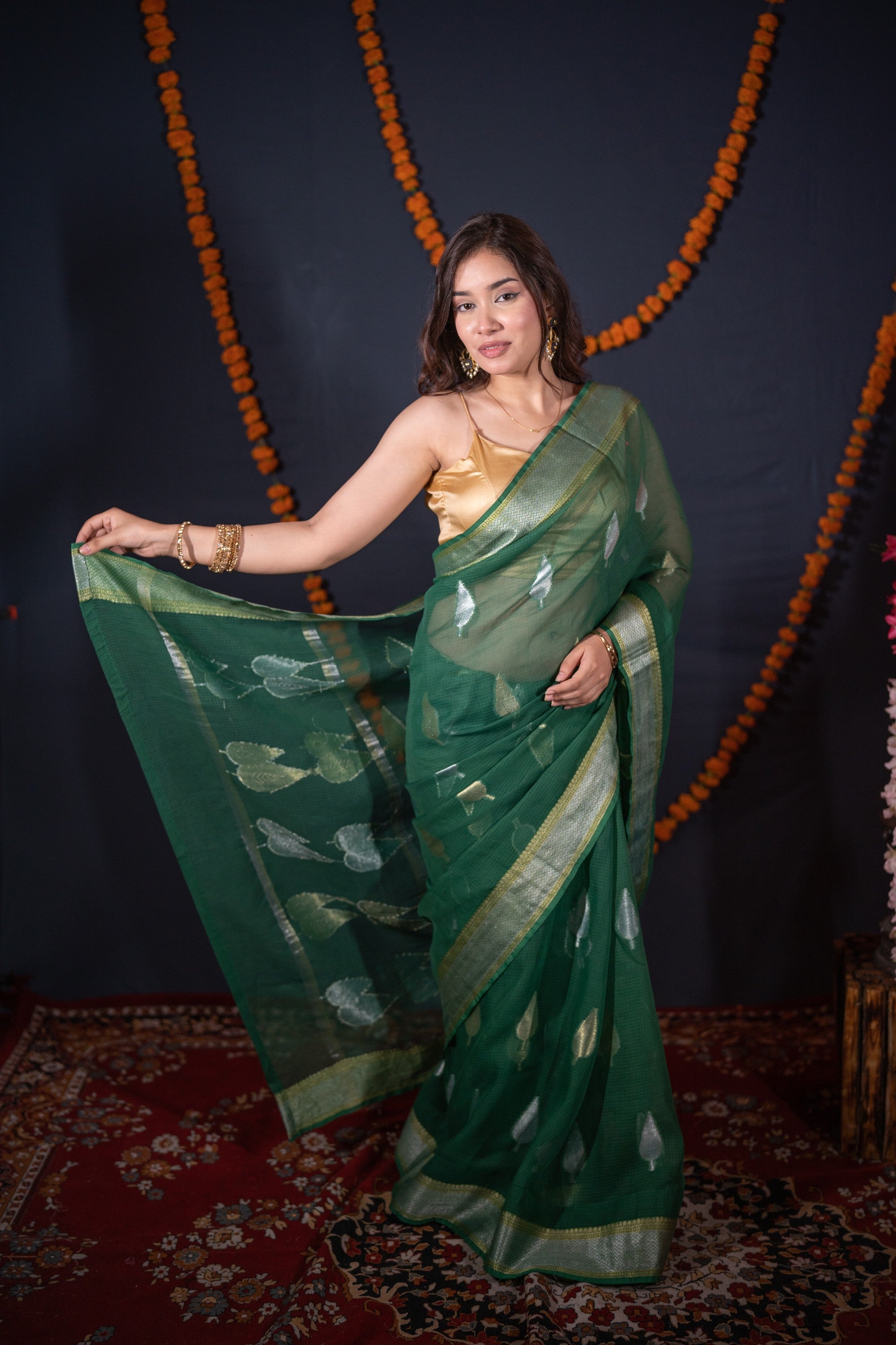 Elevate your traditional wardrobe with the timeless elegance of the Tulika Green Kota Doria Saree, a perfect blend of grace and sophistication. Crafted from premium green cotton fabric, this saree features an exquisite woven leaves silver border, adding a touch of nature-inspired beauty and shimmering elegance to your ensemble.
