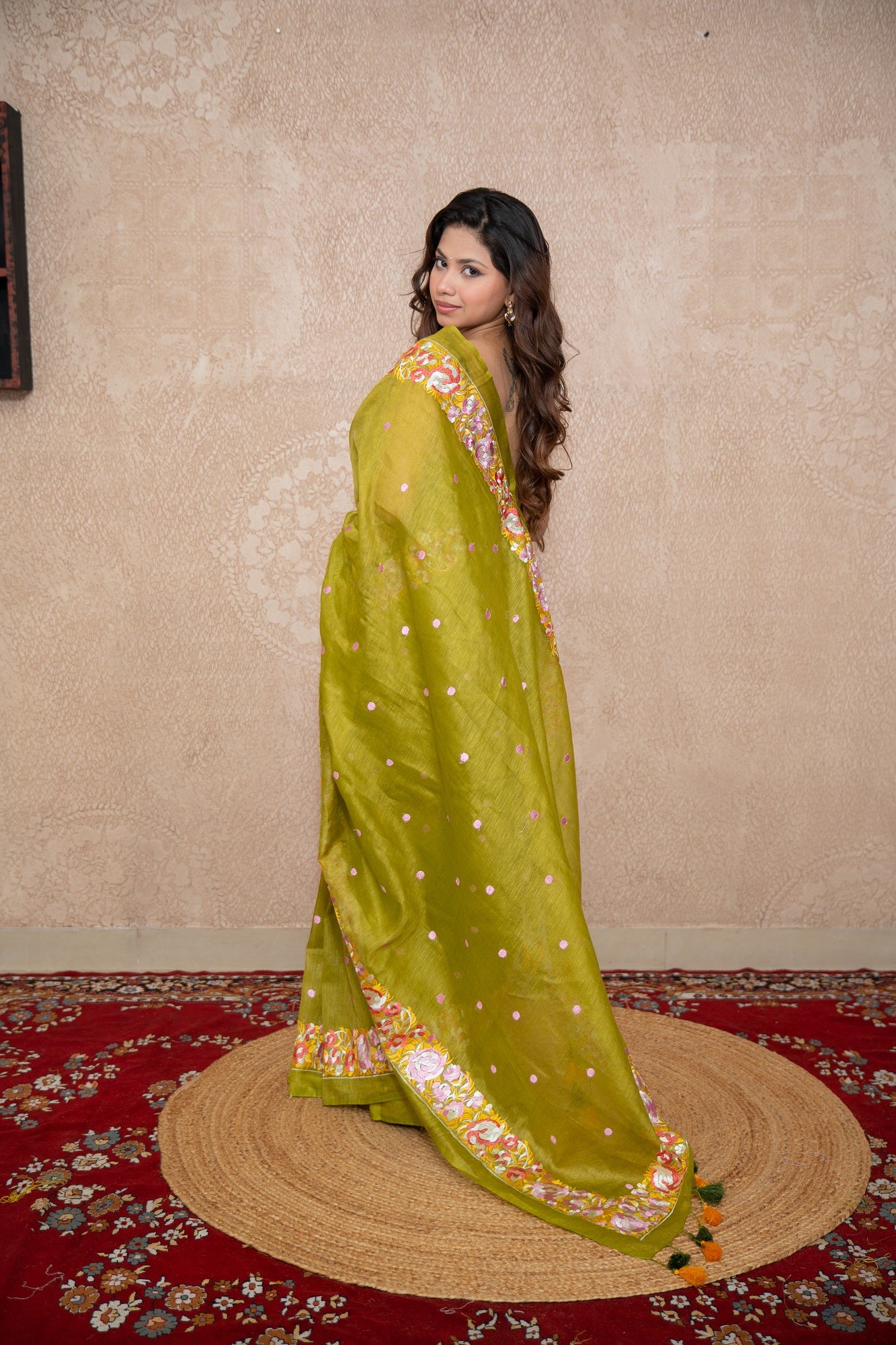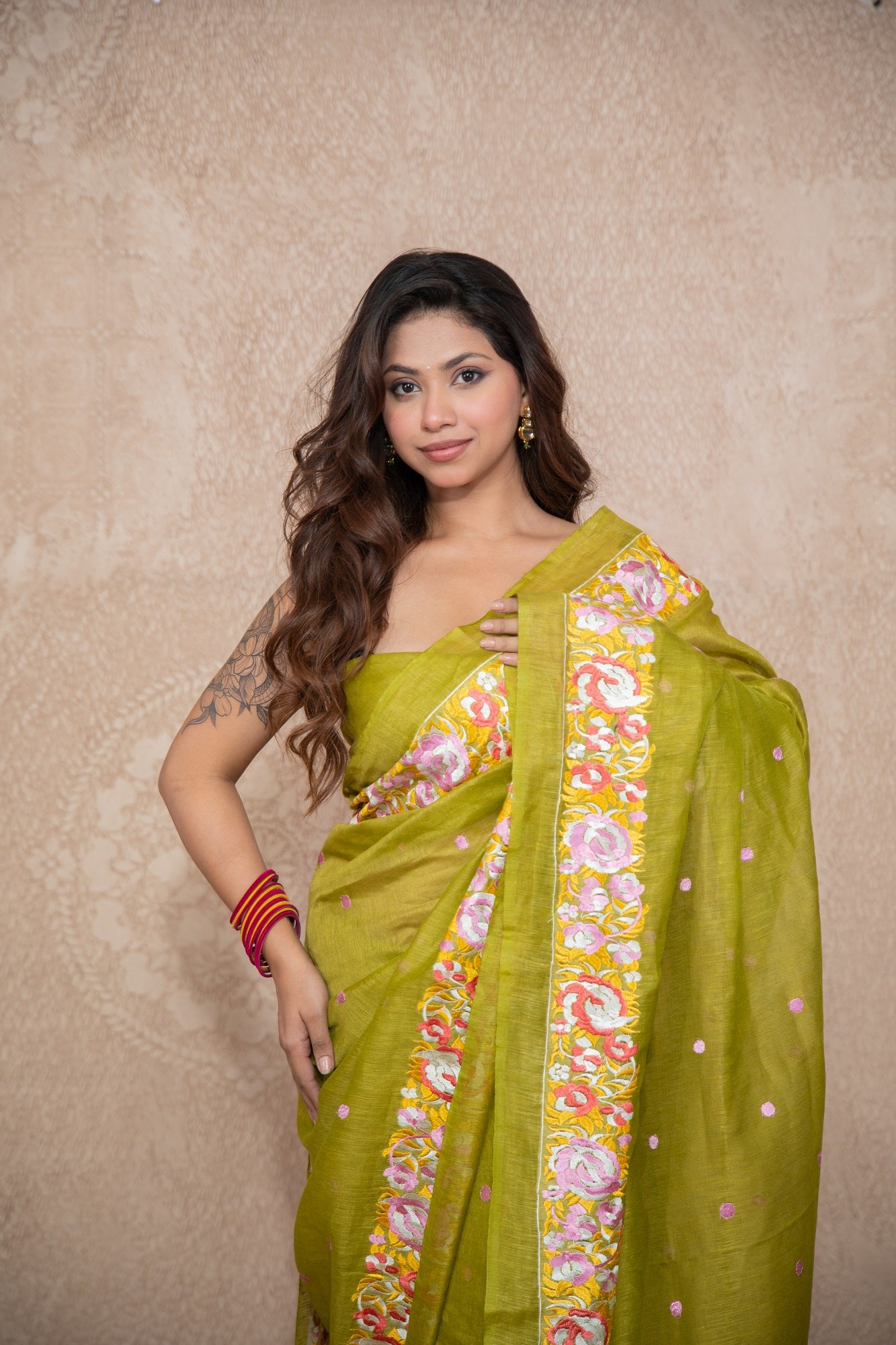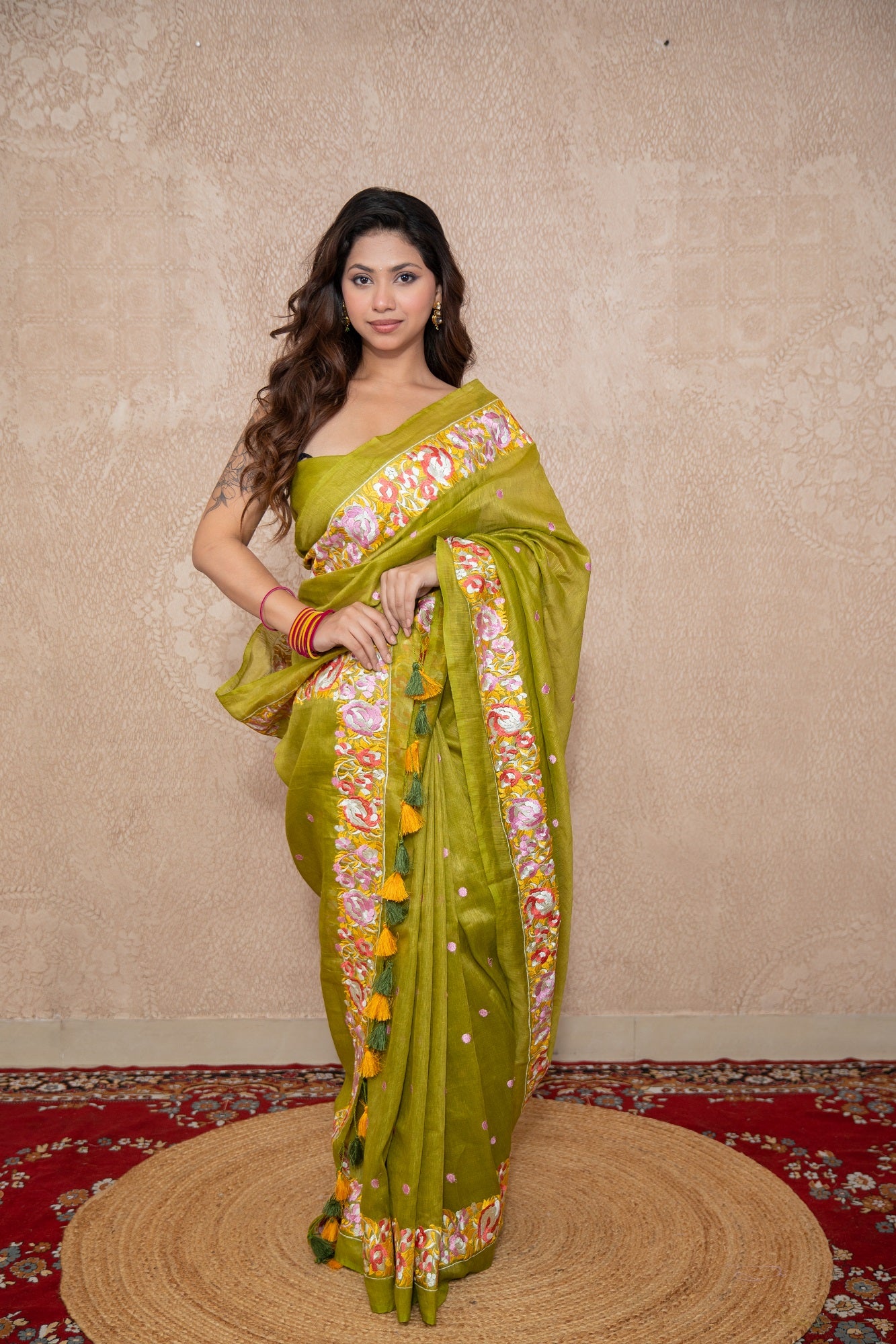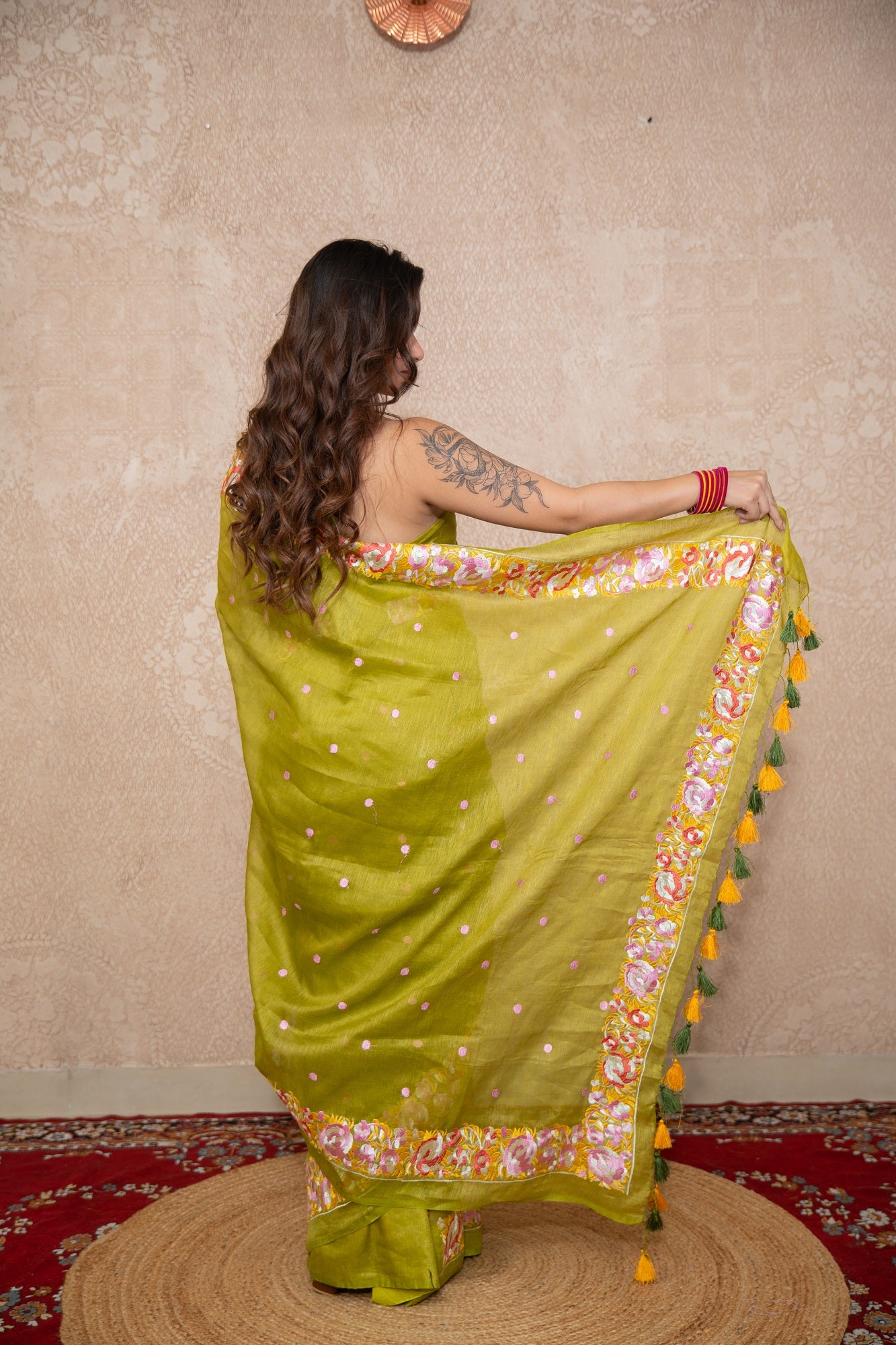 Fresh, vibrant, and rooted in nature’s beauty, Vasanta is a graceful Green Floral Silk Saree inspired by the lushness of spring and the elegance of timeless tradition. A standout from our exclusive "Sone ki Abha" collection, this saree is perfect for festive mornings, garden weddings, or cultural celebrations that call for effortless beauty.