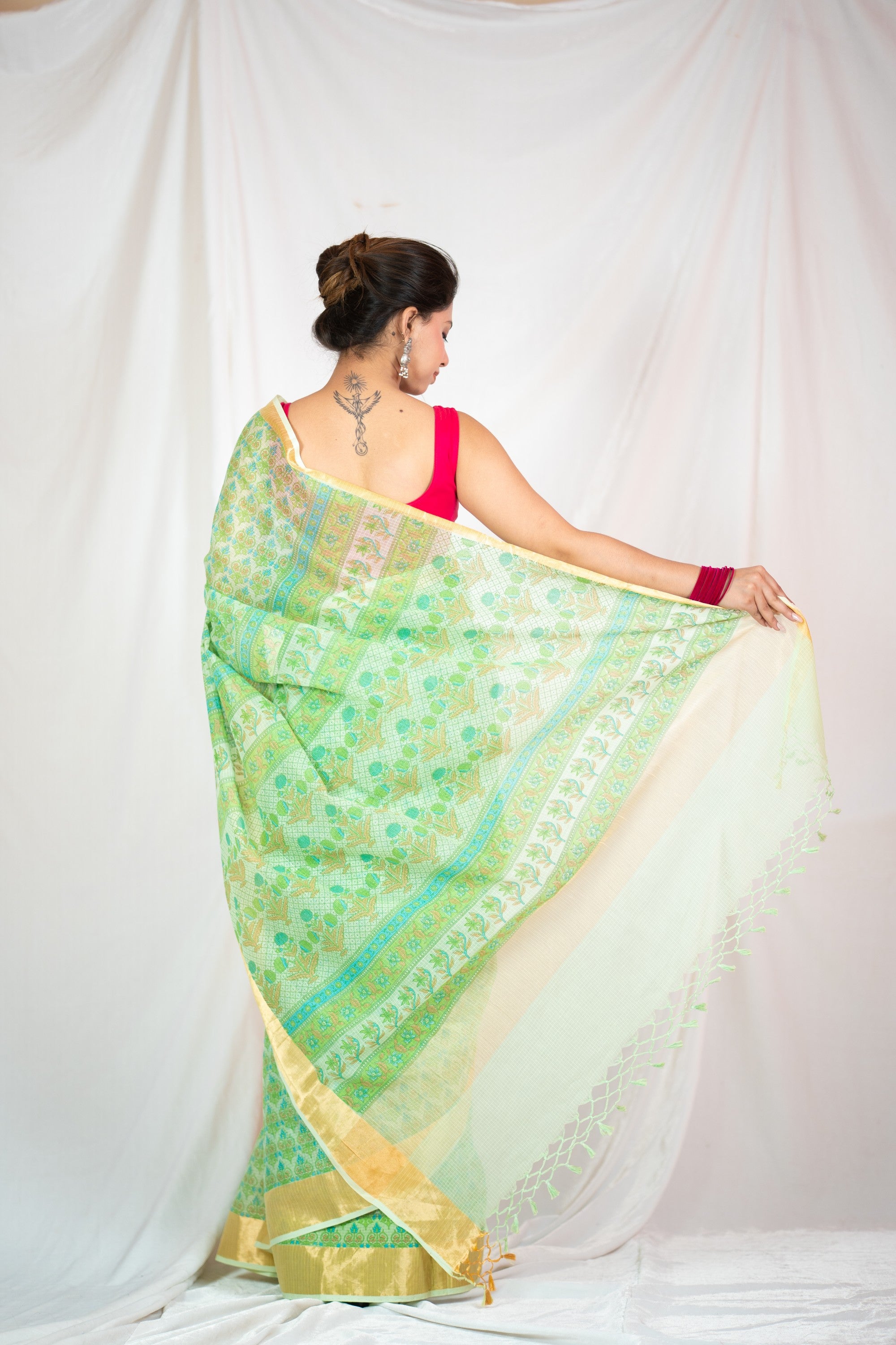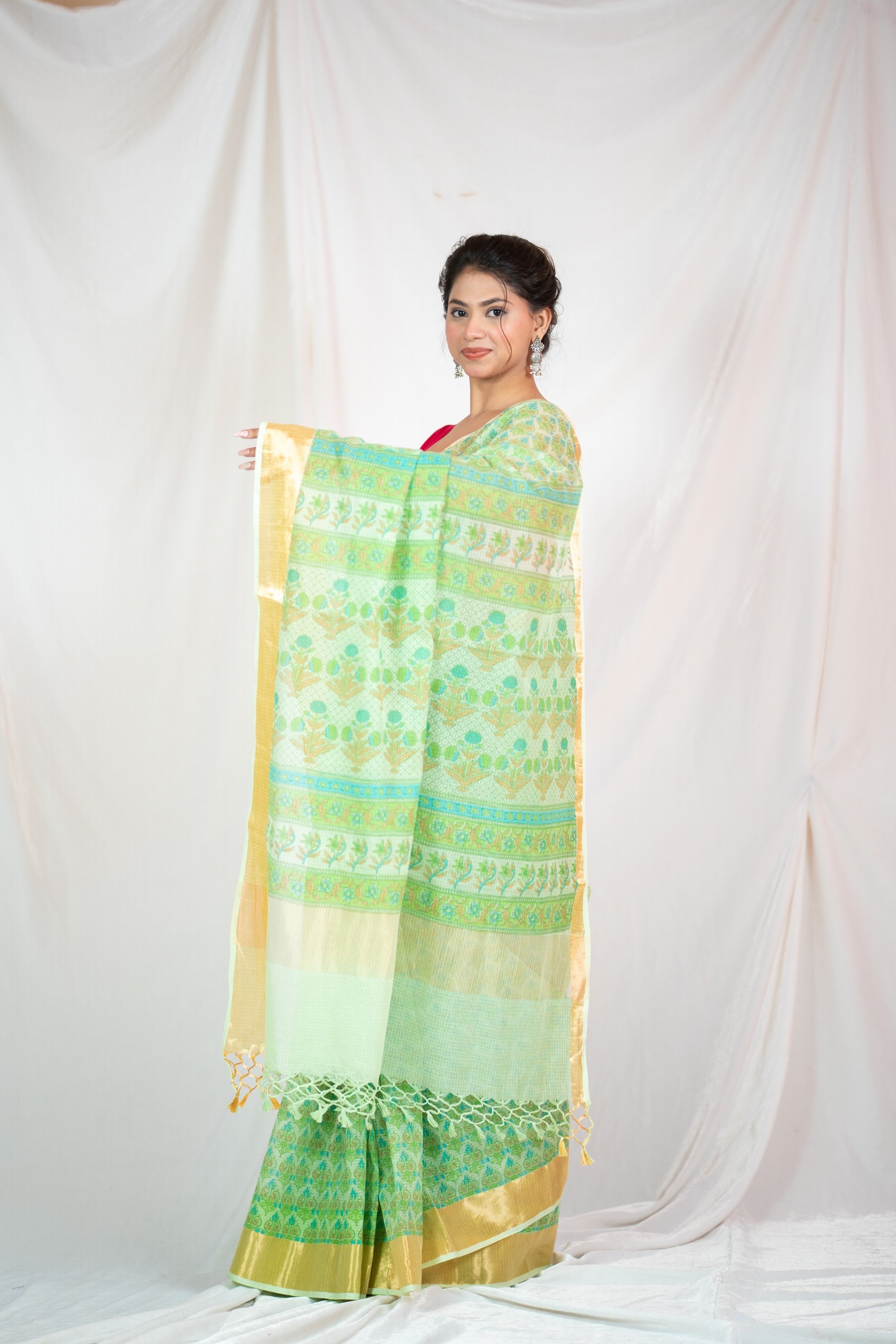 Indulge in the refreshing allure of our Verdant Charm Kota Doria Cotton Saree, a testament to timeless elegance.