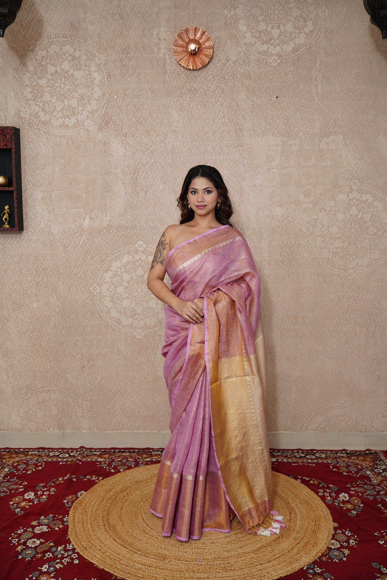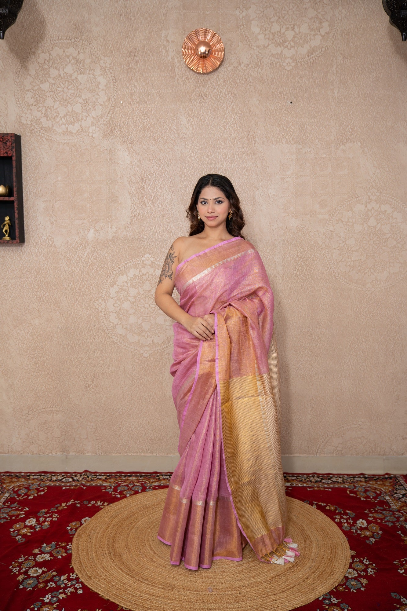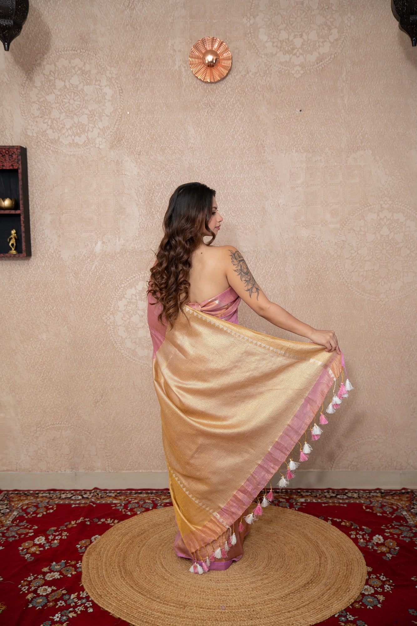 Celebrate the beauty of tradition with Vrinda, a graceful Pink Zari Saree featuring a classic temple border. Part of our exclusive "Sone ki Abha" collection, Vrinda is a tribute to timeless Indian artistry—perfect for weddings, festivals, and elegant daytime events.