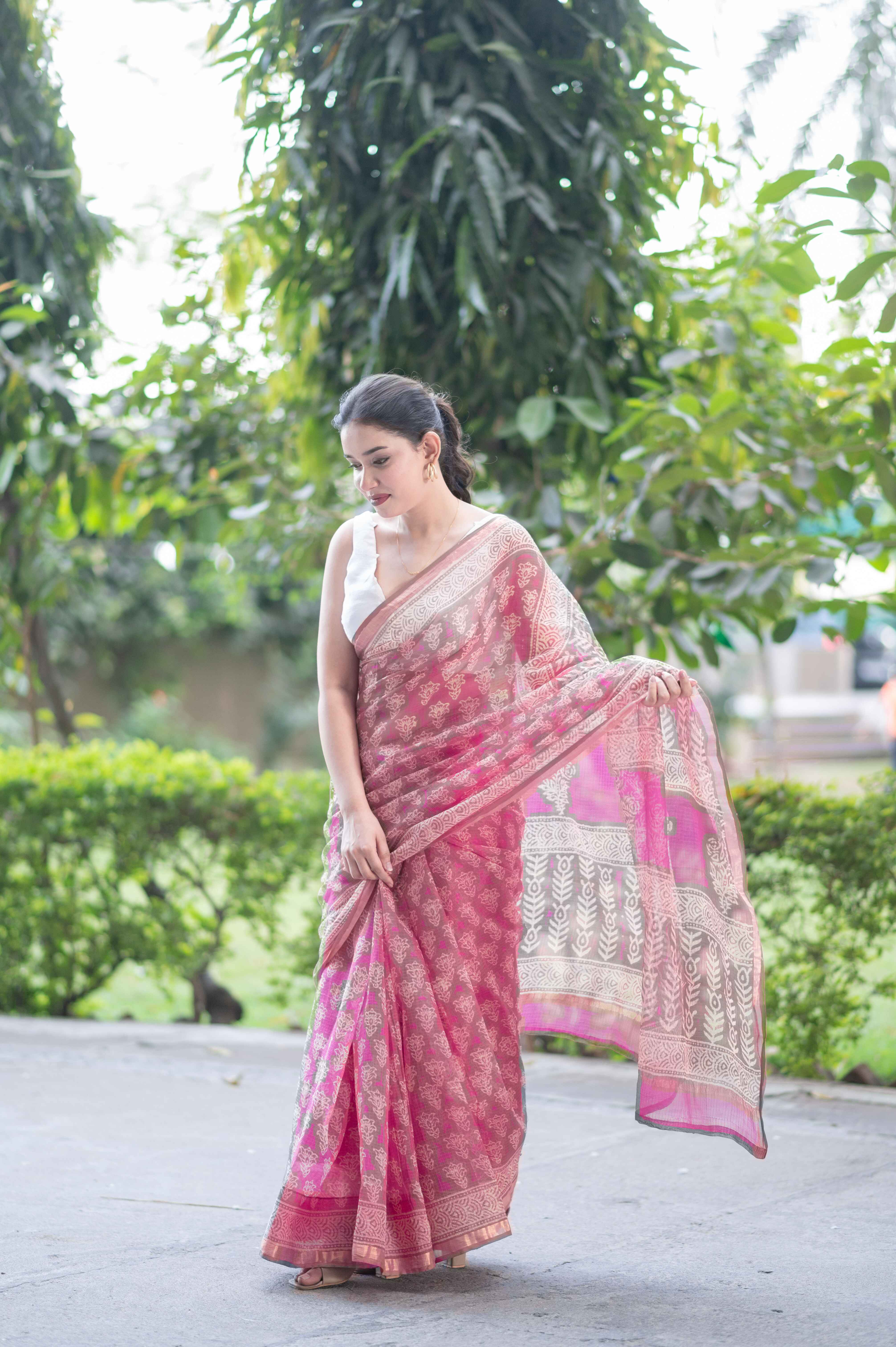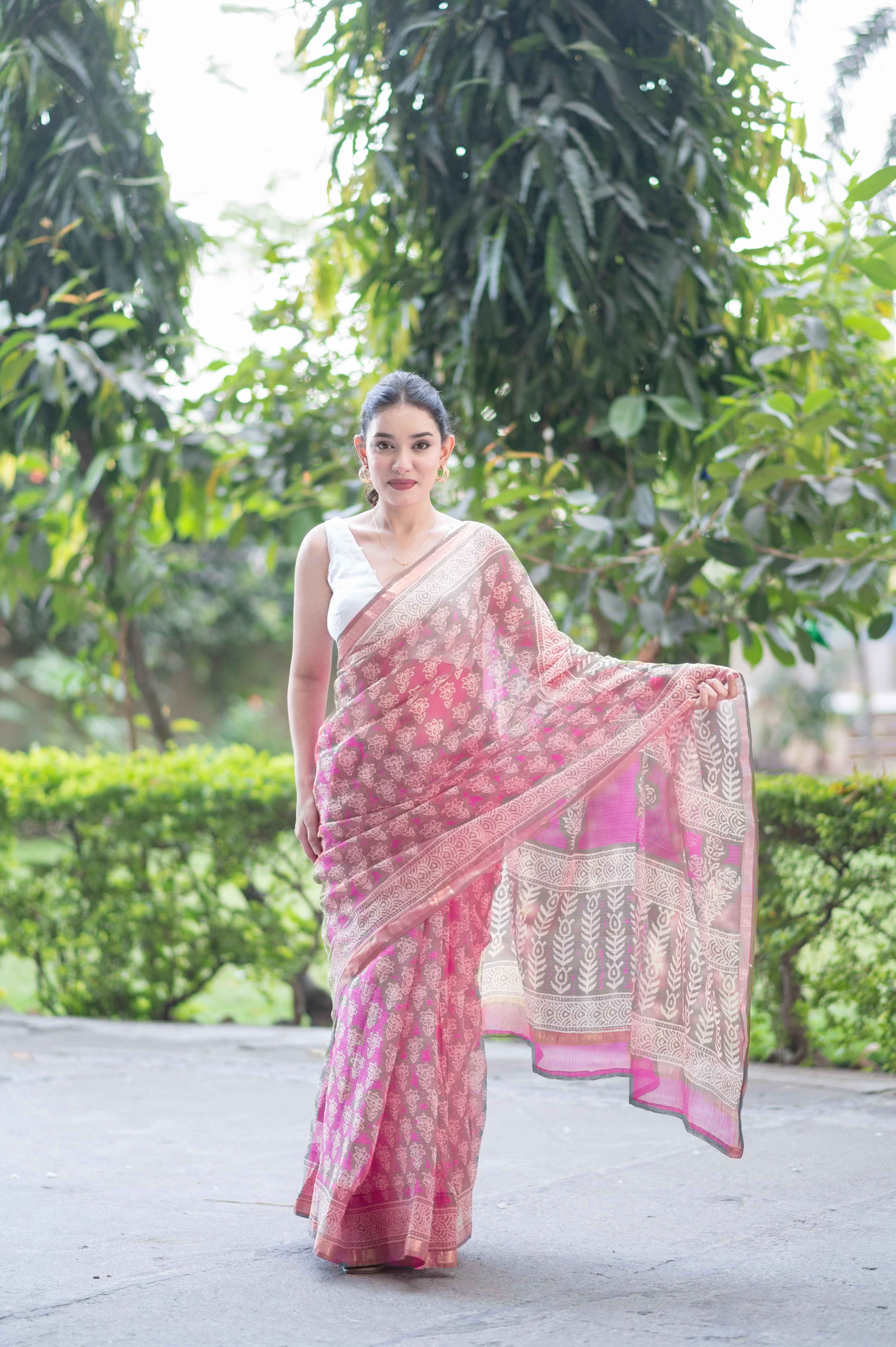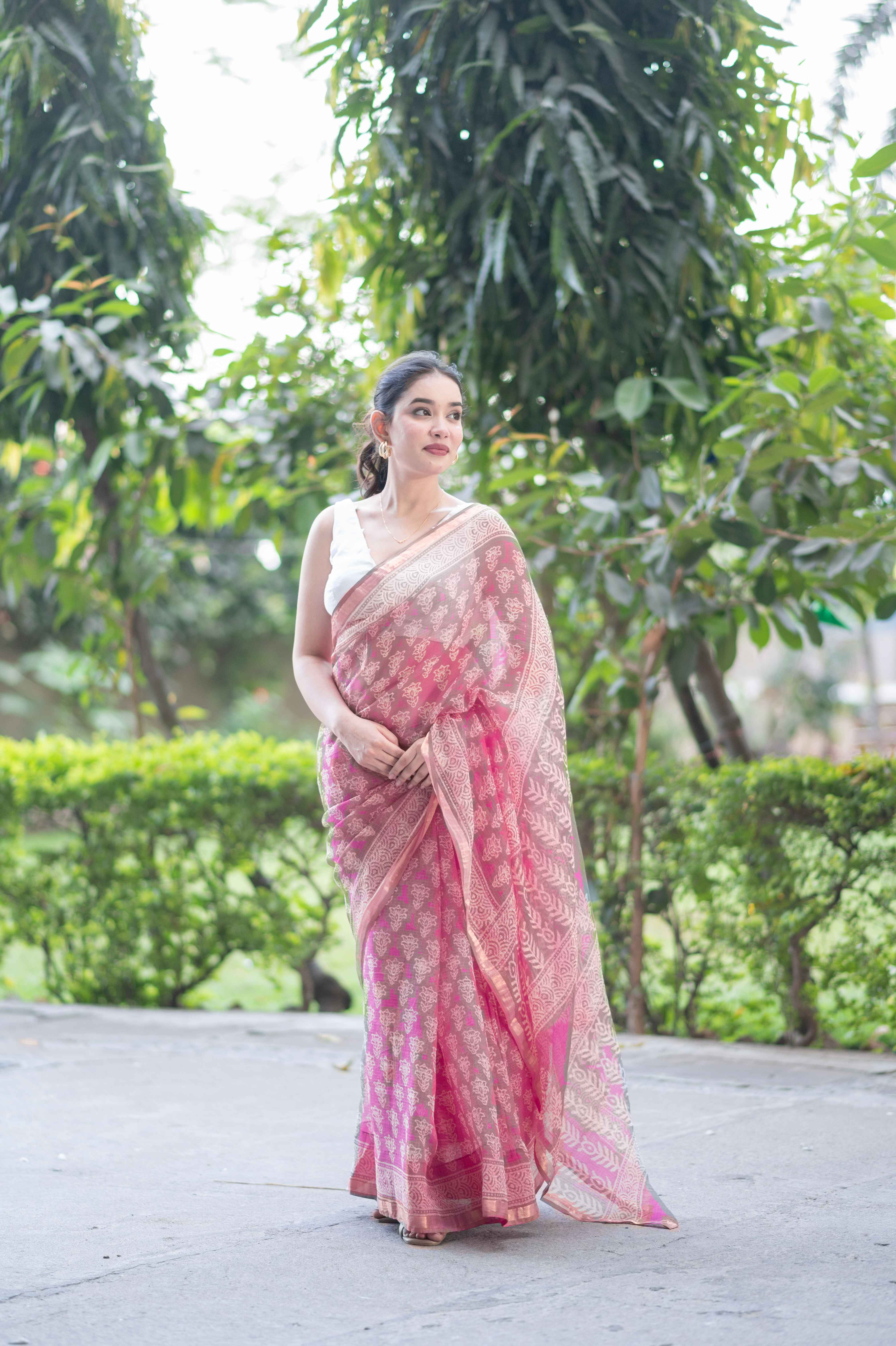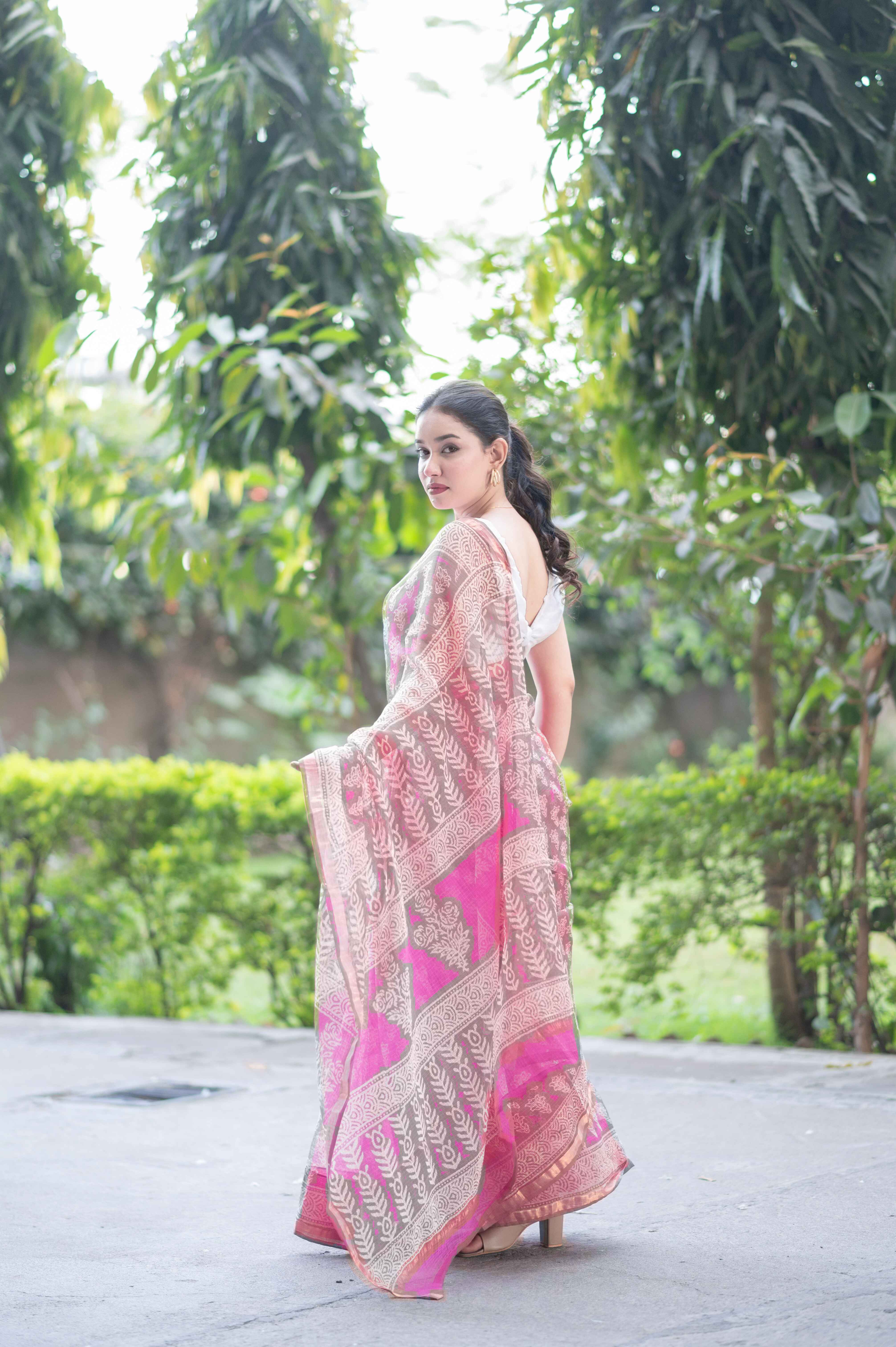 Elevate your style with the exclusive Willow Dream Pink Dabu Kota Doria Saree. Add this timeless piece to your collection today and embrace the elegance it brings to your wardrobe. Shop now and experience the perfect blend of tradition and luxury!