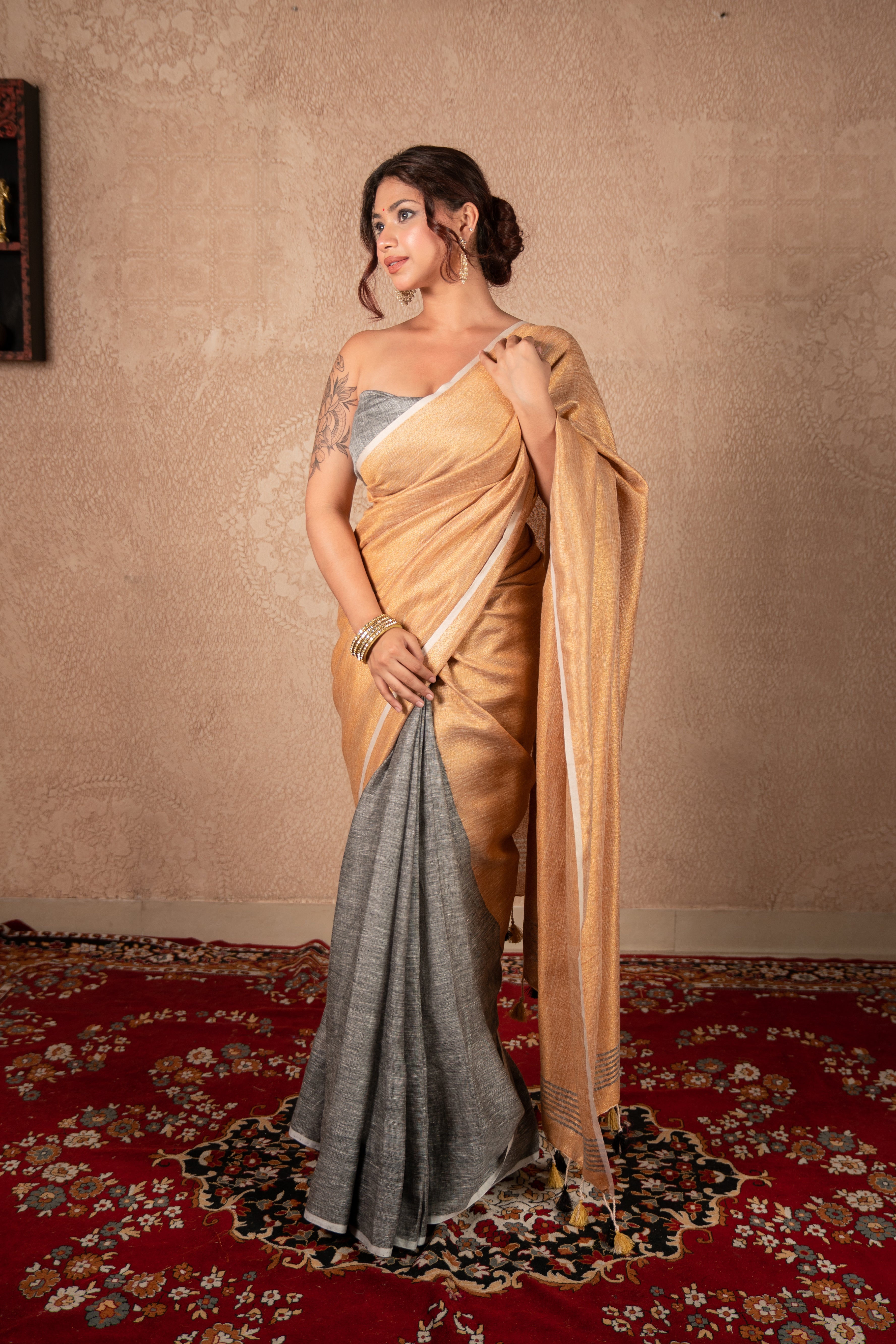 Embrace understated elegance with this Grey Linen Saree, beautifully highlighted by a rich golden pallu. Crafted from breathable linen, this saree offers both comfort and sophistication, making it an excellent choice for festive gatherings, cultural events, or formal occasions.