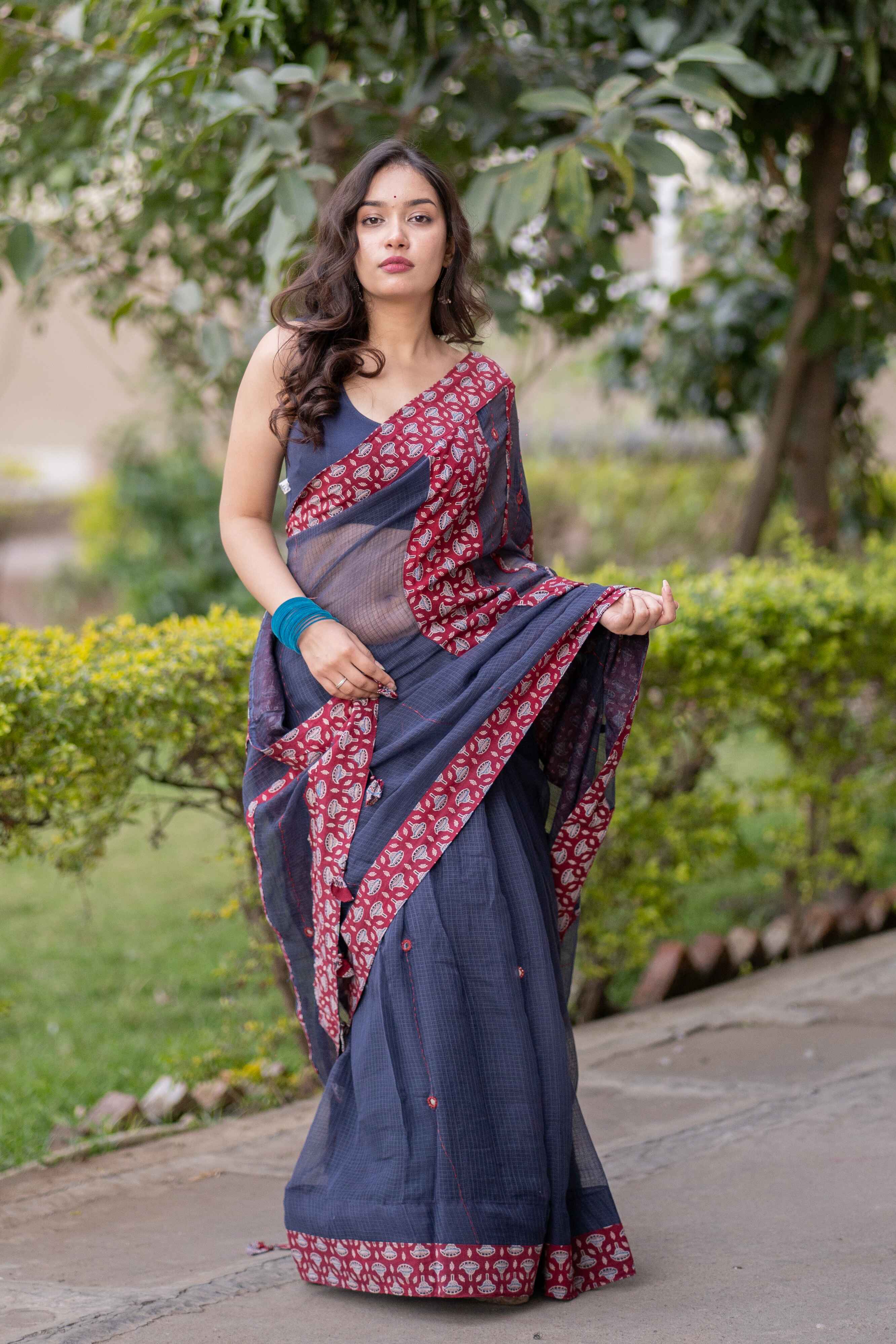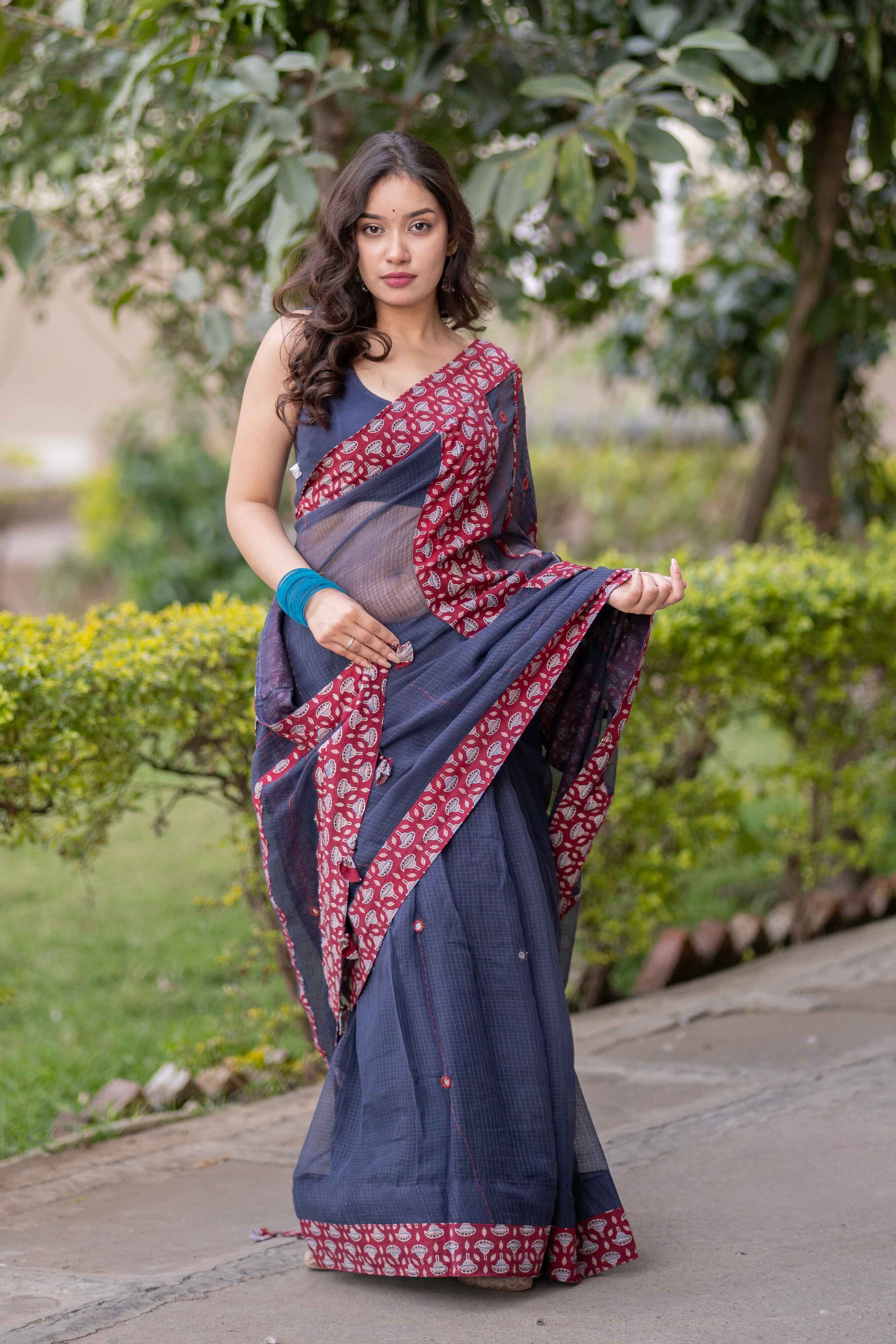 Embrace the beauty of handcrafted traditions with Yogita, an exquisite blue Kota Doria saree adorned with maroon Ajrakh appliqué work. Designed exclusively for our Avyakta collection, this saree blends rich heritage with contemporary sophistication, making it a must-have for saree connoisseurs.