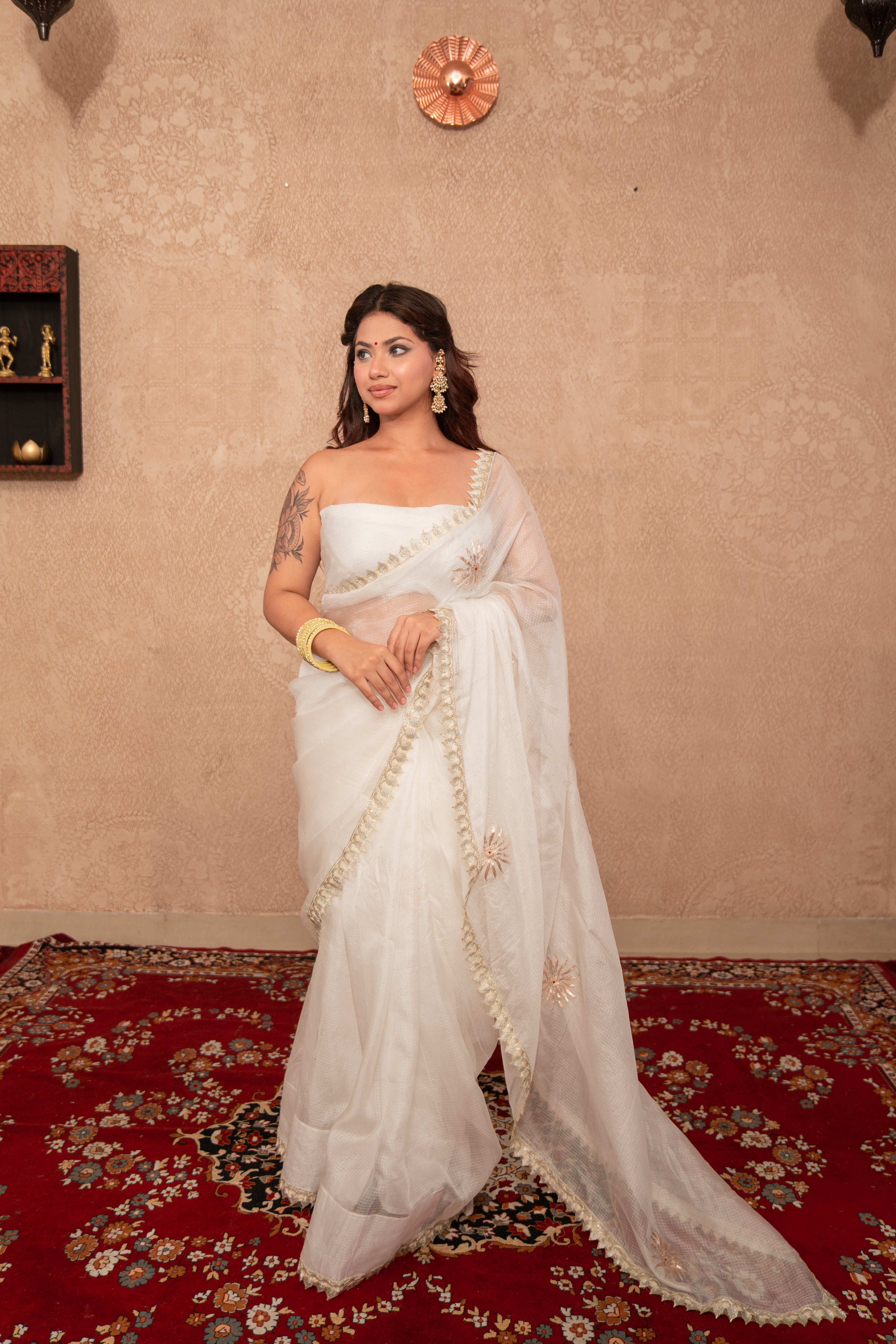 Exude timeless grace with this White Kota Silk Saree adorned with hand pittan buti work and delicate lace all over. Crafted from airy and lightweight Kota Silk, it offers a soft, breathable drape that ensures comfort without compromising elegance. The serene white shade symbolizes purity and sophistication, while the shimmering pittan buti embroidery enhances its festive and regal appeal.